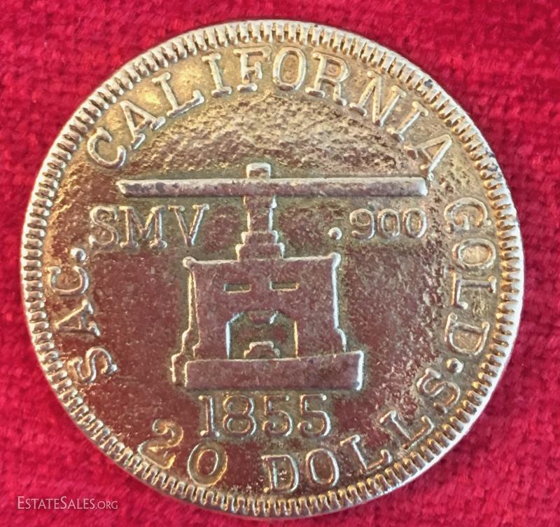 This is a replica coin of a $20 gold piece from the California gold rush days.