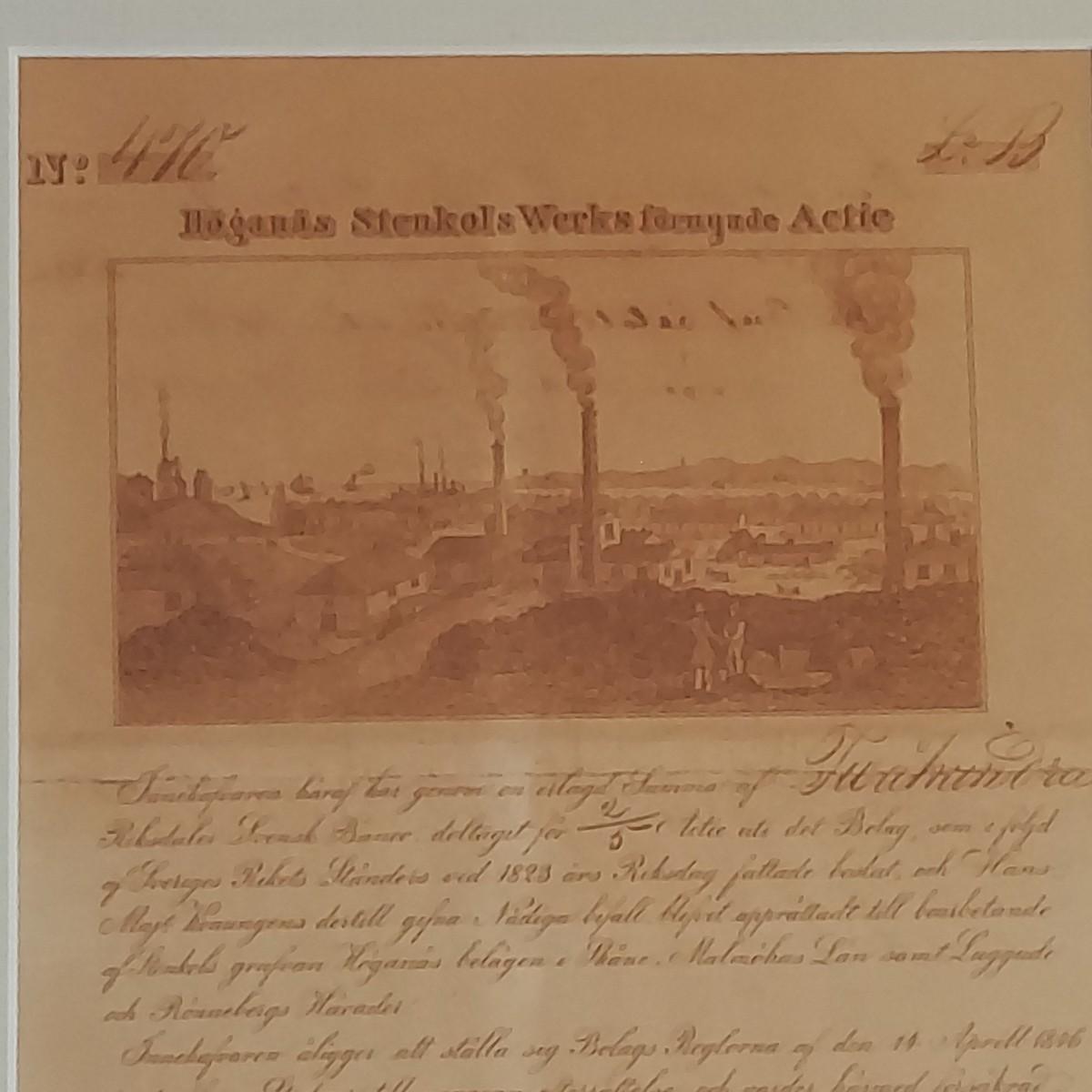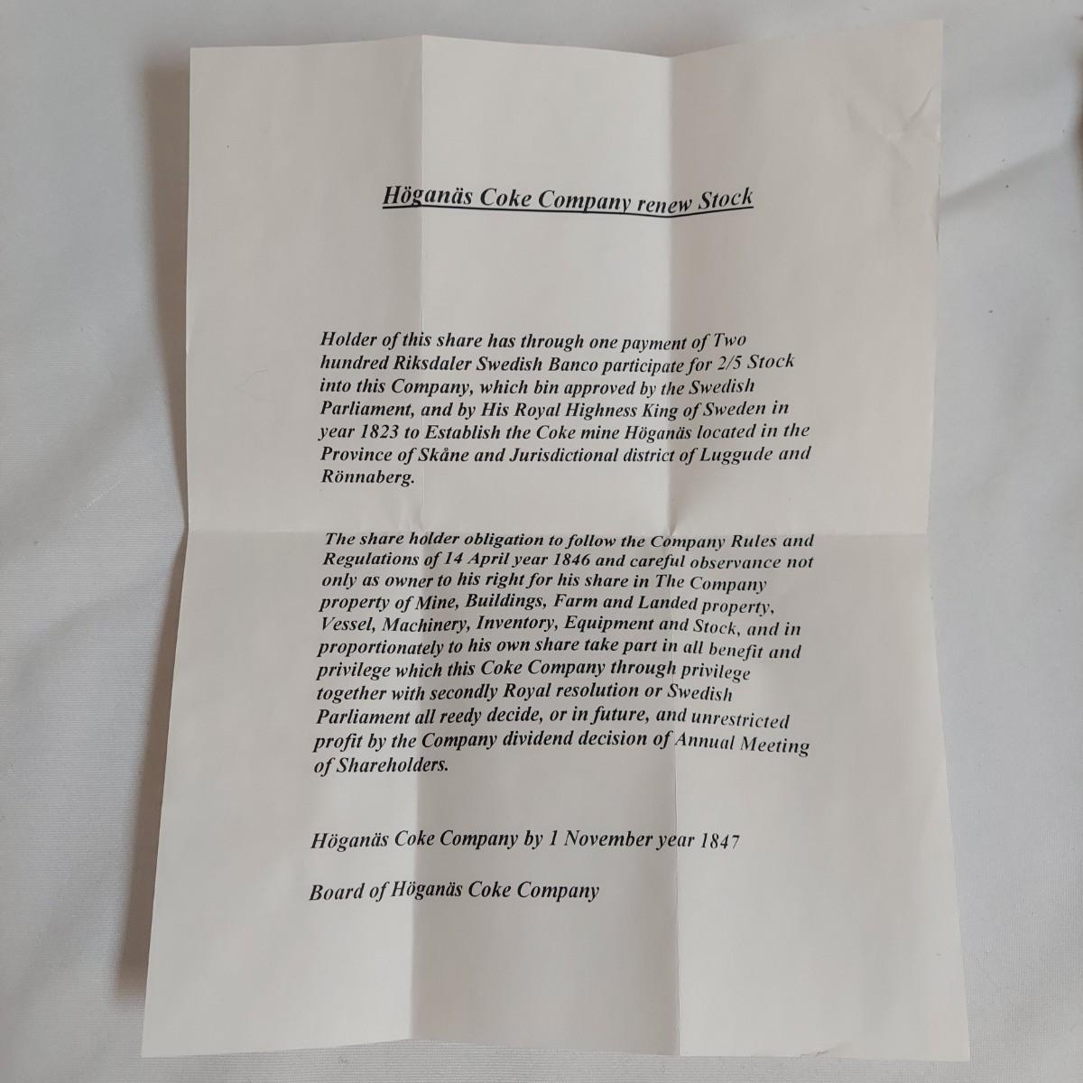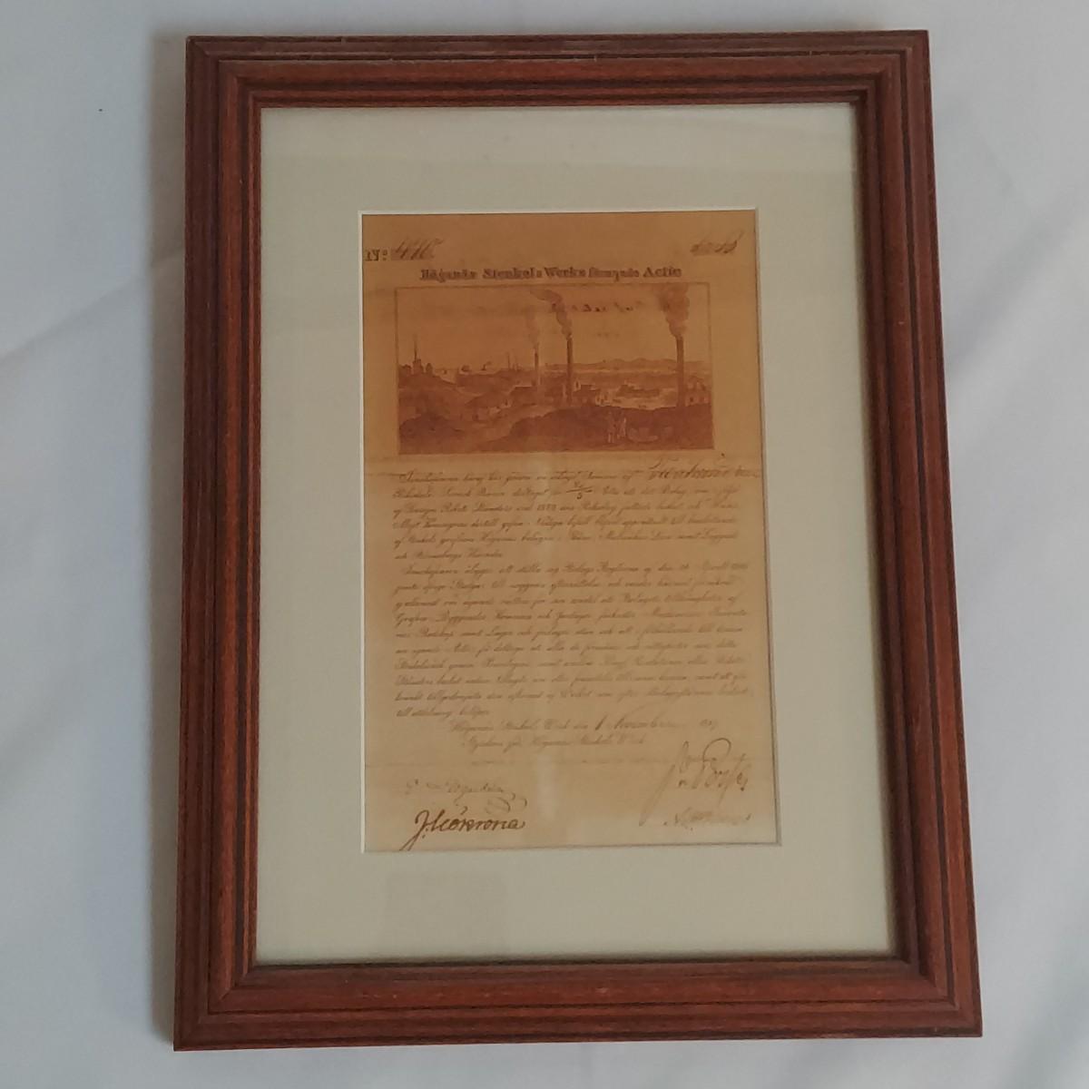 Lot includes a Swedish stock certificate that appears to be a replica. Piece is in a wooden frame, matted under glass. Frame measures 10.5” x 13.5"H. Please see photos for details. Shipping available. Shipping can be costly. We suggest contacting our preferred local shipping provider, Postage Express, with dimensions and getting an estimate before bidding: 828-255-9250 or shipping@postageexpressnc.com