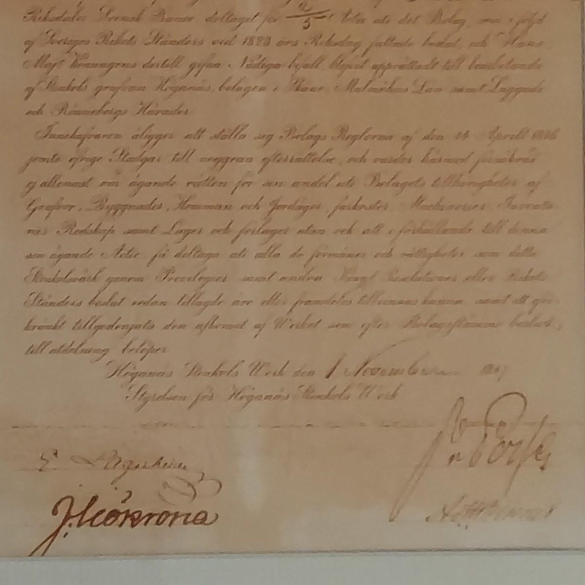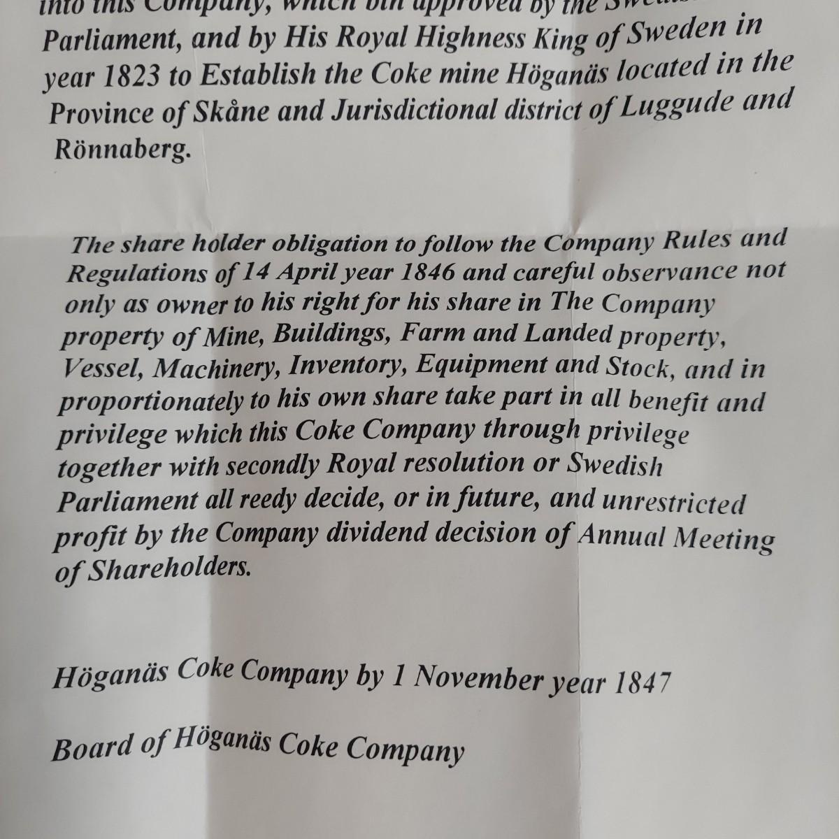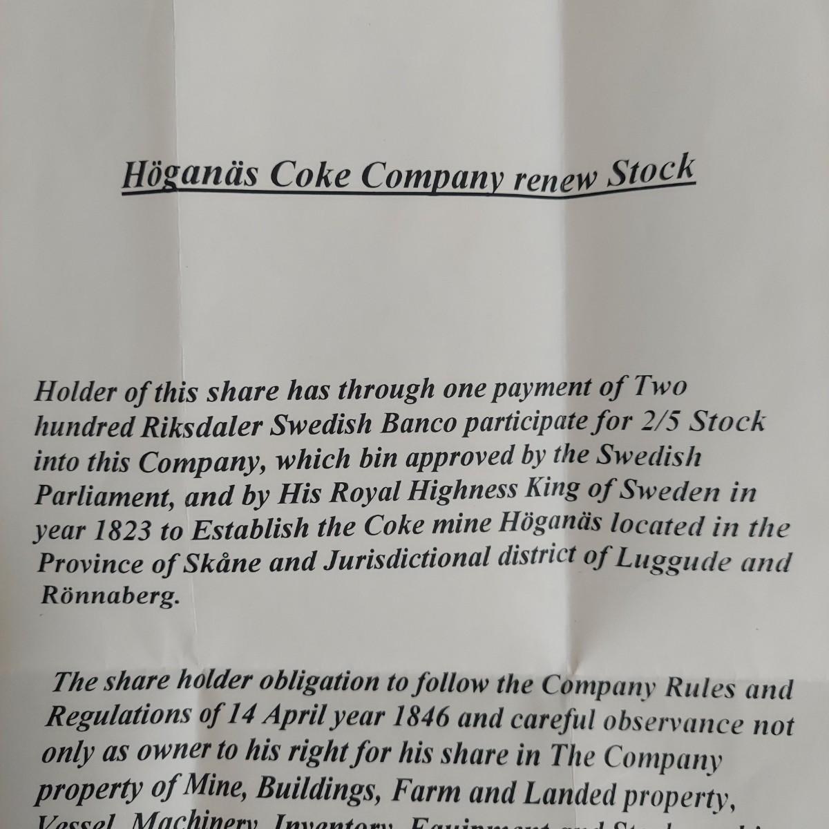 Lot includes a Swedish stock certificate that appears to be a replica. Piece is in a wooden frame, matted under glass. Frame measures 10.5” x 13.5"H. Please see photos for details. Shipping available. Shipping can be costly. We suggest contacting our preferred local shipping provider, Postage Express, with dimensions and getting an estimate before bidding: 828-255-9250 or shipping@postageexpressnc.com