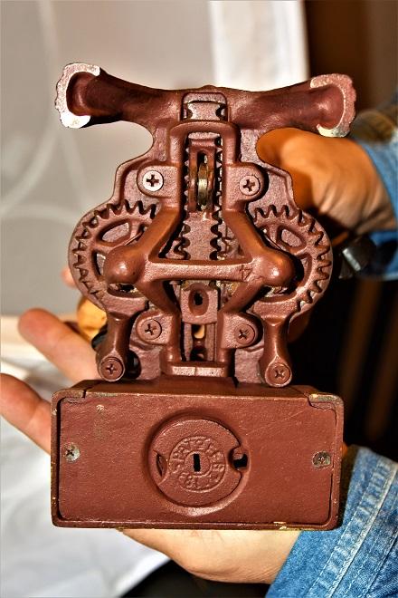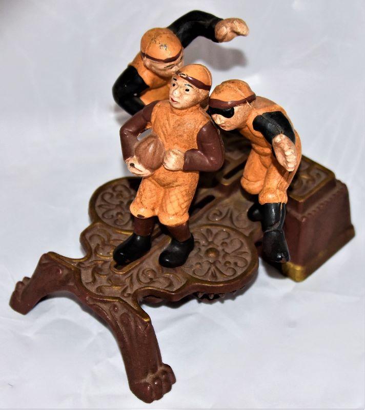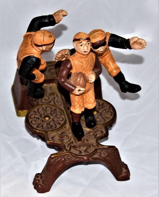 Replica Vintage Cast-Iron Mechanical Bank (3 Football Players): Constructed from cast metal depicting three football players that move with springs and gears below the base plate.