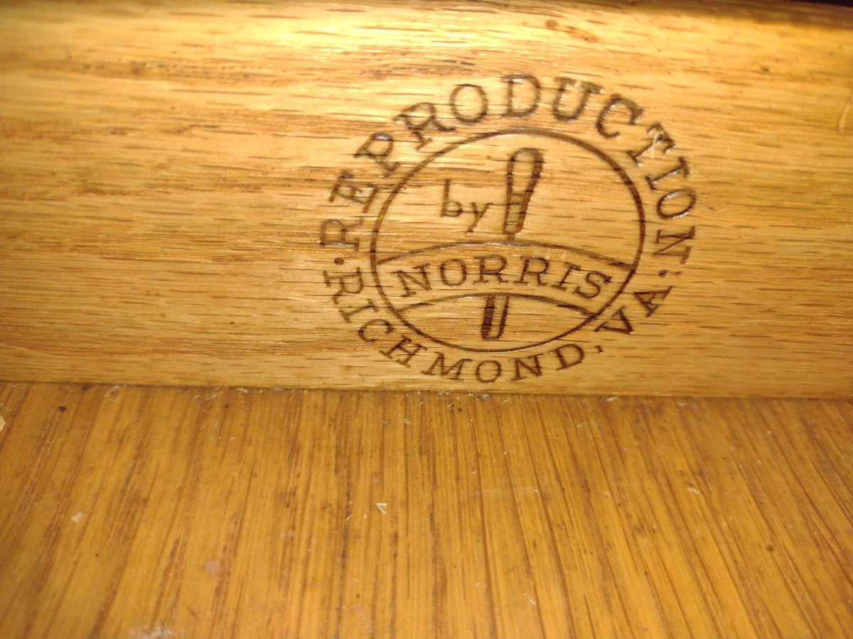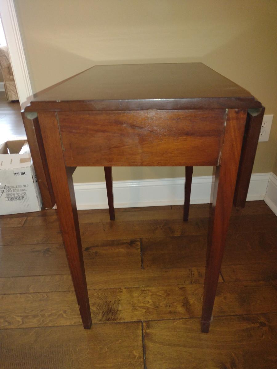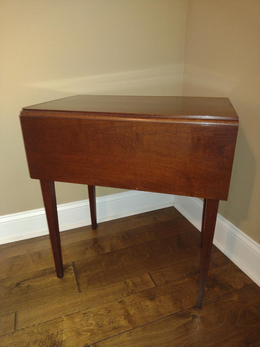 Reproduction by Norris (Richmond, VA) Double Drop Leaf Wooden Table with Drawer. Approx 24" deep. 31" wide with both leaves up, 16 1/2" with leaves down.