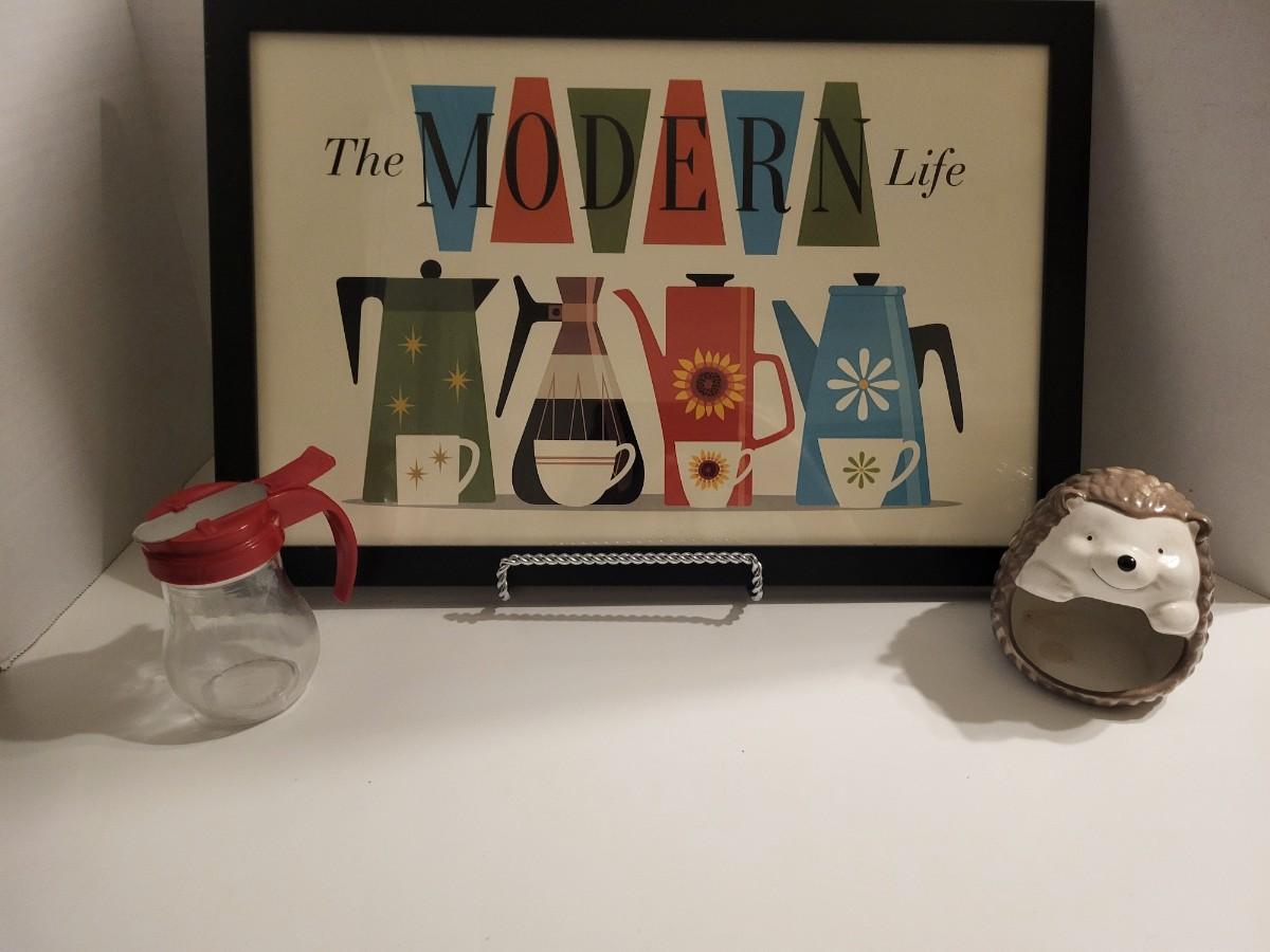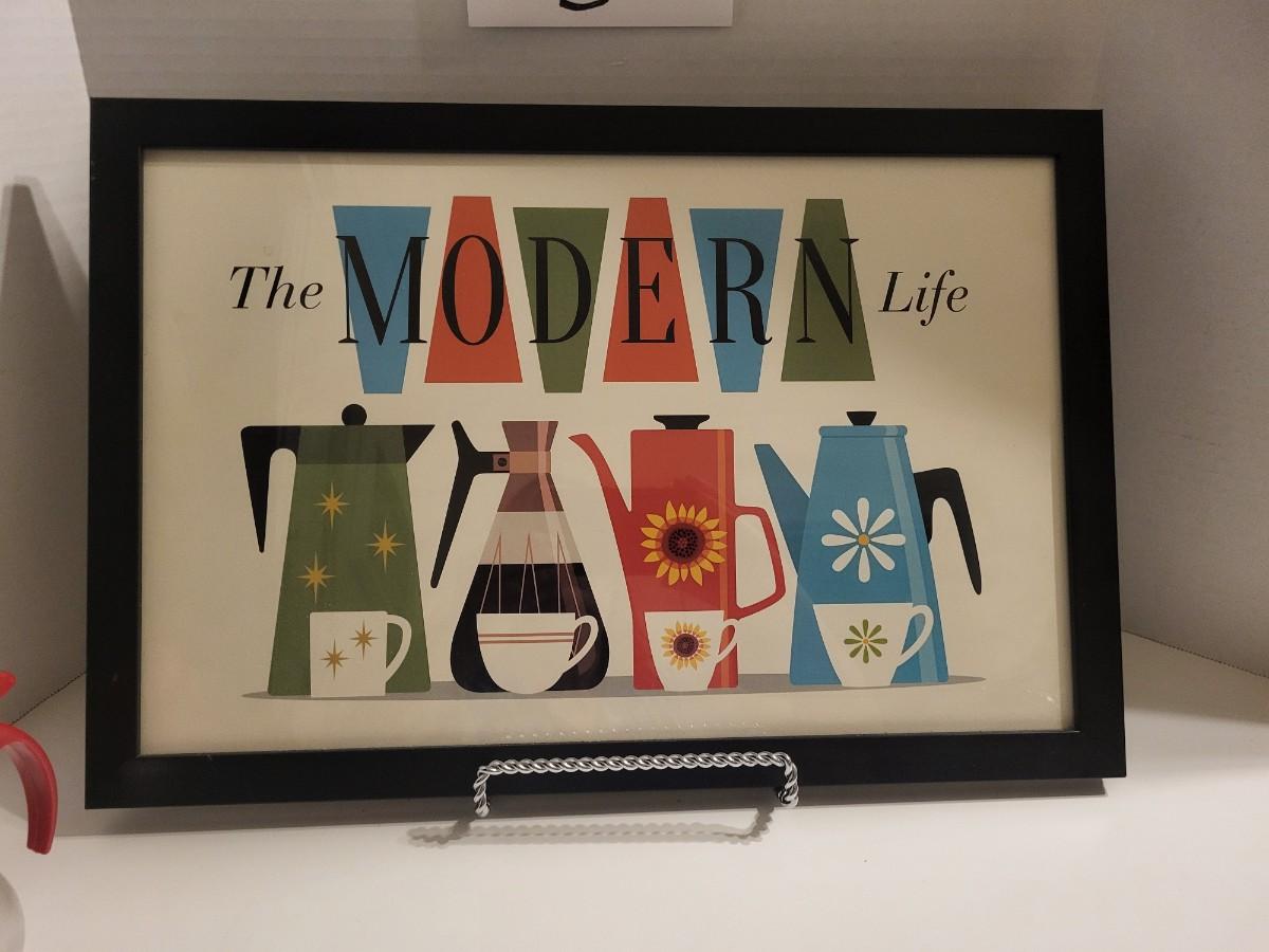 REPRODUCTION MODERN LIFE PICTURE, SYRUP CONTAINER AND SPONGE HOLDER