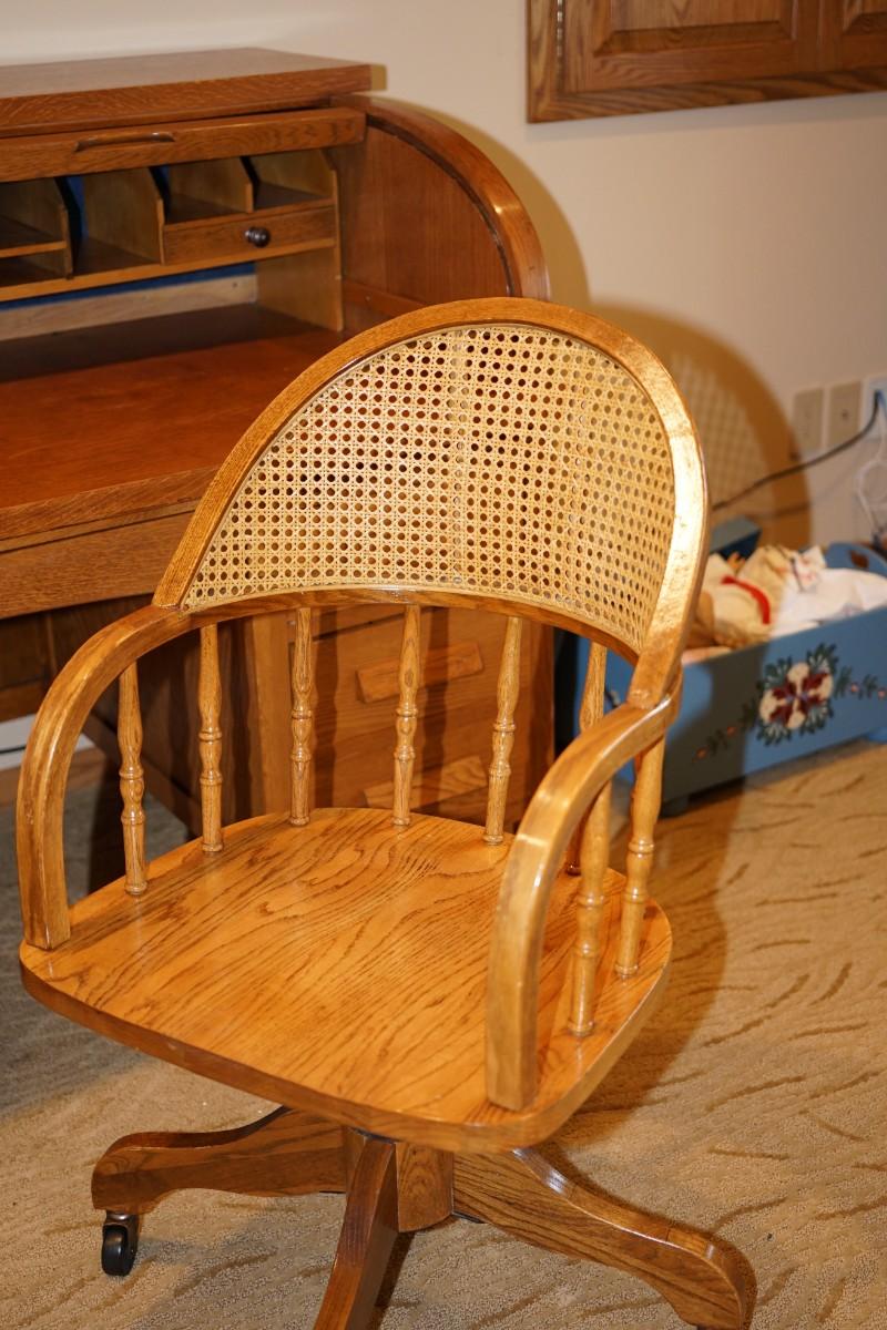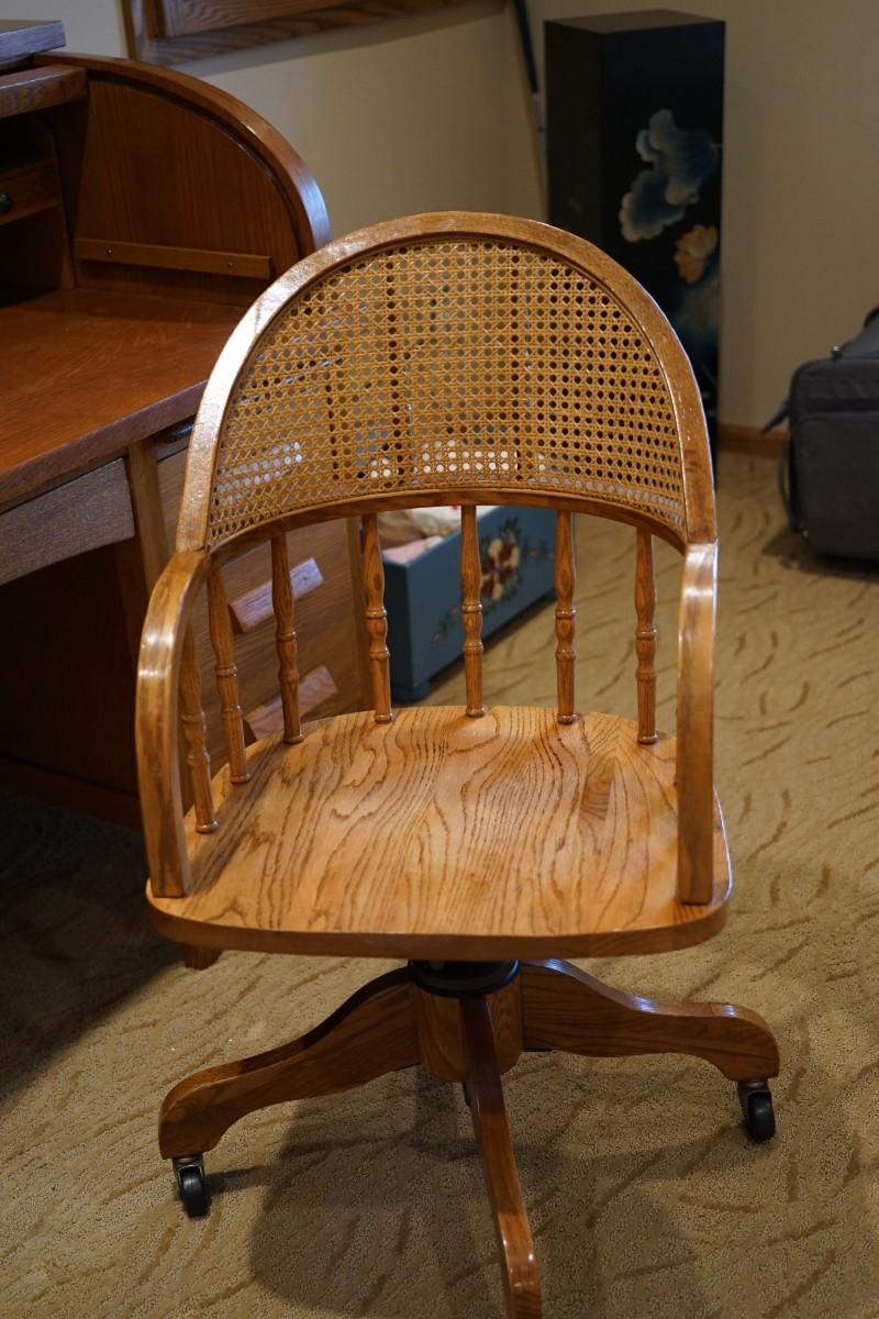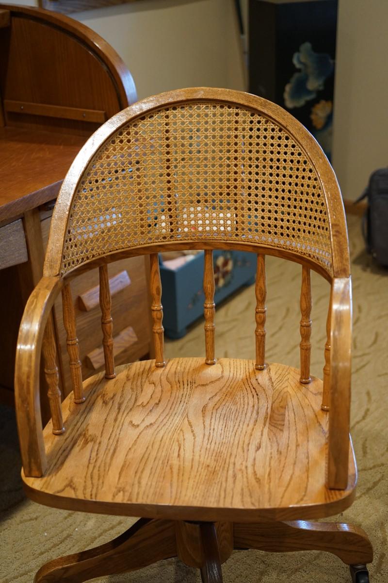 REPRODUCTION OAK ANTIQUE OFFICE CHAIR W/ SWIVEL BASE/ SPINDLE AND CANED BACK