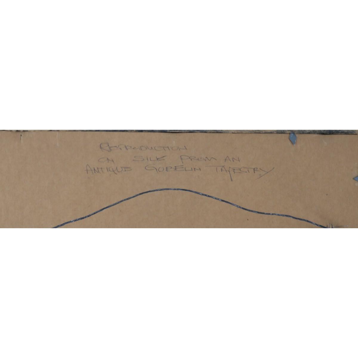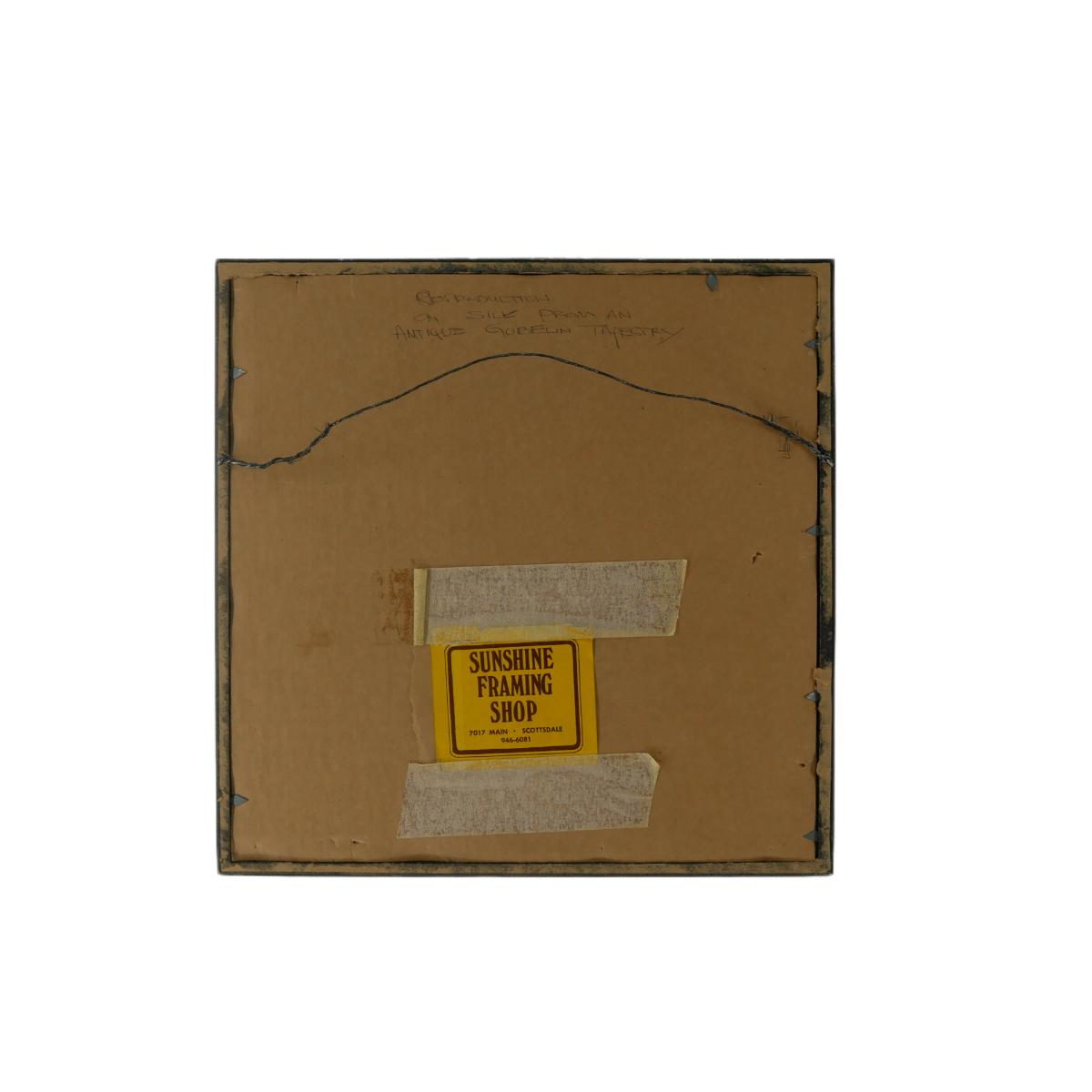 Reproduction on silk fom an antique gobelin tapestry. Depicts two men and one woman with pipe organ. Framed and matted. Art is in great condition. Art measures 6" x 6", total frame measures 11.75" x 11.75" x 0.5". (A21)
