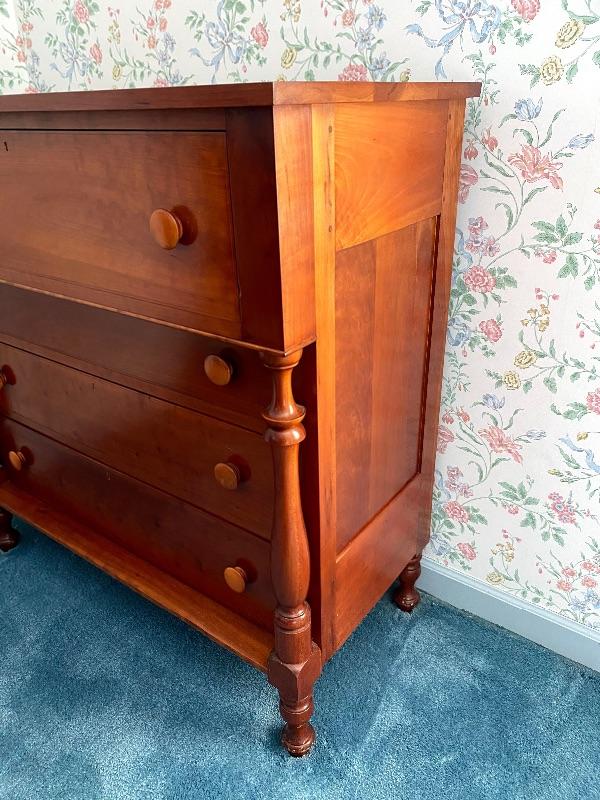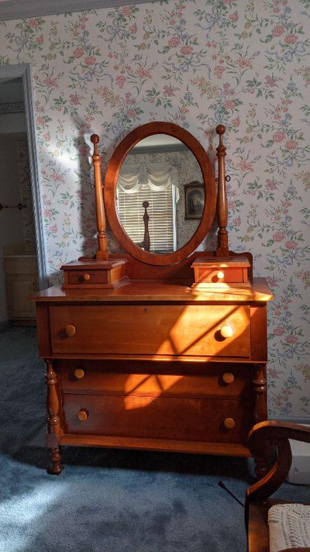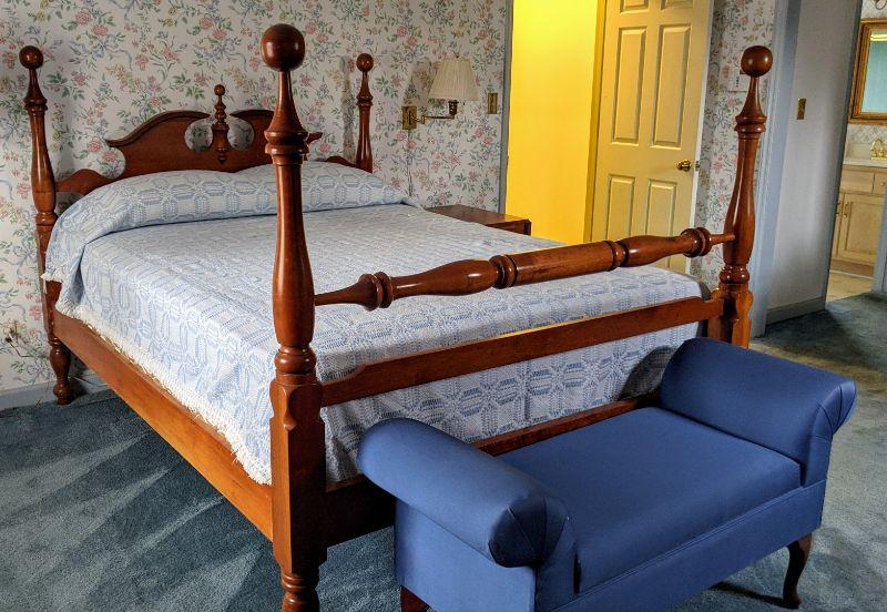 Solid Cherry Bedroom Suite includes full-size cannonball poster bed, chest of drawers, dresser/mirror and night stand. Bench is not included and must be purchased separately. Mattress, box spring & bedding included free.