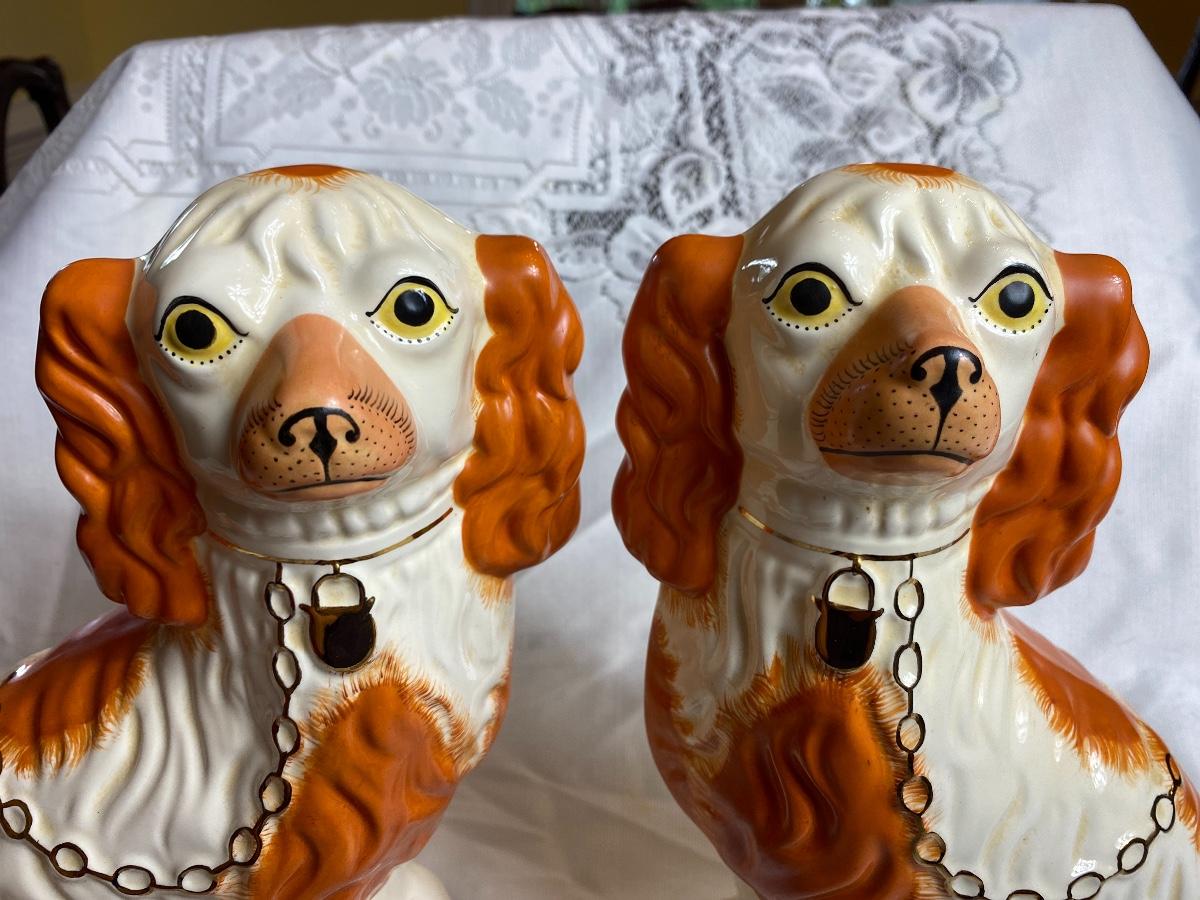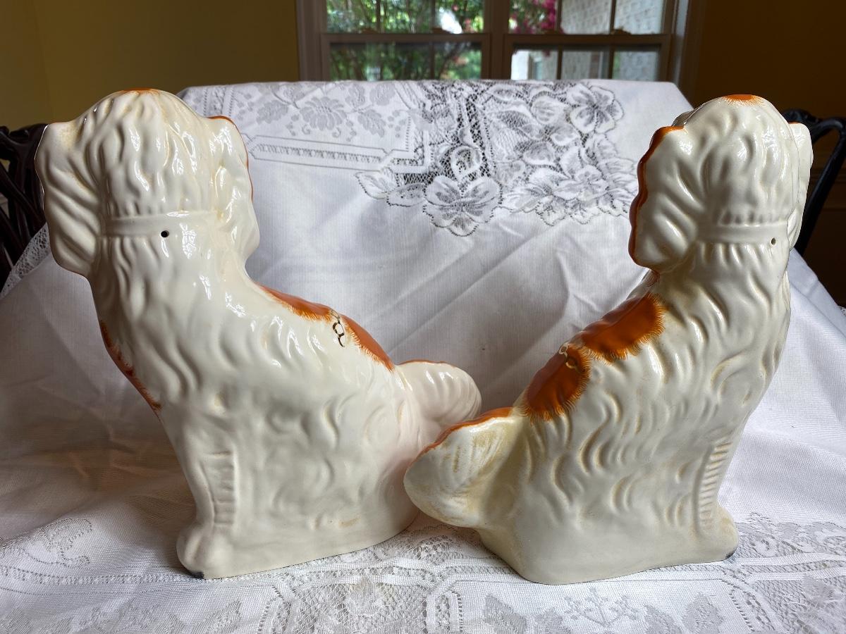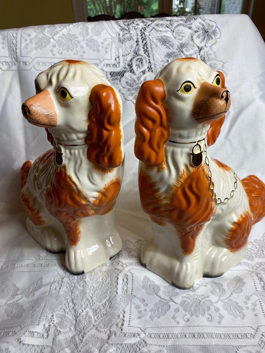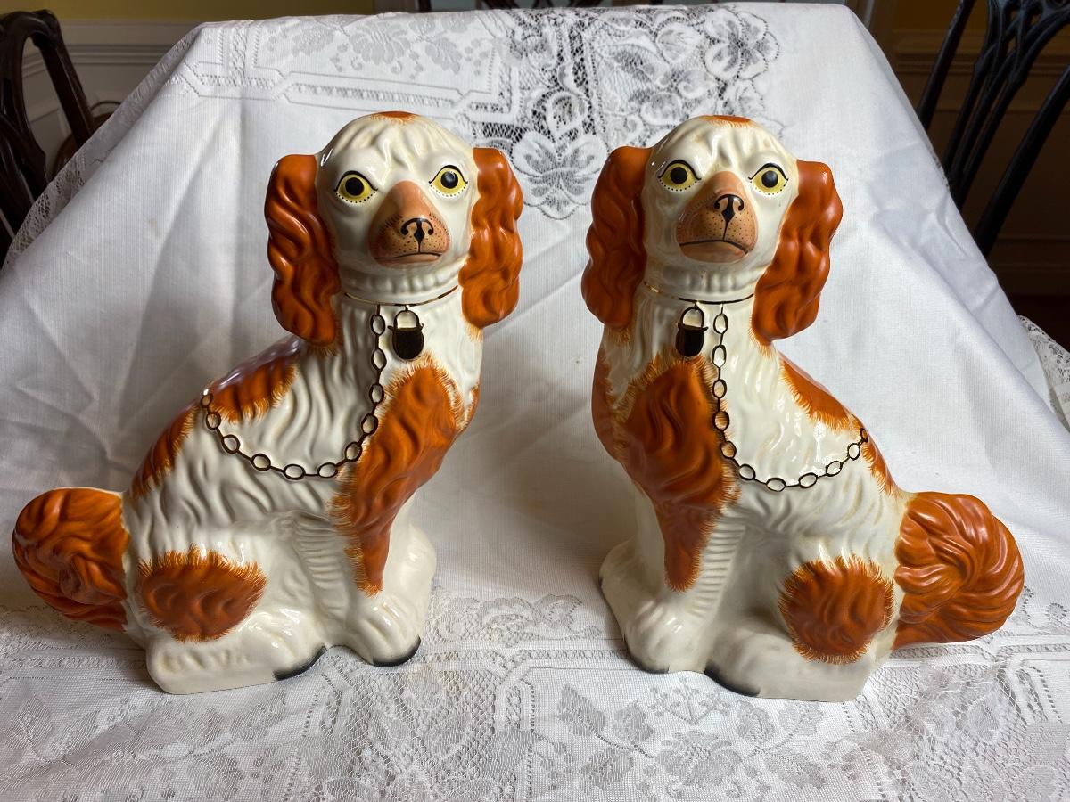 12 1/2” tall Staf Fisher Reproduction Staffordshire Spaniel Dogs. Very good to excellent condition. Orange rust color