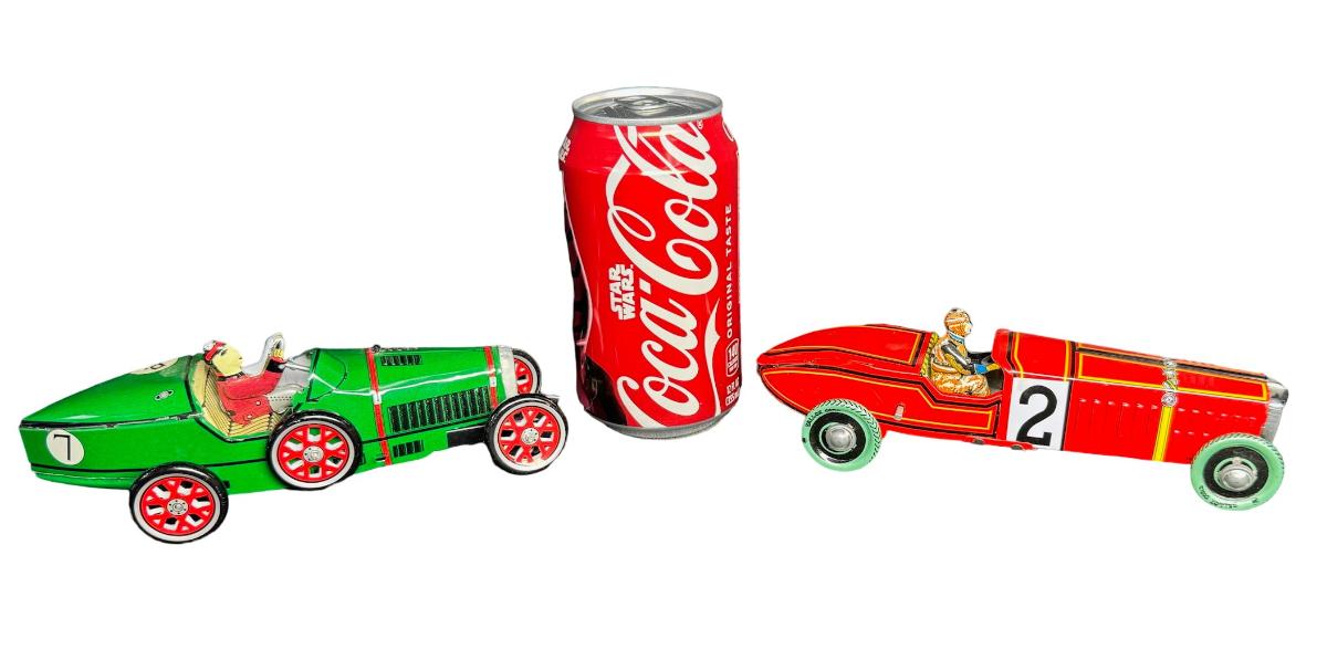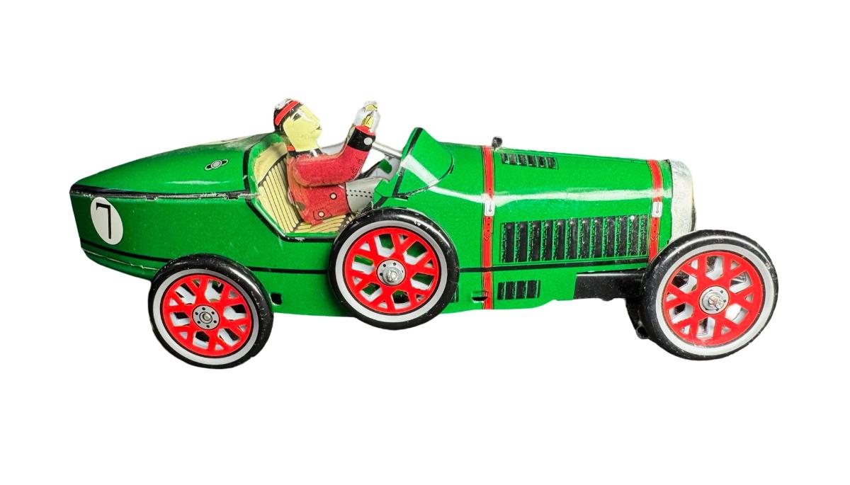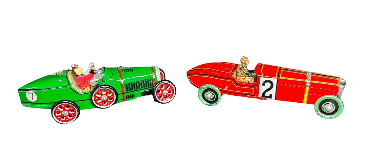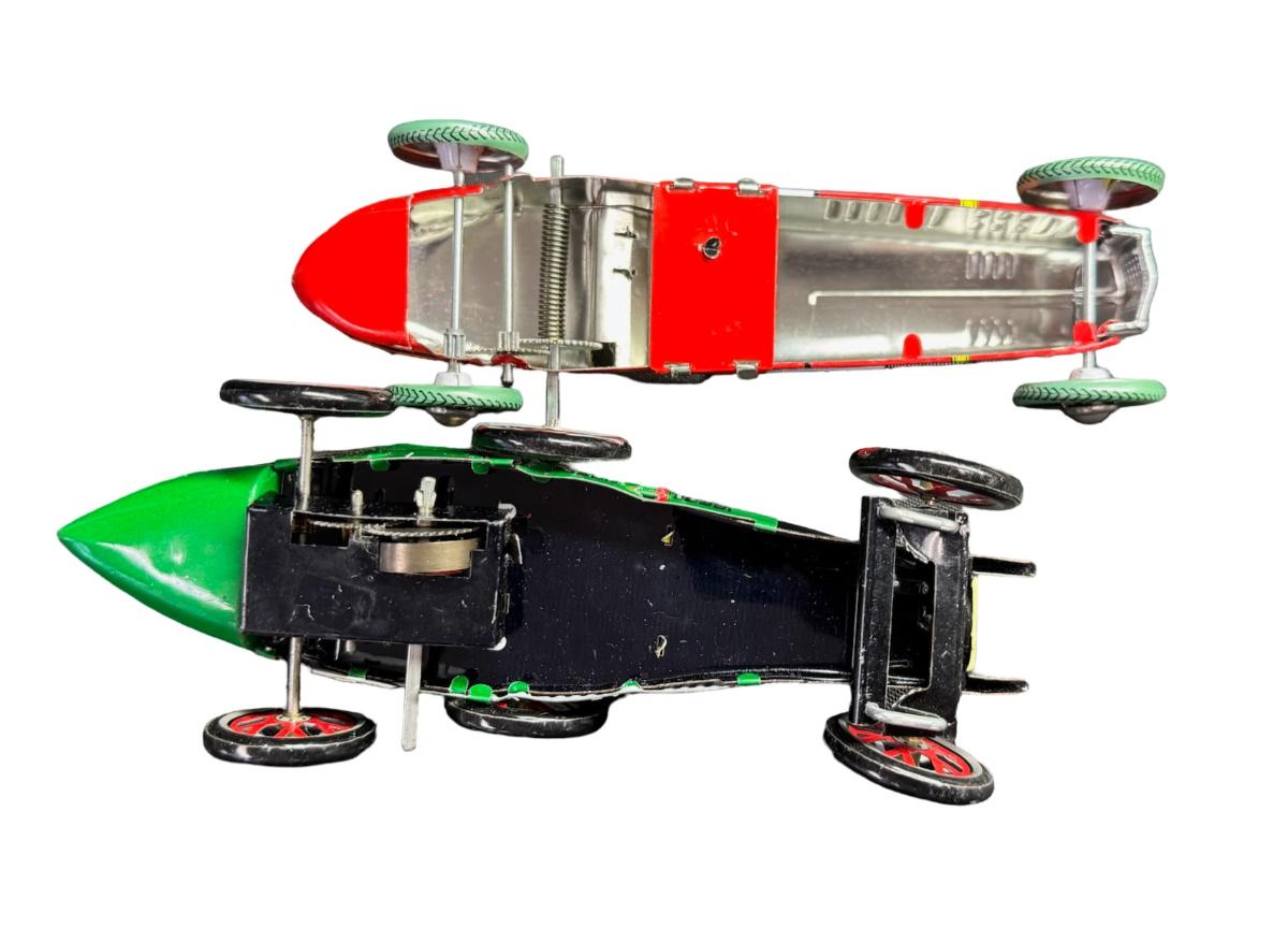 Includes a Paya of Spain Bugatti, and a Paya tin toy racer. Both have little to no wear. No keys. Measurement of longest: 7.75”L. [JL]