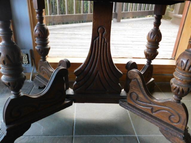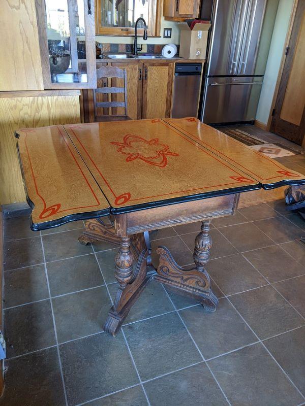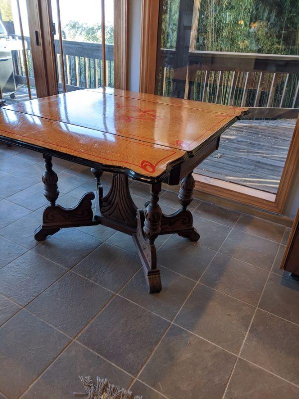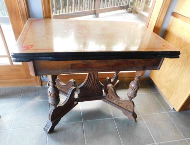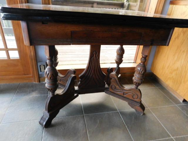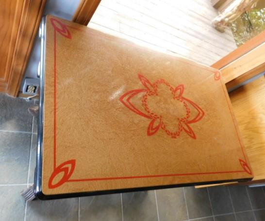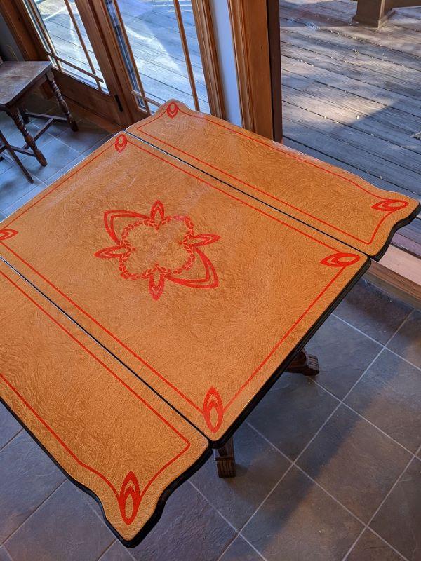 Repurposed Eastlake Walnut Base with Vintage Enamel Slide Out Table Top 40"x25"x31" this table was given new life and mixed Eastlake Victorian with MCM and produced a beautiful durable table. This can be said to be genuinely a one of a kind gem.