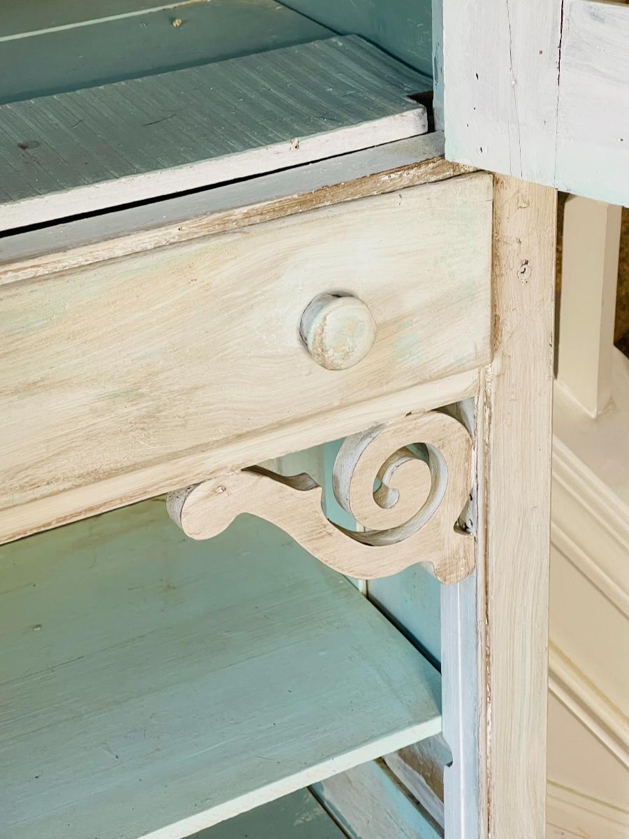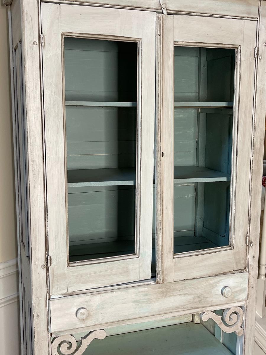 Adorable for displaying anything. Keep in mind this piece is a little fragile. Needs a little TLC. Top doors do not close properly. Owner kept them open. Can be easily removed if needed. 72” H x 32 1/2” W x 17” D
