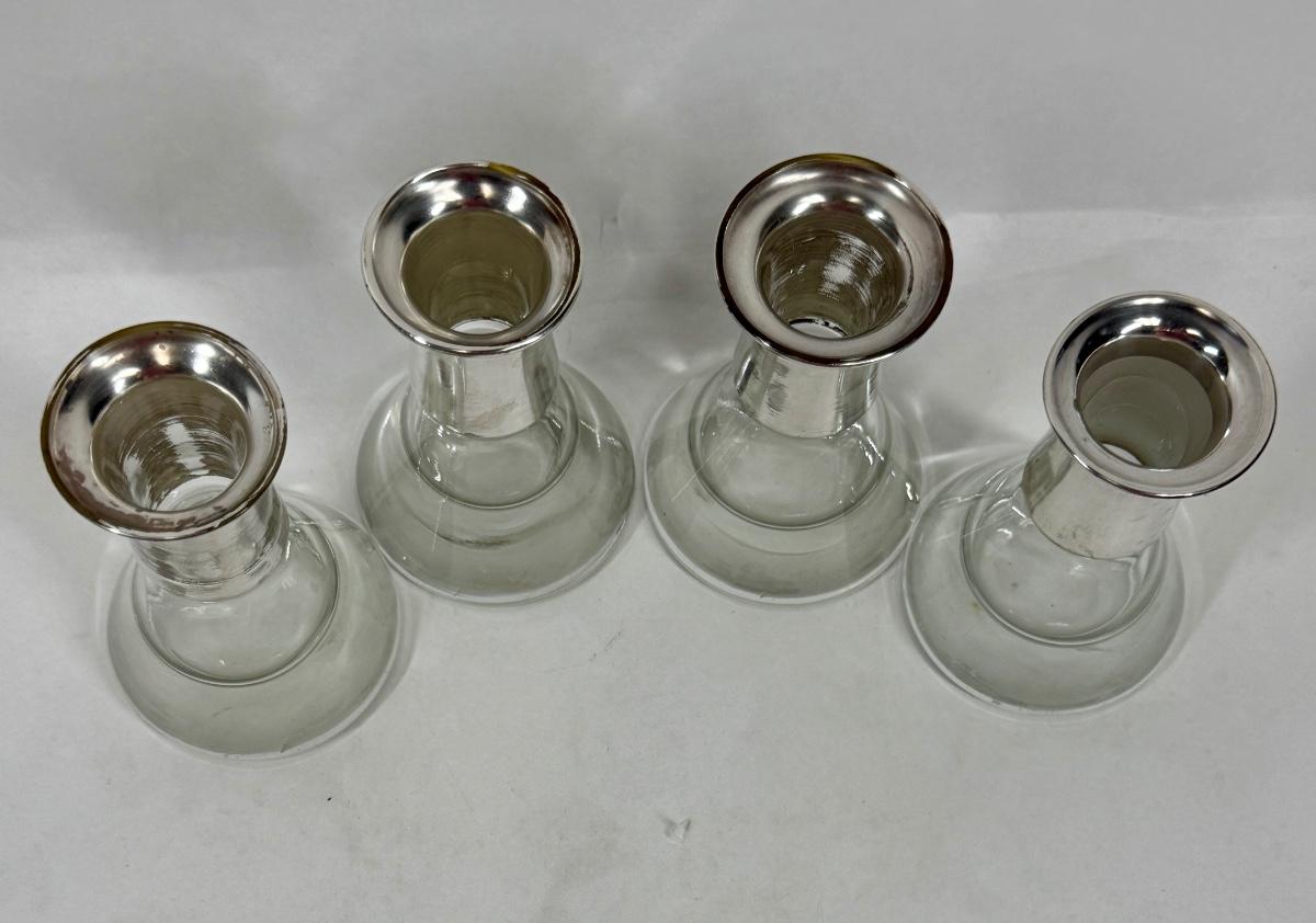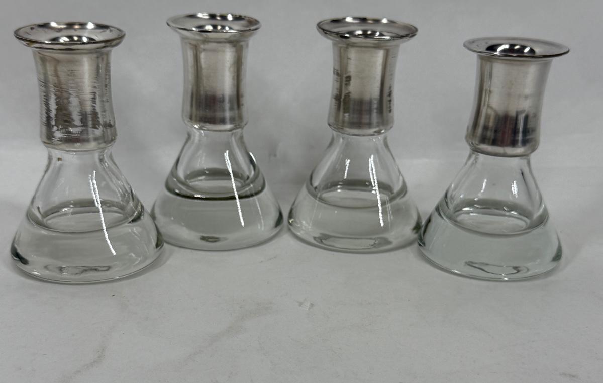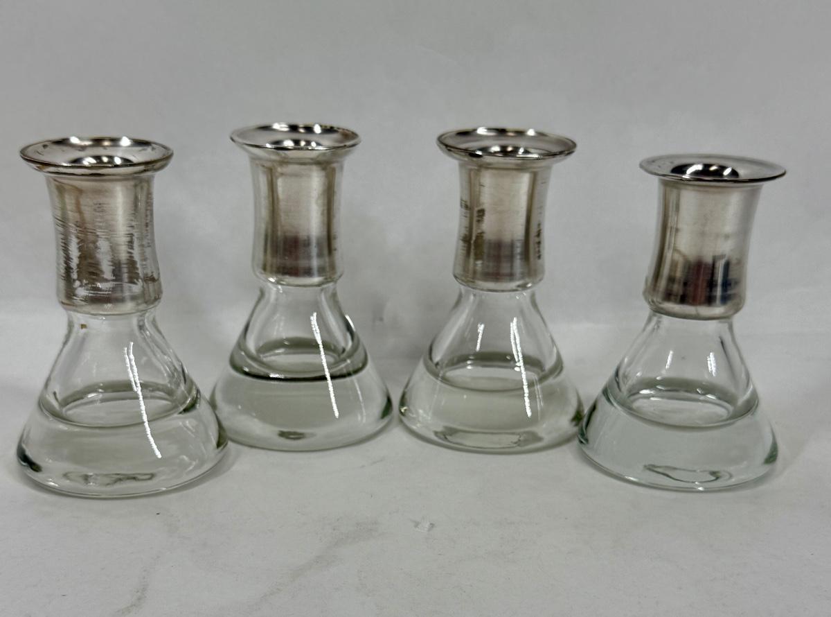 Set of 4, excellent condition. Elegant Kosta Boda candle holders. Features a silvered top and clear glass base. Made in Sweden. Approx. 4" tall.