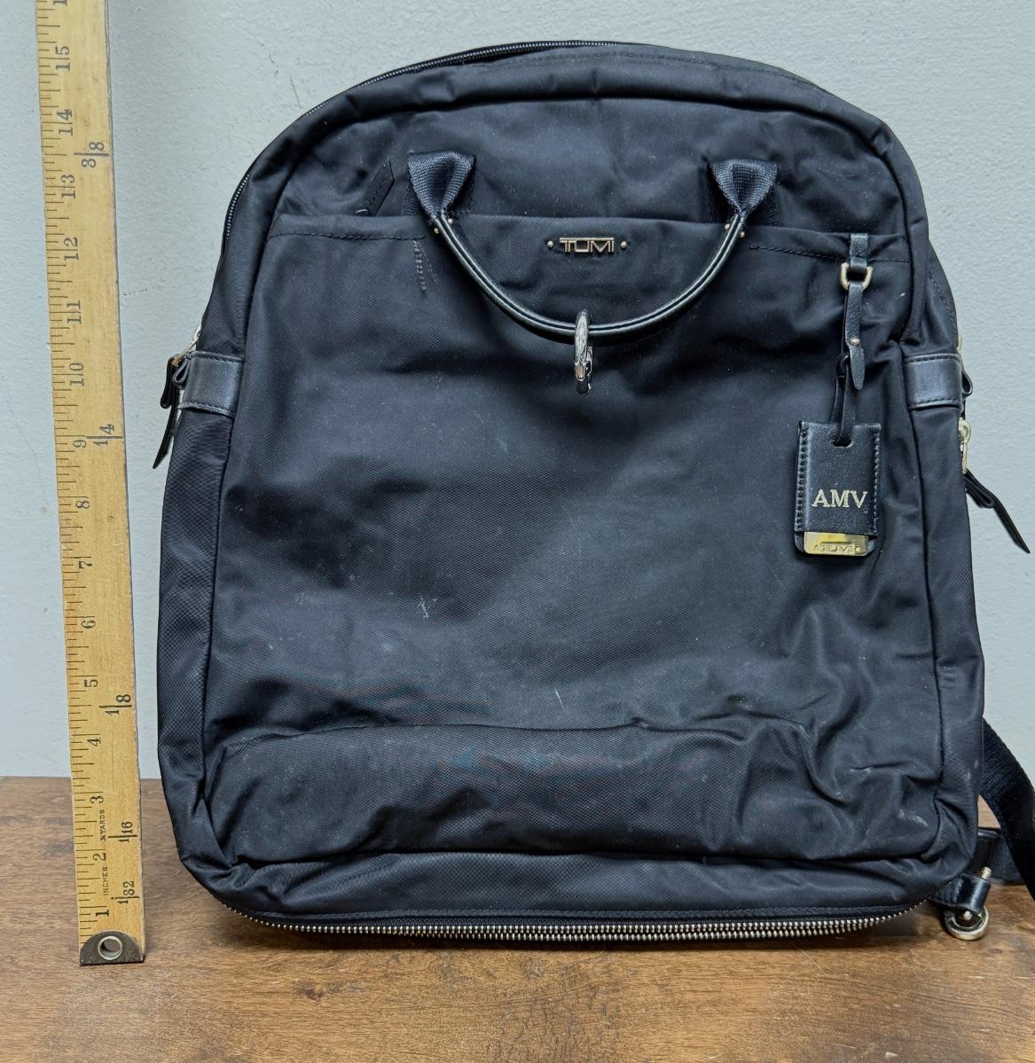 Has backpack straps that can be tucked away, 2 luggage handles at the top. Designed to hold a 15" laptop and accessories. Some scuff marks on the outside, but in overall good used condition. Approx. 15" x 15".