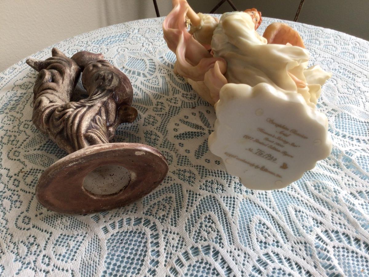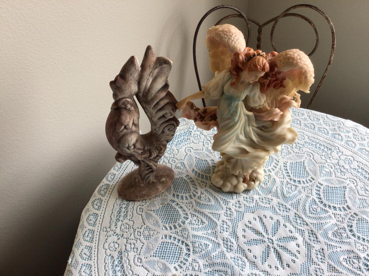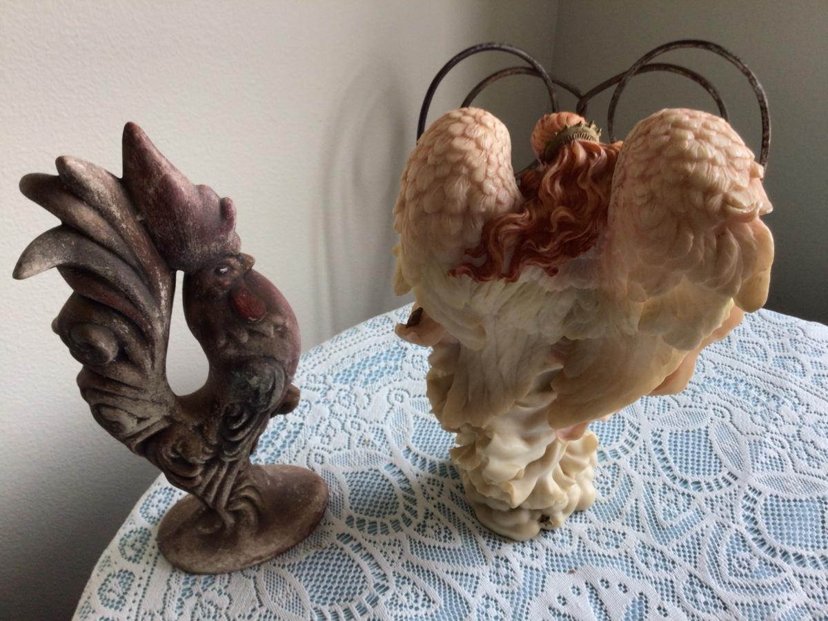You get two great items. A resign Angel in great shape and a pottery rooster also in great condition.