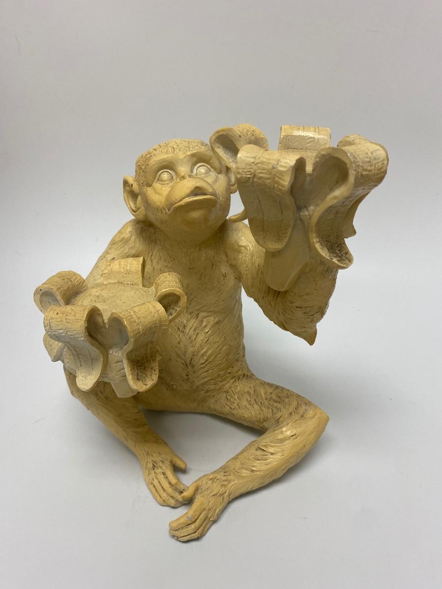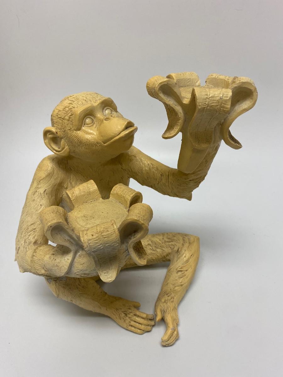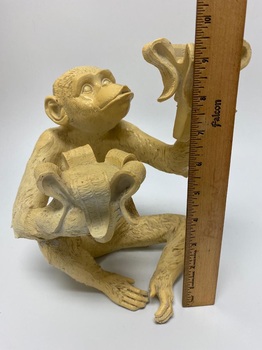 Resin monkey holding peeled bananas garden yard art. Great for candles or light orbs. Sturdy, put in yard or on patio. One arm has been repaired but wouldn't be all to noticeable when displayed. About 10" tall.