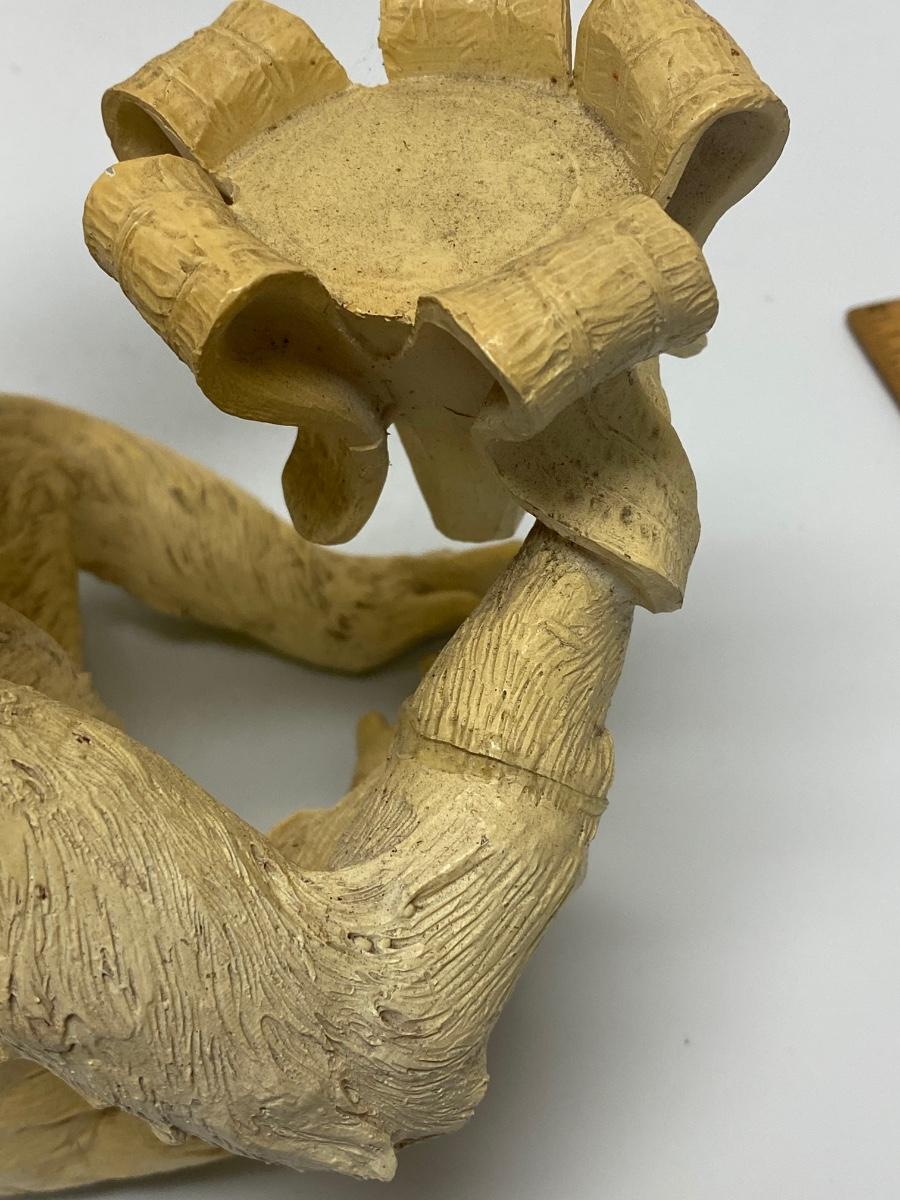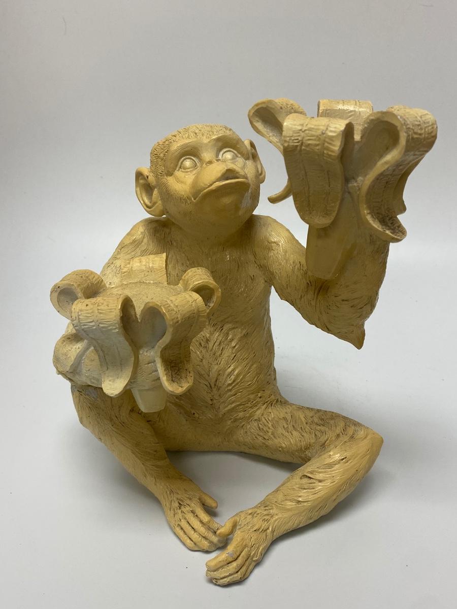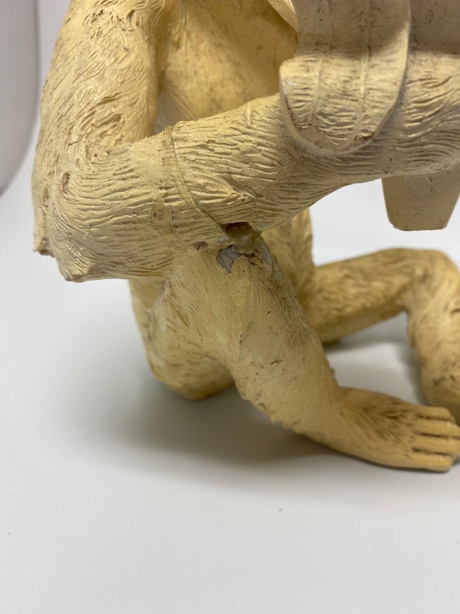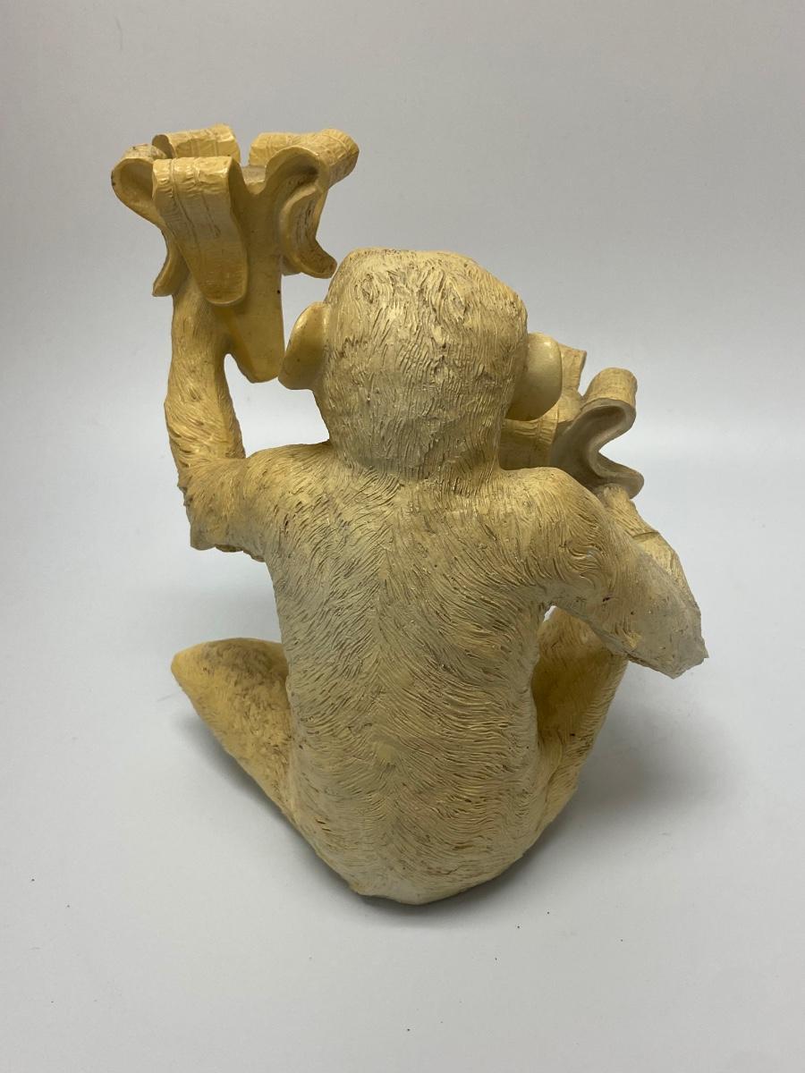 Resin monkey holding peeled bananas garden yard art. Great for candles or light orbs. Sturdy, put in yard or on patio. One arm has been repaired but wouldn't be all to noticeable when displayed. About 10" tall.