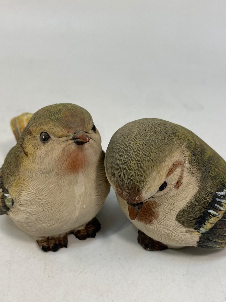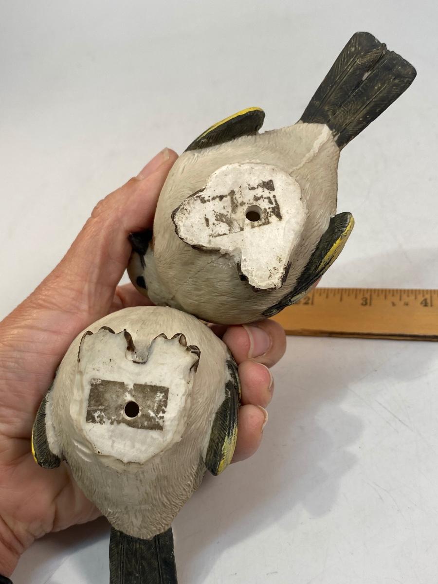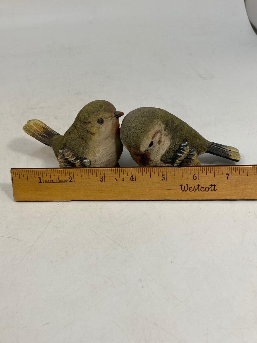 Resin Sparrow Finch Bird Figurines. Made of heavy-duty resin or plastic. In good condition except one bird has the tiniest of chips in beak. About 3" size.