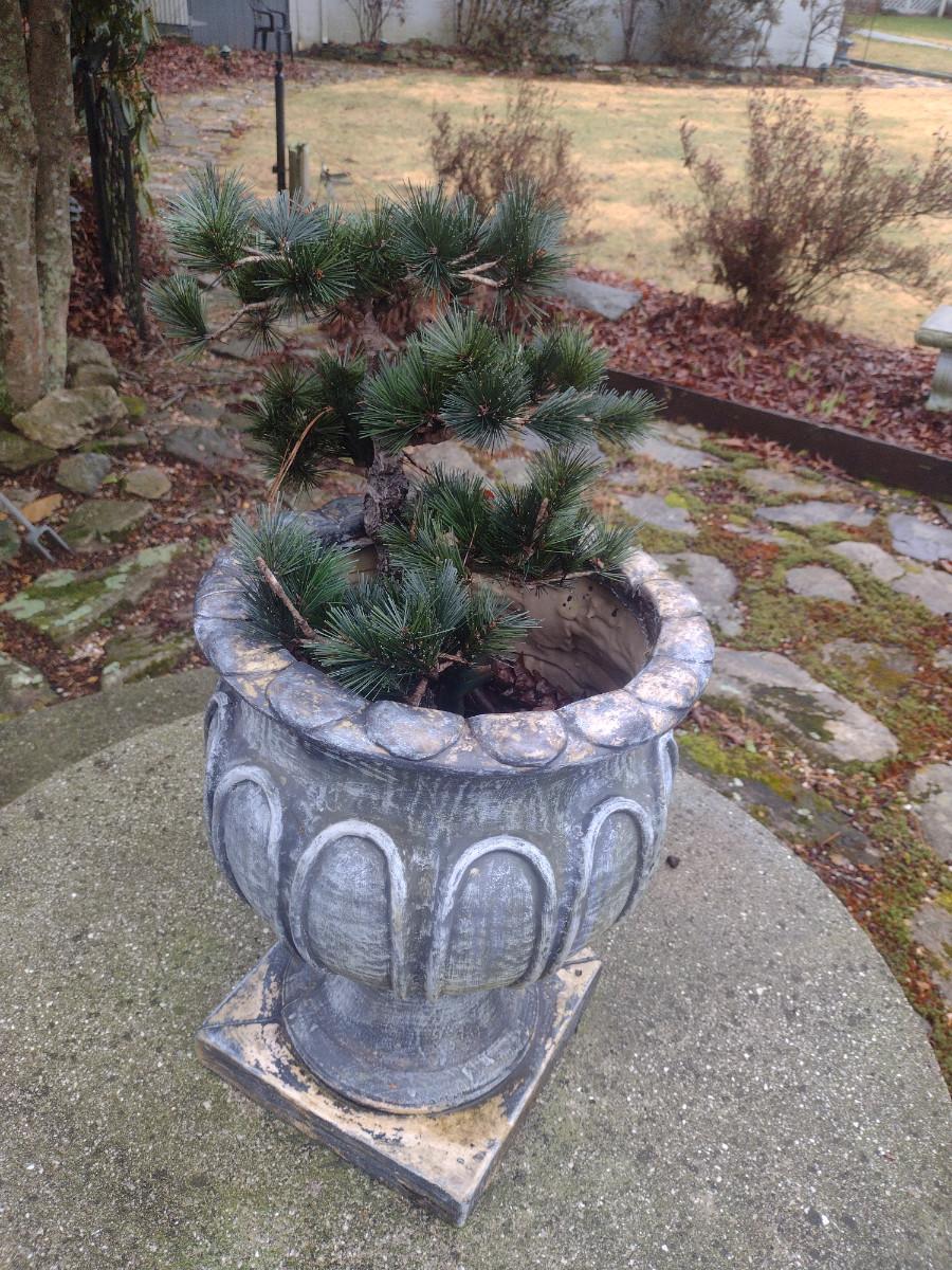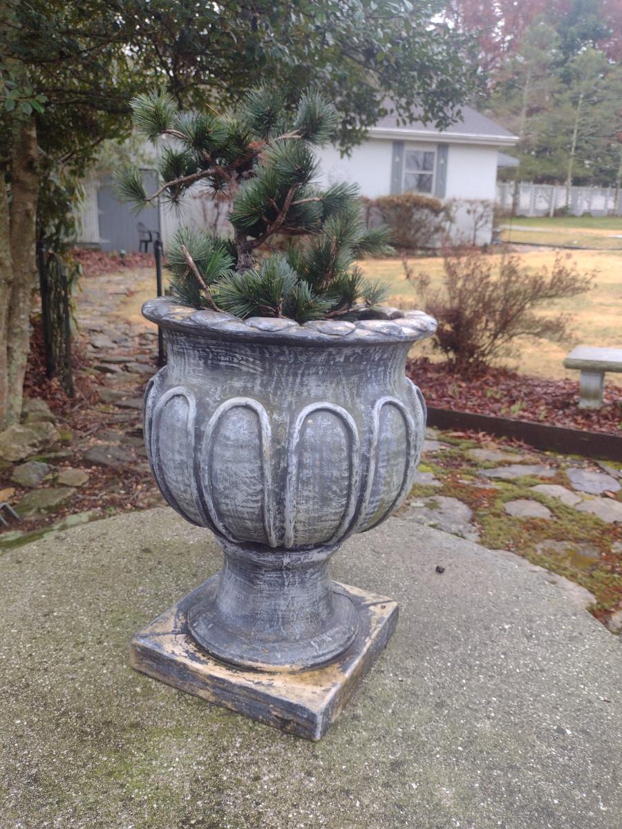 Resin Urn Planter with Live Evergreen Seedling. Approx 16" tall, 12" in diameter.