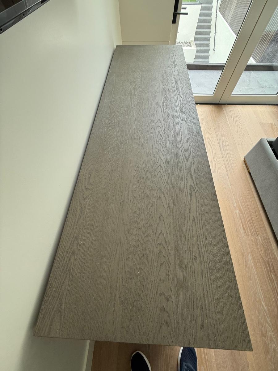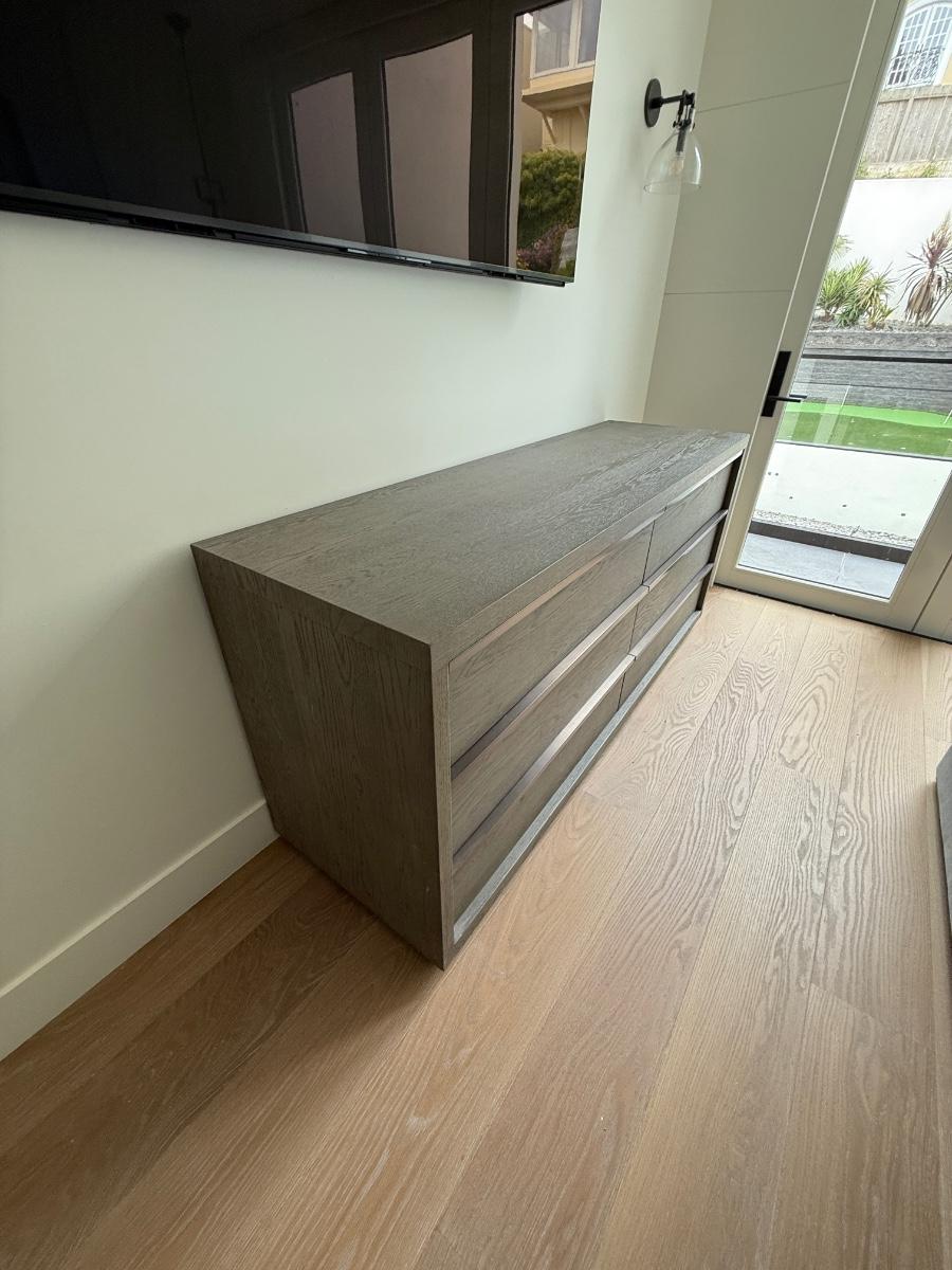 The Restoration Hardware dresser from the Bezier Collection is a contemporary piece designed for the bedroom. It features a high gloss gray oak finish and is constructed from oak, offering a sleek and modern look. The dresser measures 6 feet in length, 22 inches in width, and 32.5 inches in height, with six drawers providing ample storage. It is an original piece from the 21st century, suitable for adults. The dresser is rectangular in shape and includes door handles for easy access. Care instructions recommend cleaning with a dry cloth. This pre-owned unit is in good condition.