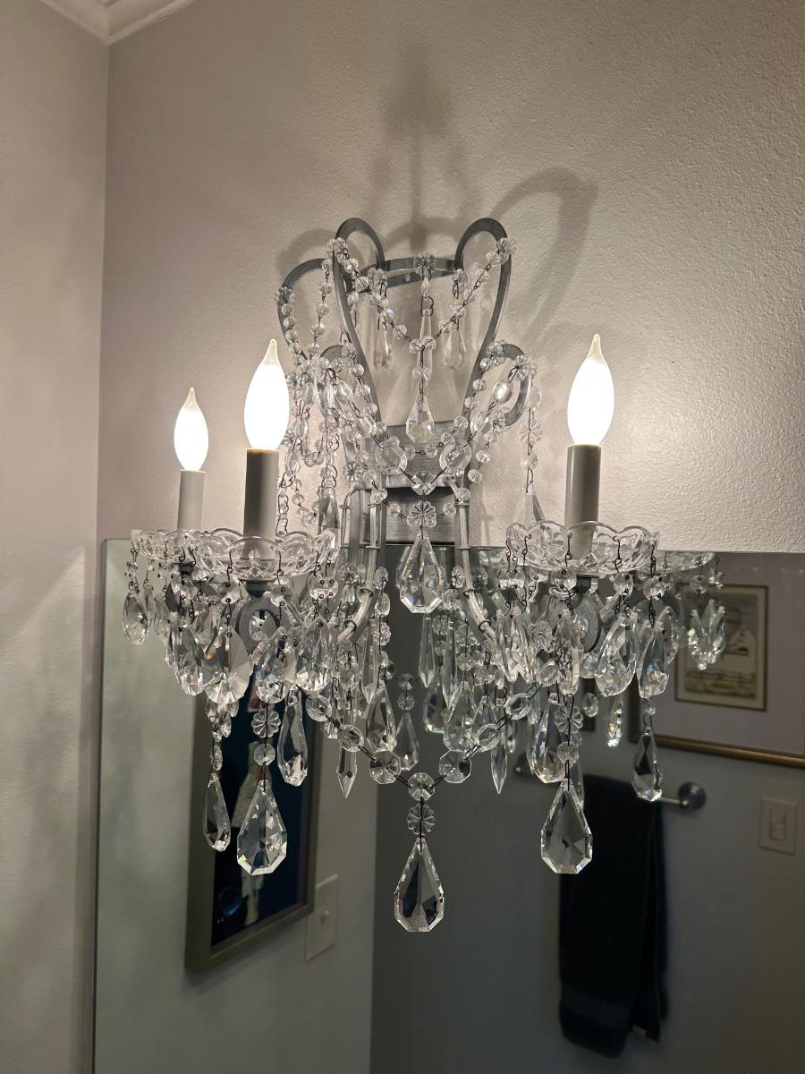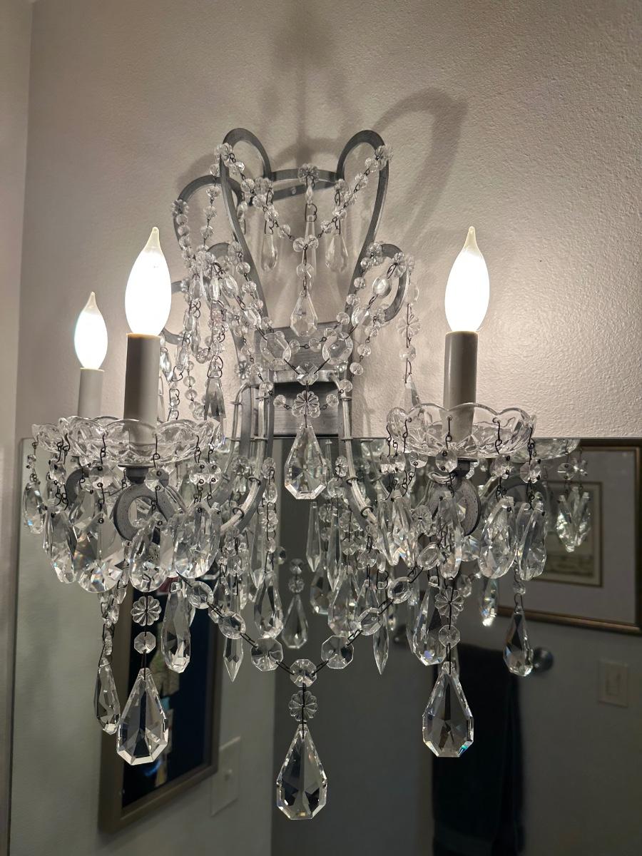 Wall-mounted chandelier from Restoration Hardware’s Baby & Child collection. Features three candle-style lights and tiers of faceted crystal drops and swags. Compact size, perfect for a nursery, powder room, or small space. Extra crystals are provided.