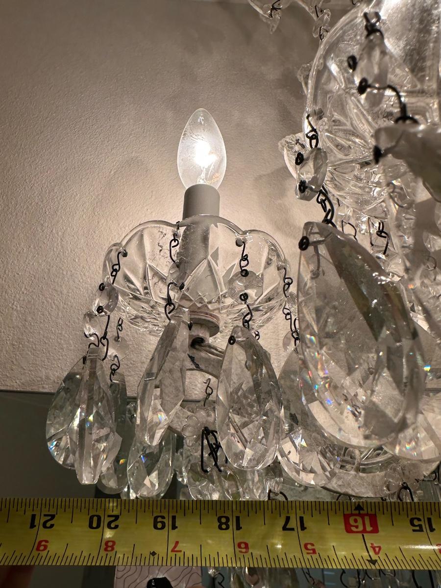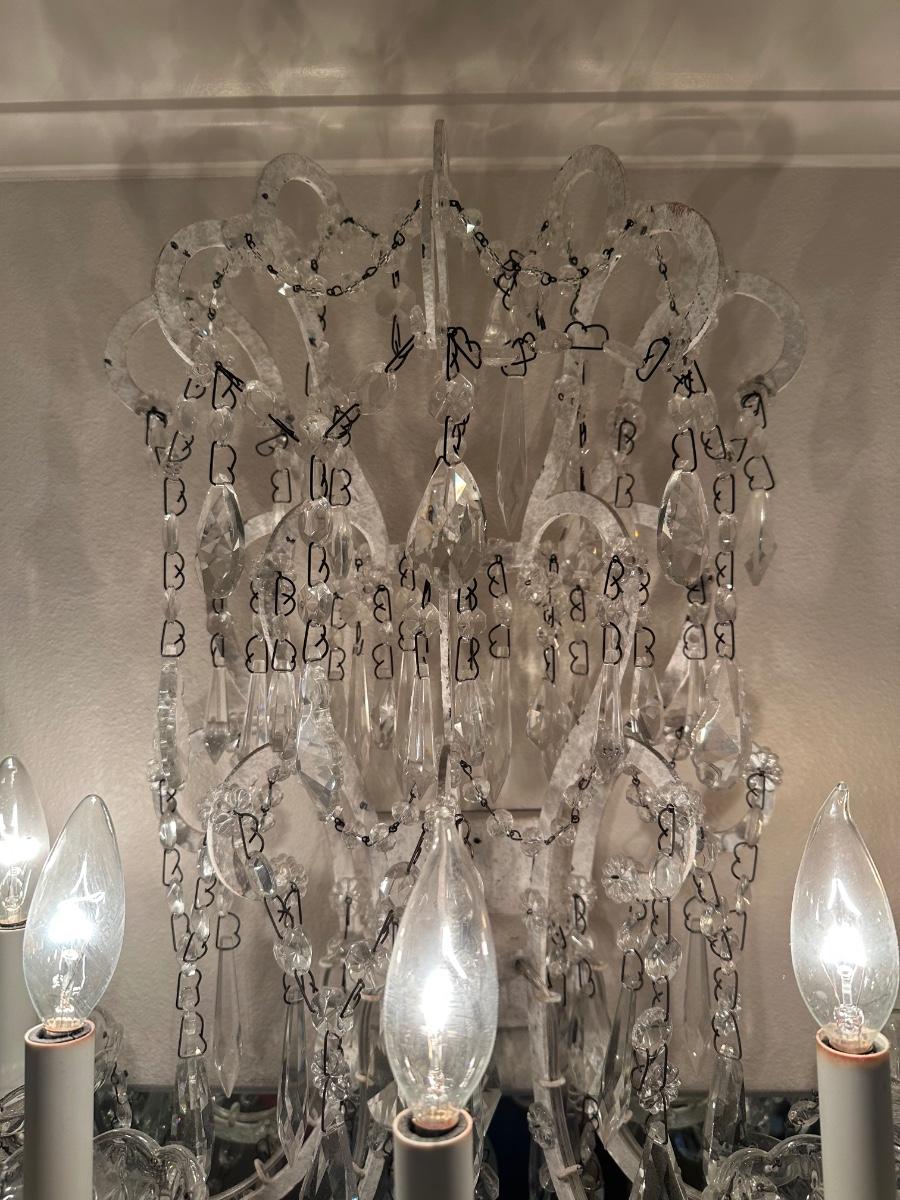 Single wall-mounted crystal sconce from Restoration Hardware. Features six candle-style bulbs and cascading faceted crystal prisms on a white-painted metal frame. Perfect as an accent light or replacement.
