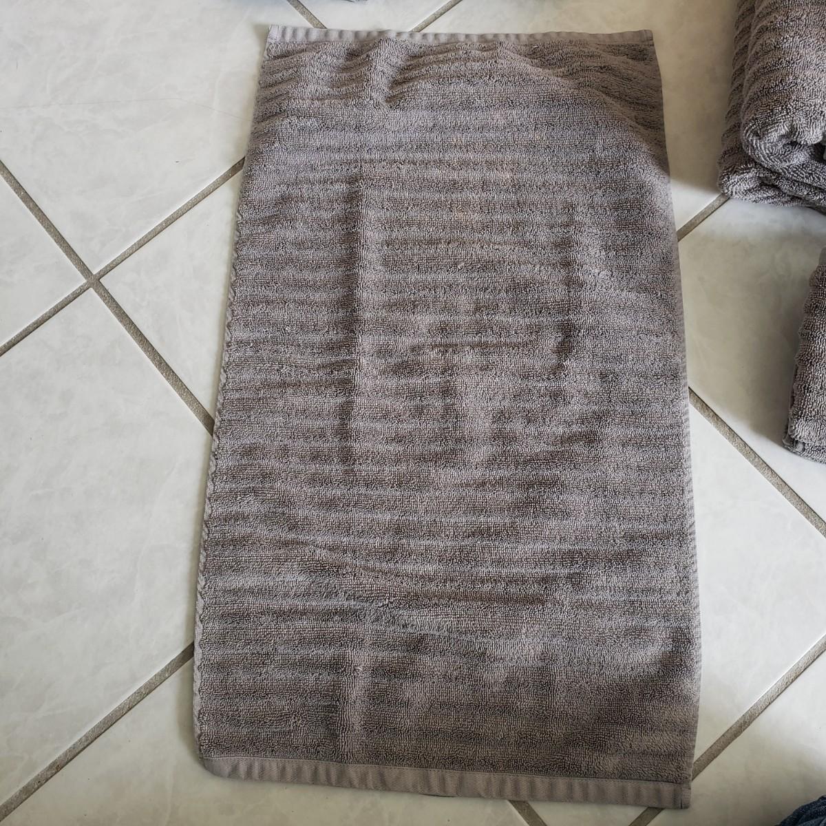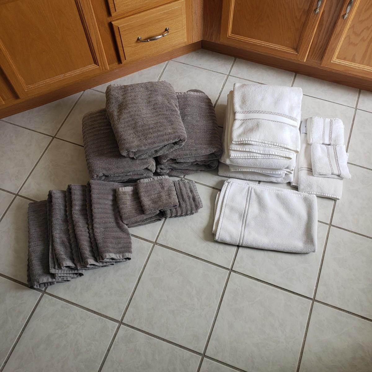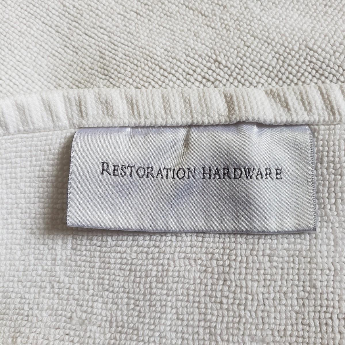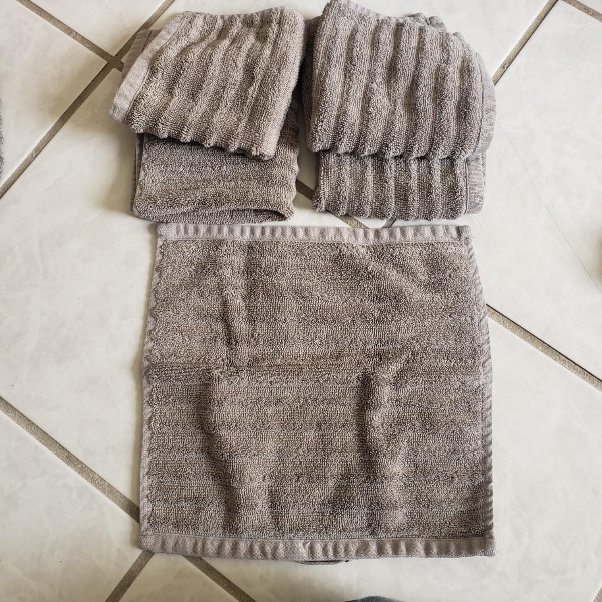 This lot has two different towel sets, a grey set and a white with grey striped set by Restoration Hardware. The grey set is unmarked with a brand and has a ribbed texture. This set contains five body towels, four hand towels and five face cloths. Each towel has a hook sewn in. There are a few bleach stains and a few snags, but overall solid. The white towels by RH contain three body towels, one hand towel two face cloths and a bathmat. The hand towel is slightly discolored, see picture.