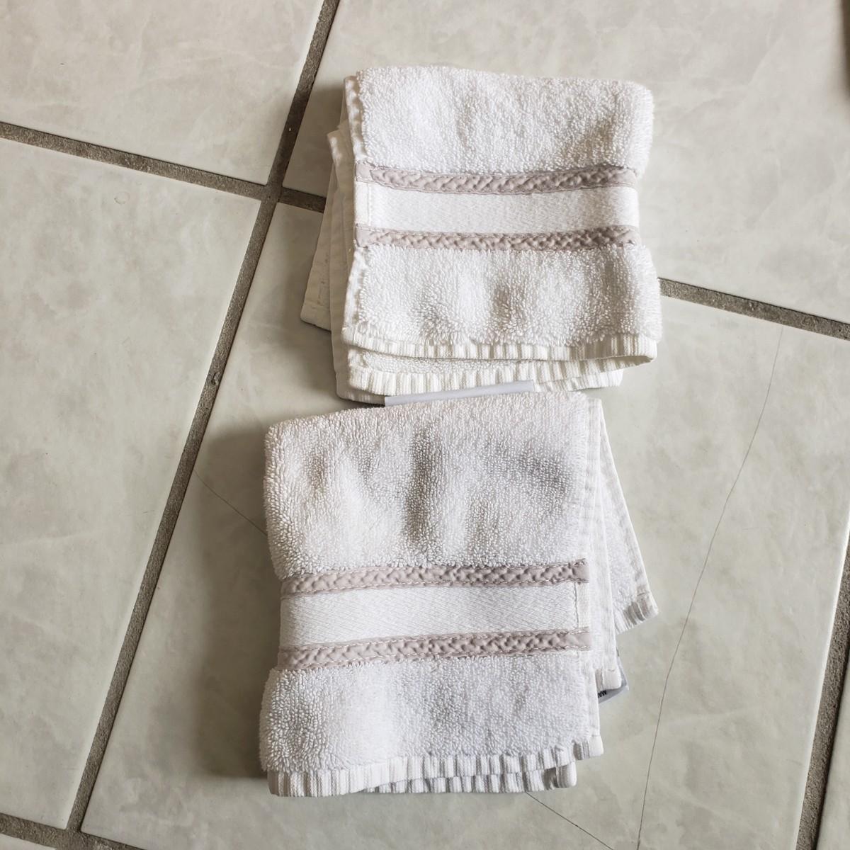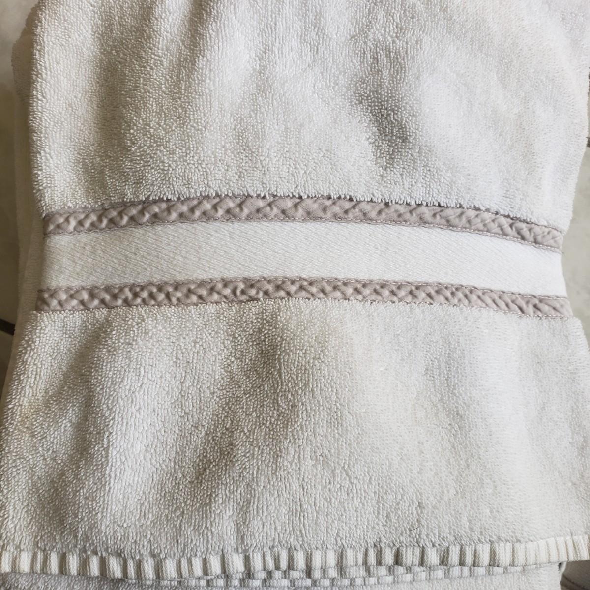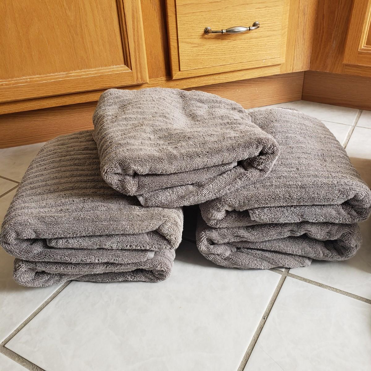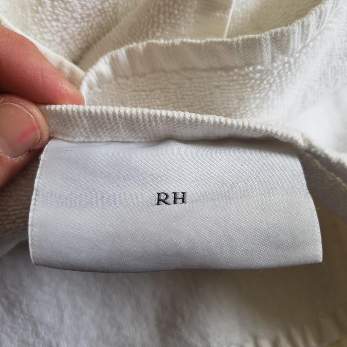 This lot has two different towel sets, a grey set and a white with grey striped set by Restoration Hardware. The grey set is unmarked with a brand and has a ribbed texture. This set contains five body towels, four hand towels and five face cloths. Each towel has a hook sewn in. There are a few bleach stains and a few snags, but overall solid. The white towels by RH contain three body towels, one hand towel two face cloths and a bathmat. The hand towel is slightly discolored, see picture.