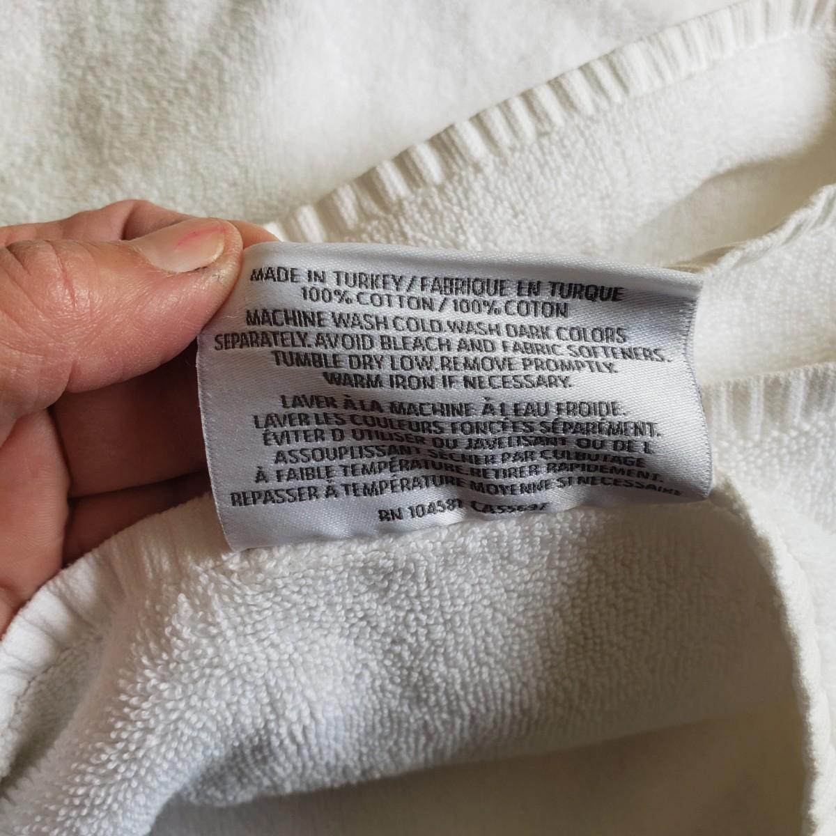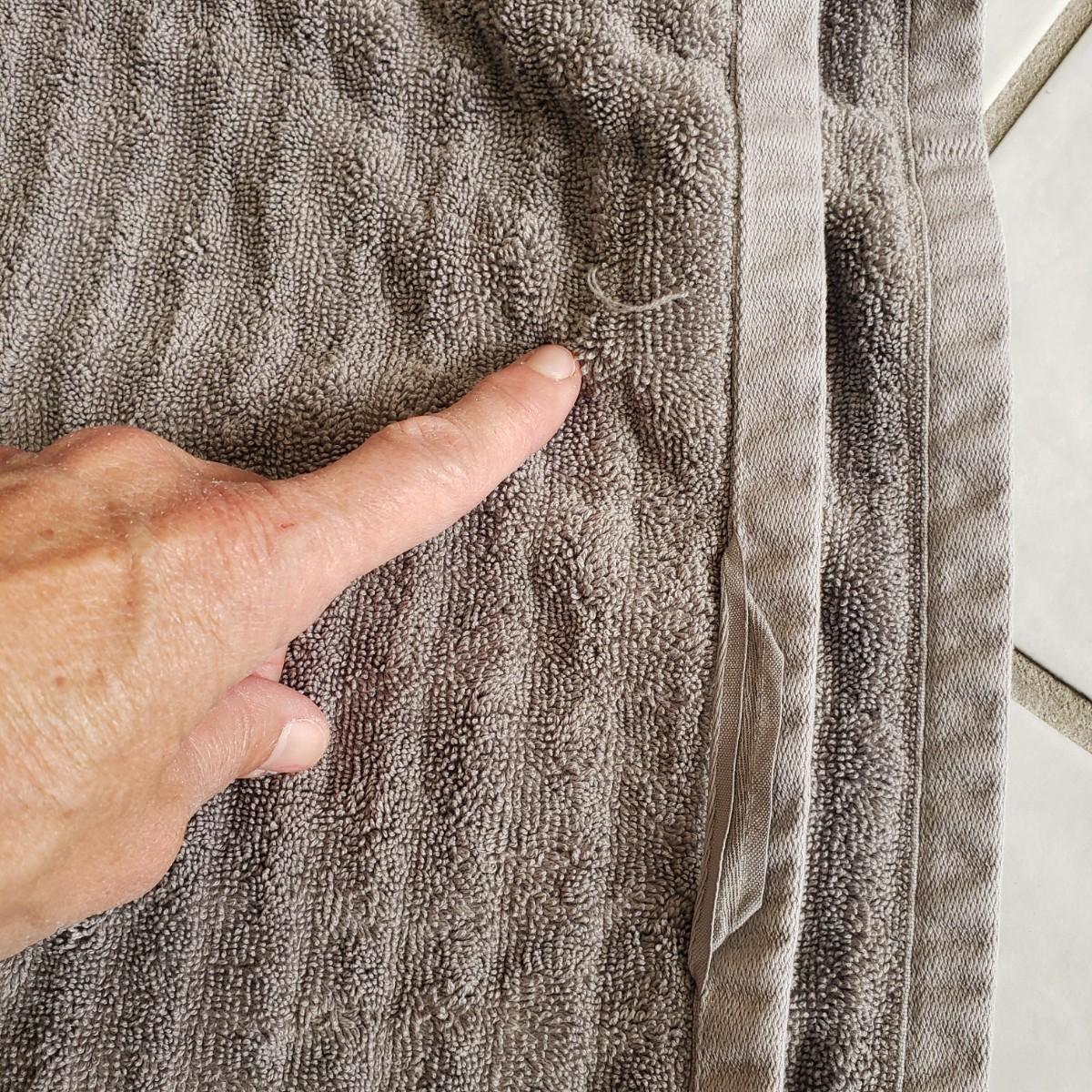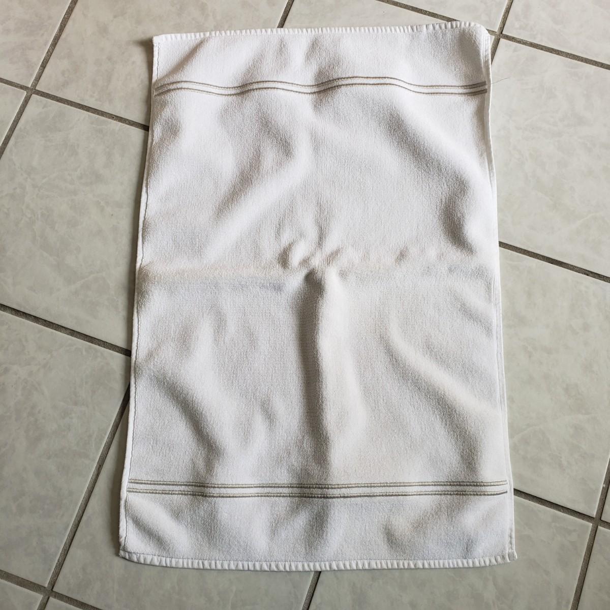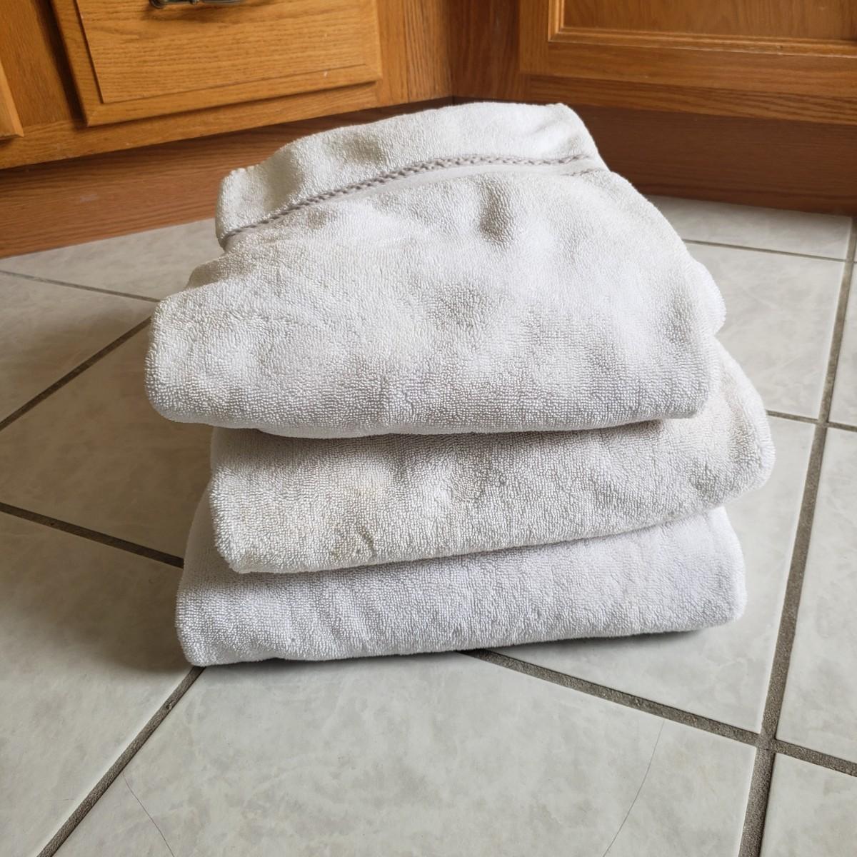 This lot has two different towel sets, a grey set and a white with grey striped set by Restoration Hardware. The grey set is unmarked with a brand and has a ribbed texture. This set contains five body towels, four hand towels and five face cloths. Each towel has a hook sewn in. There are a few bleach stains and a few snags, but overall solid. The white towels by RH contain three body towels, one hand towel two face cloths and a bathmat. The hand towel is slightly discolored, see picture.