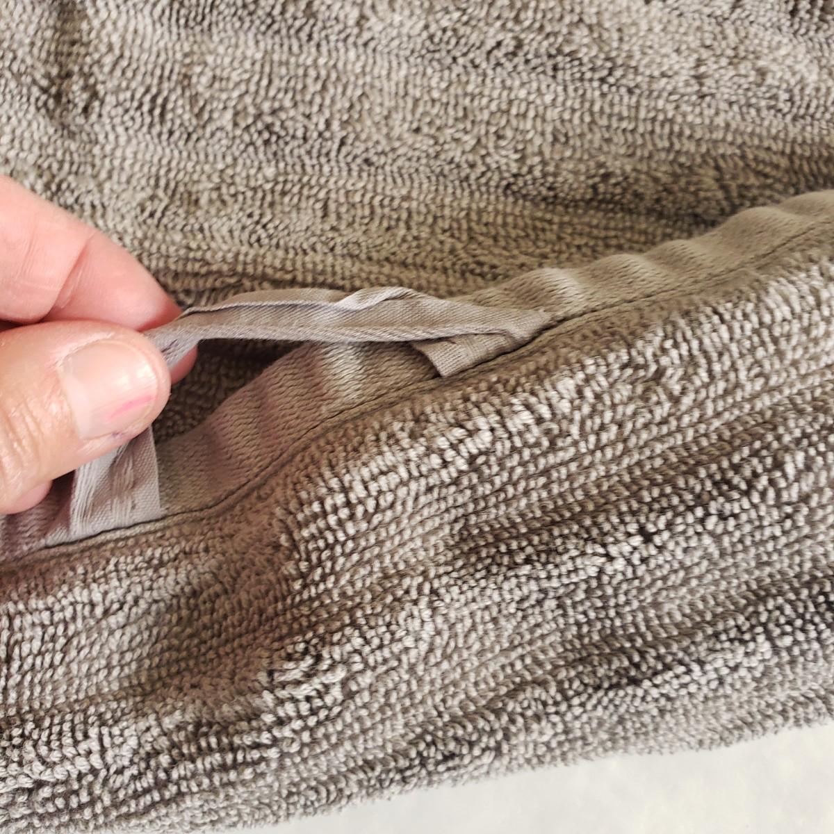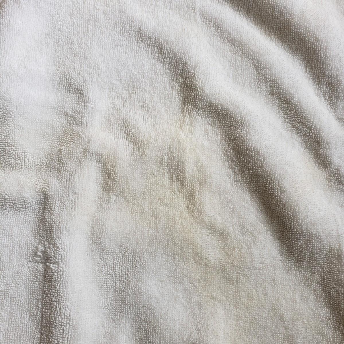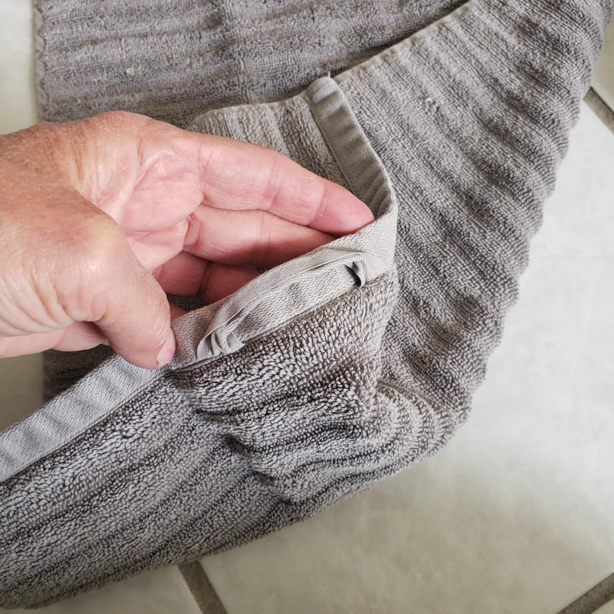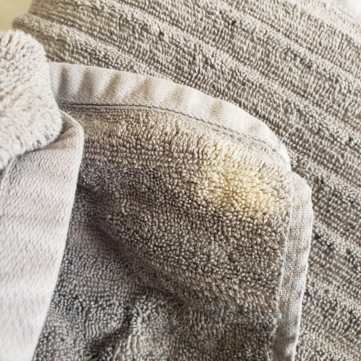 This lot has two different towel sets, a grey set and a white with grey striped set by Restoration Hardware. The grey set is unmarked with a brand and has a ribbed texture. This set contains five body towels, four hand towels and five face cloths. Each towel has a hook sewn in. There are a few bleach stains and a few snags, but overall solid. The white towels by RH contain three body towels, one hand towel two face cloths and a bathmat. The hand towel is slightly discolored, see picture.