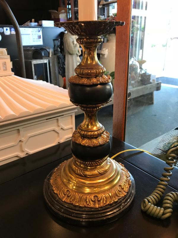 Very nice restored mid century table lamp in brass and black. Black marble base supports elaborate acanthus design brass column with matte black spherical inserts topped with a tall candle riser. Large tan drum shade and matching finial. Excellent condition. 16" D shade x 37" H to finial