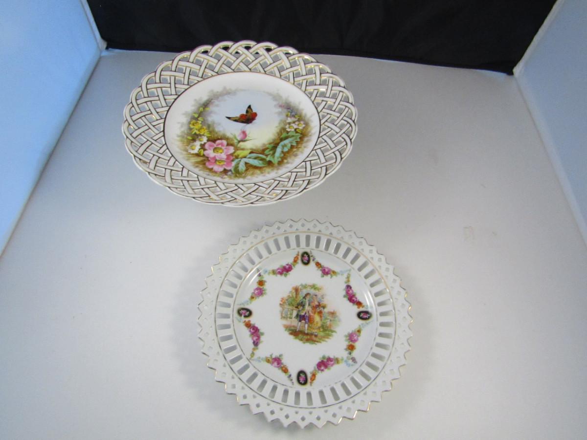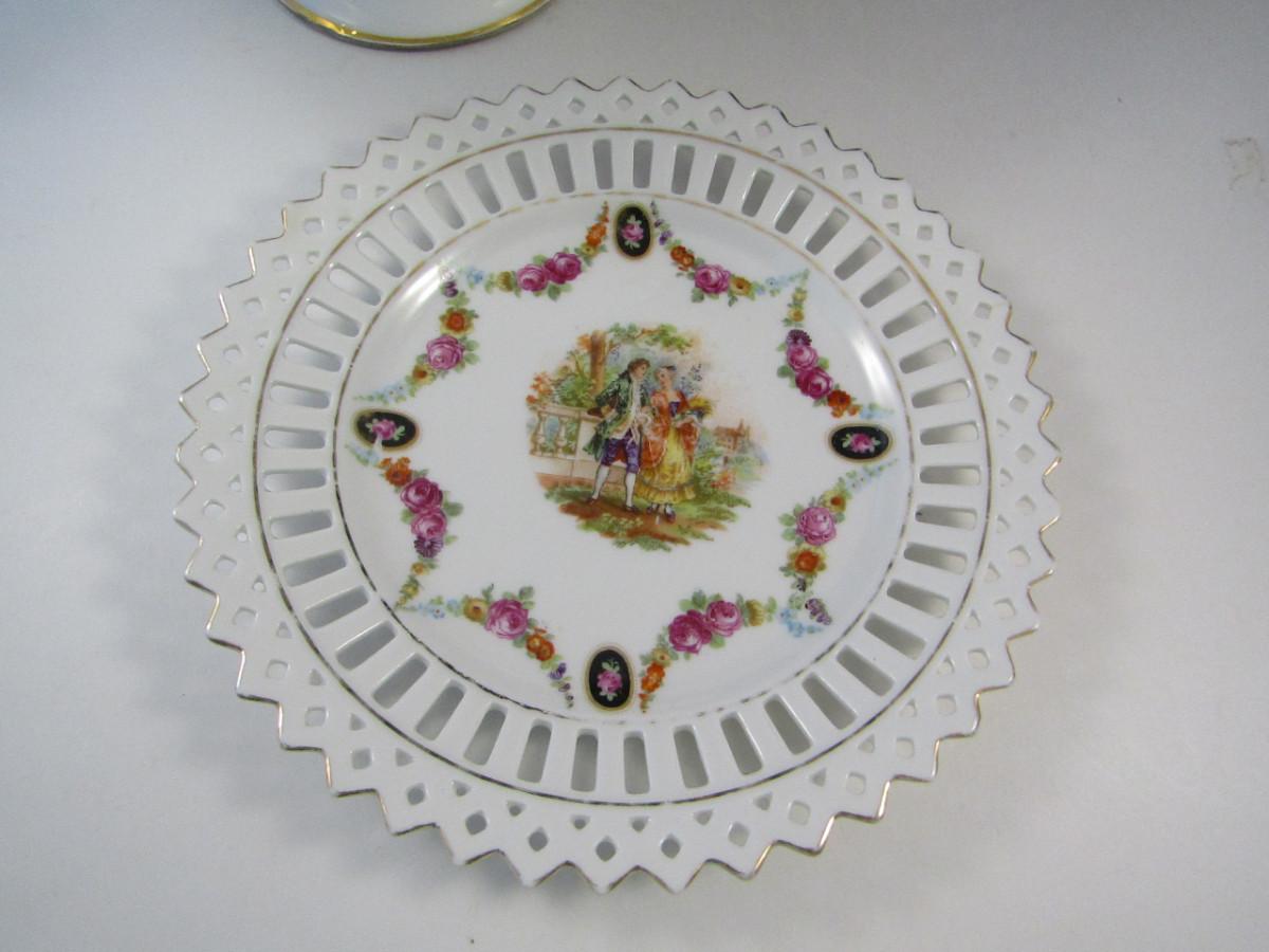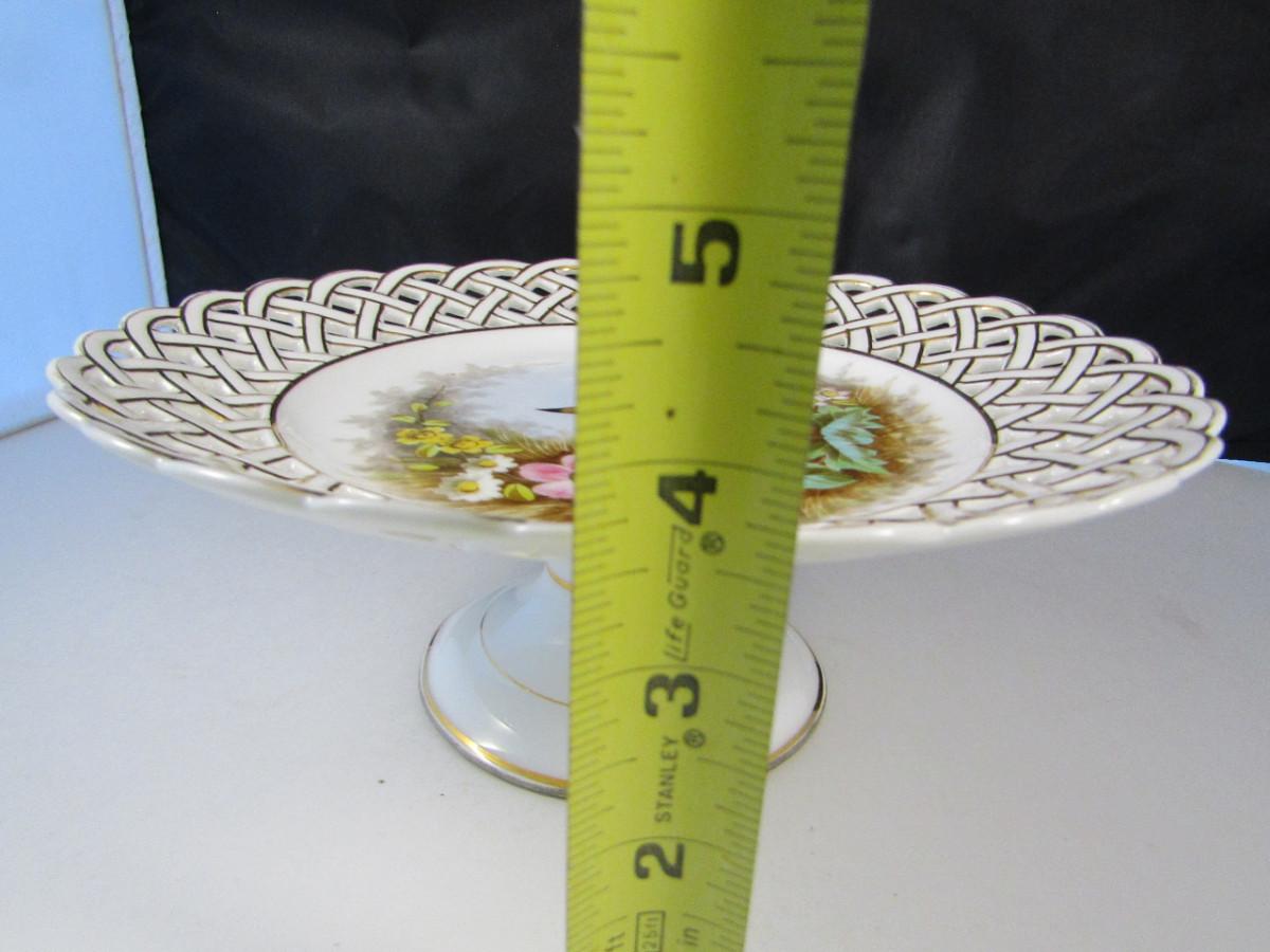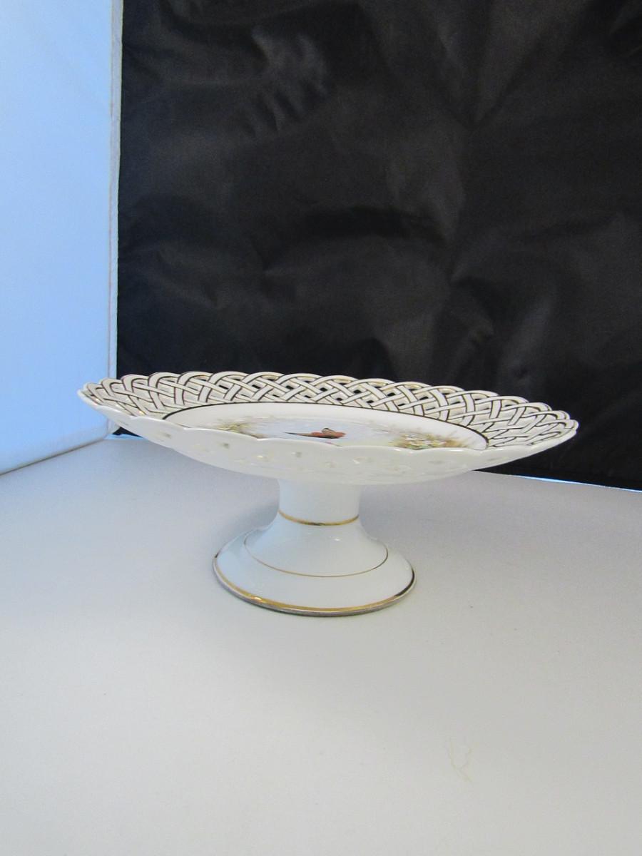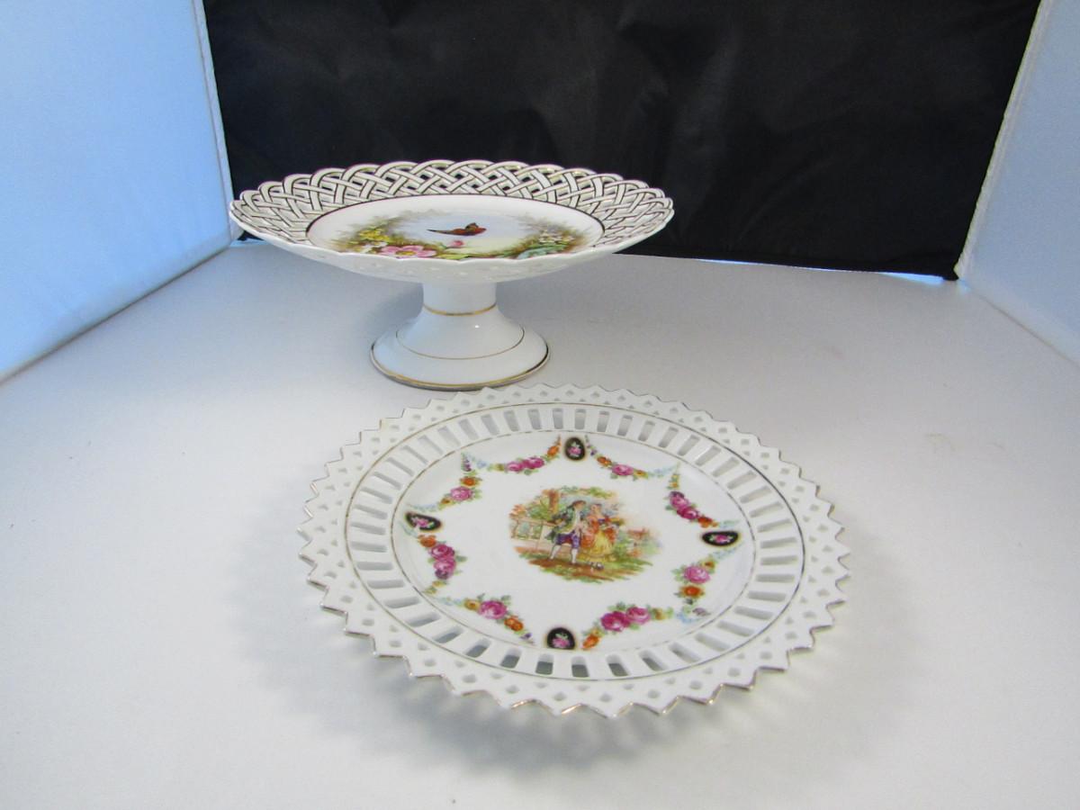Reticulated Plate and Pedestal Pastry/Candy Stand. Plate is marked Germany and is approx 7 3/4" in diameter. Stand is approx 9" in diameter, 3 3/4" tall and has a faded, undecipherable maker's mark.
