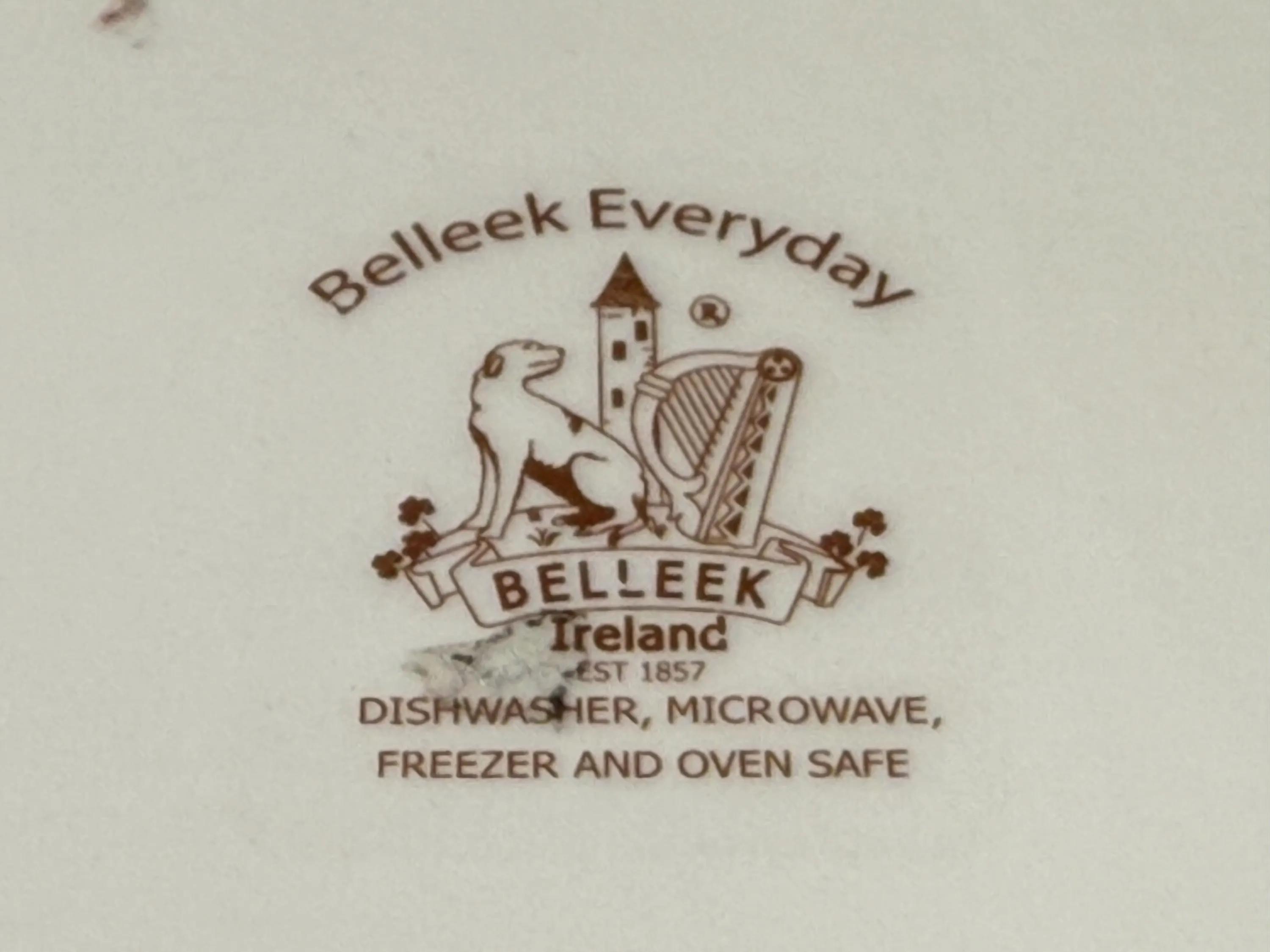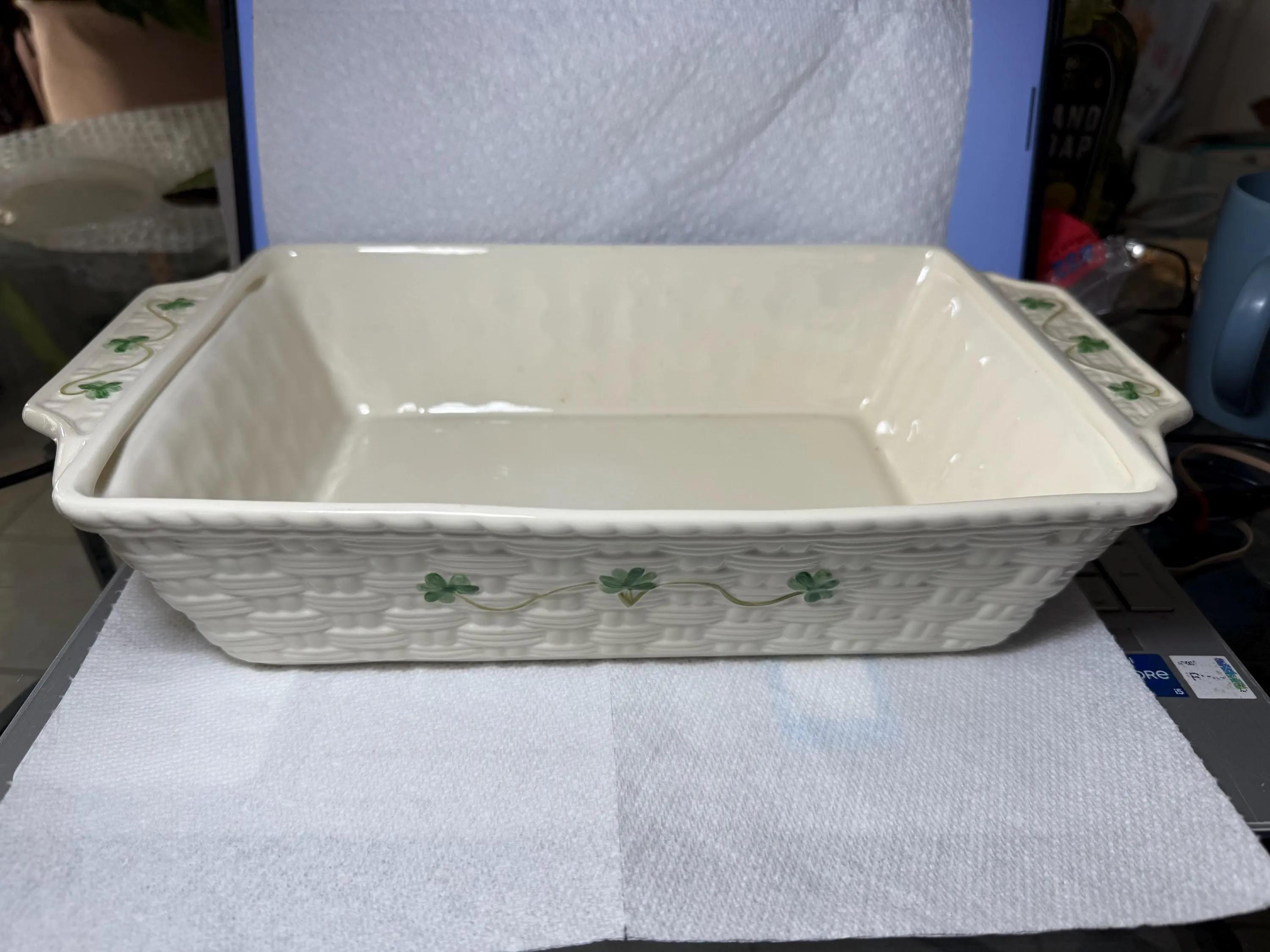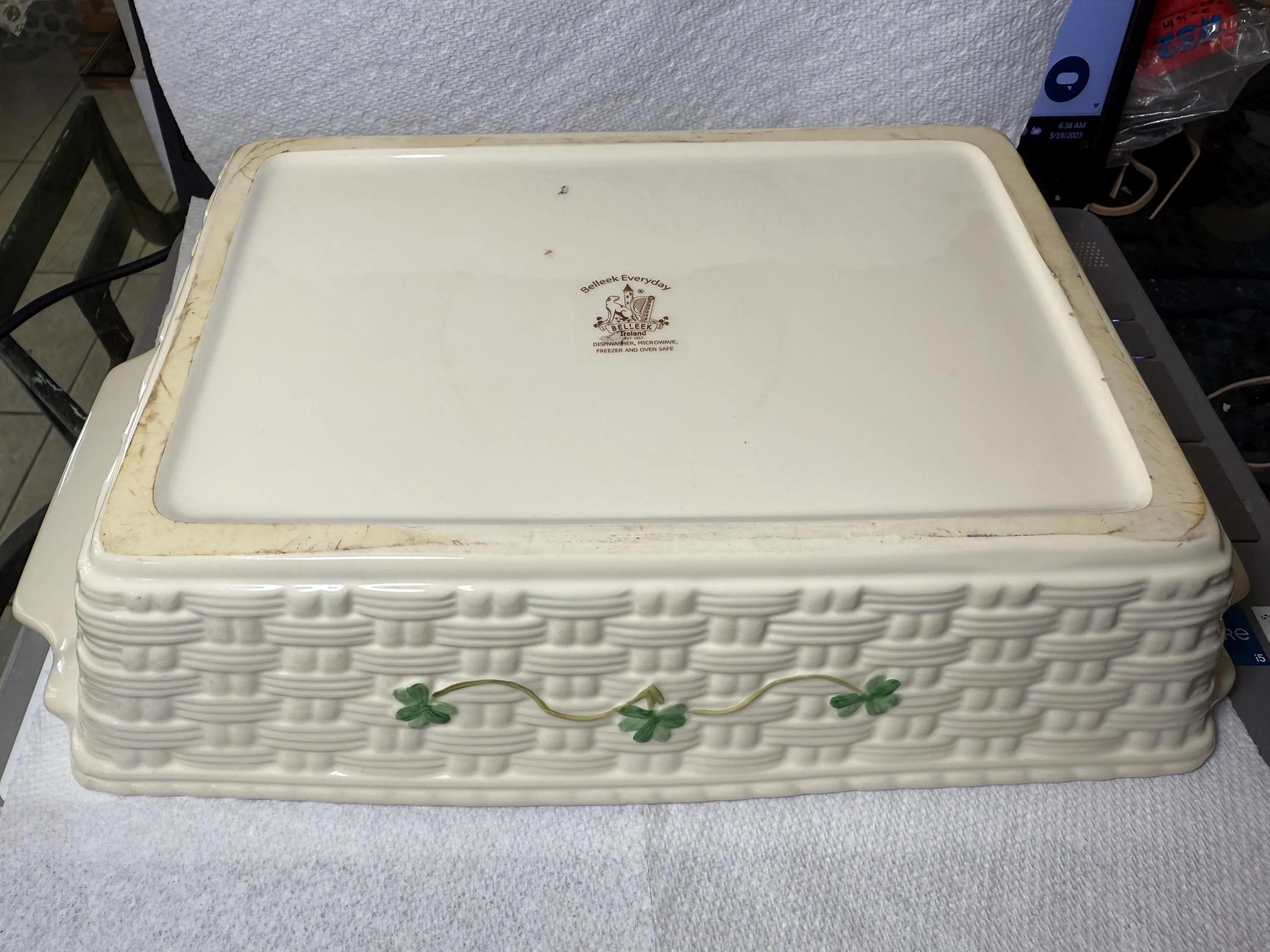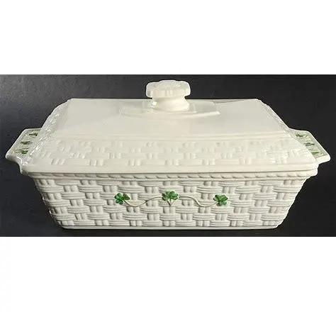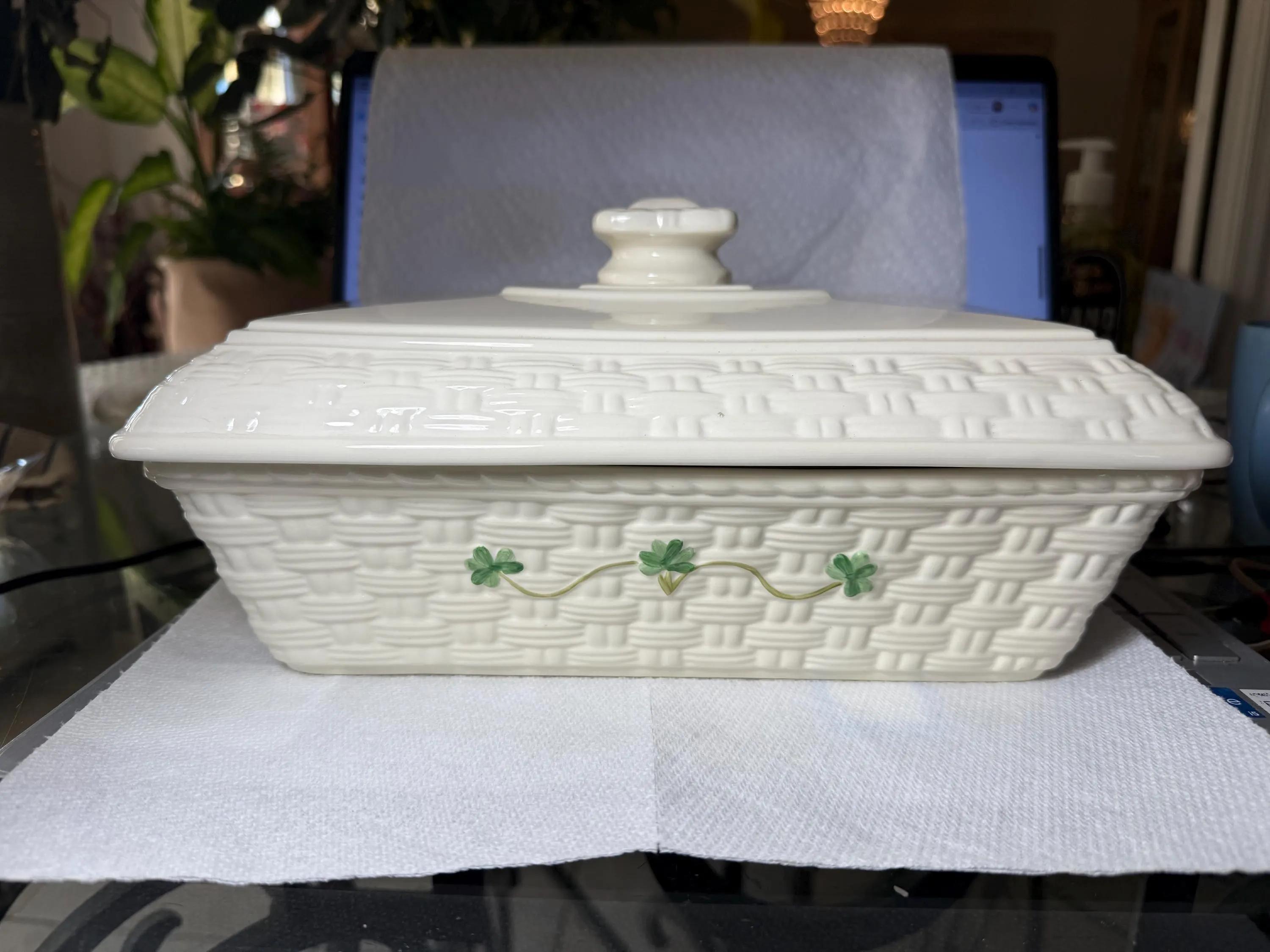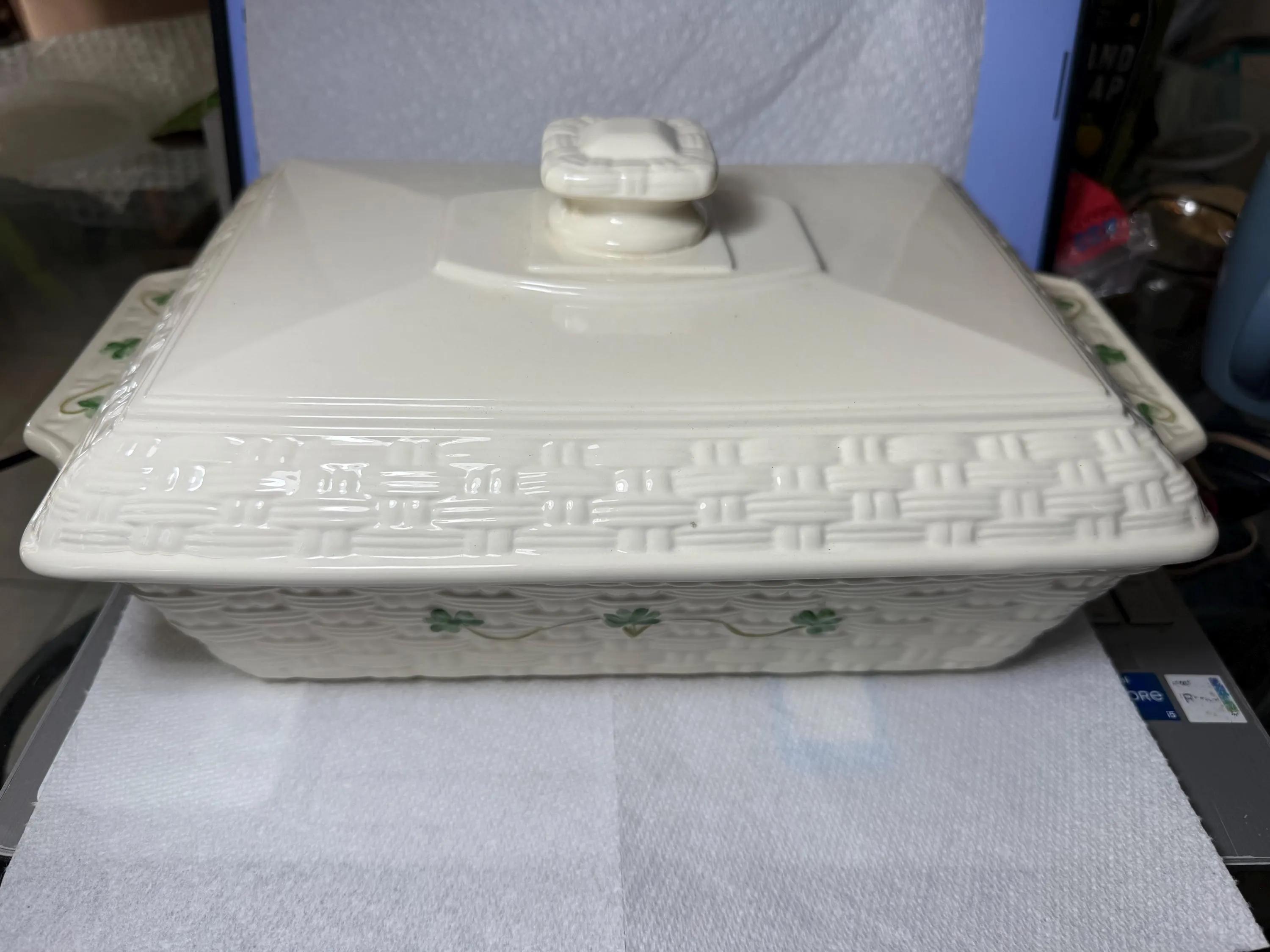 Retired Belleek Pottery (Ireland) 2-Quart Rectangular Porcelain Covered Casserole Bowl w/Shamrock Accents in VG Preowned Condition. $20 DOMESTIC SHIPPING.