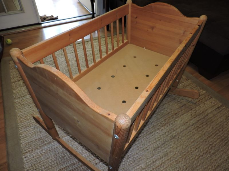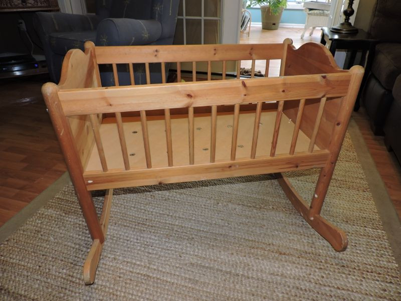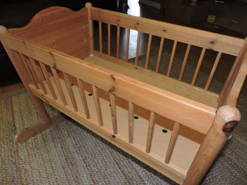 Solid oak cradle from Ikea is no longer available. Would be great to display a collection of dolls in! 33”x28”x26”