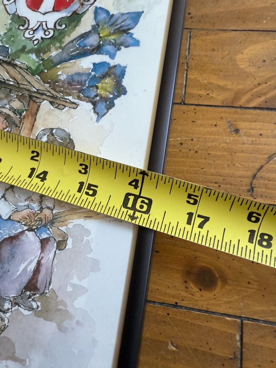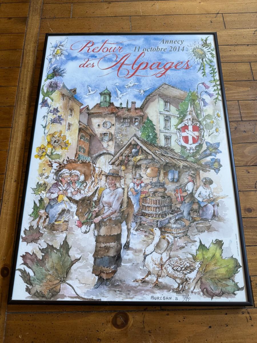 Charming and colorful framed festival print dated October 2014, depicting a pastoral street scene.