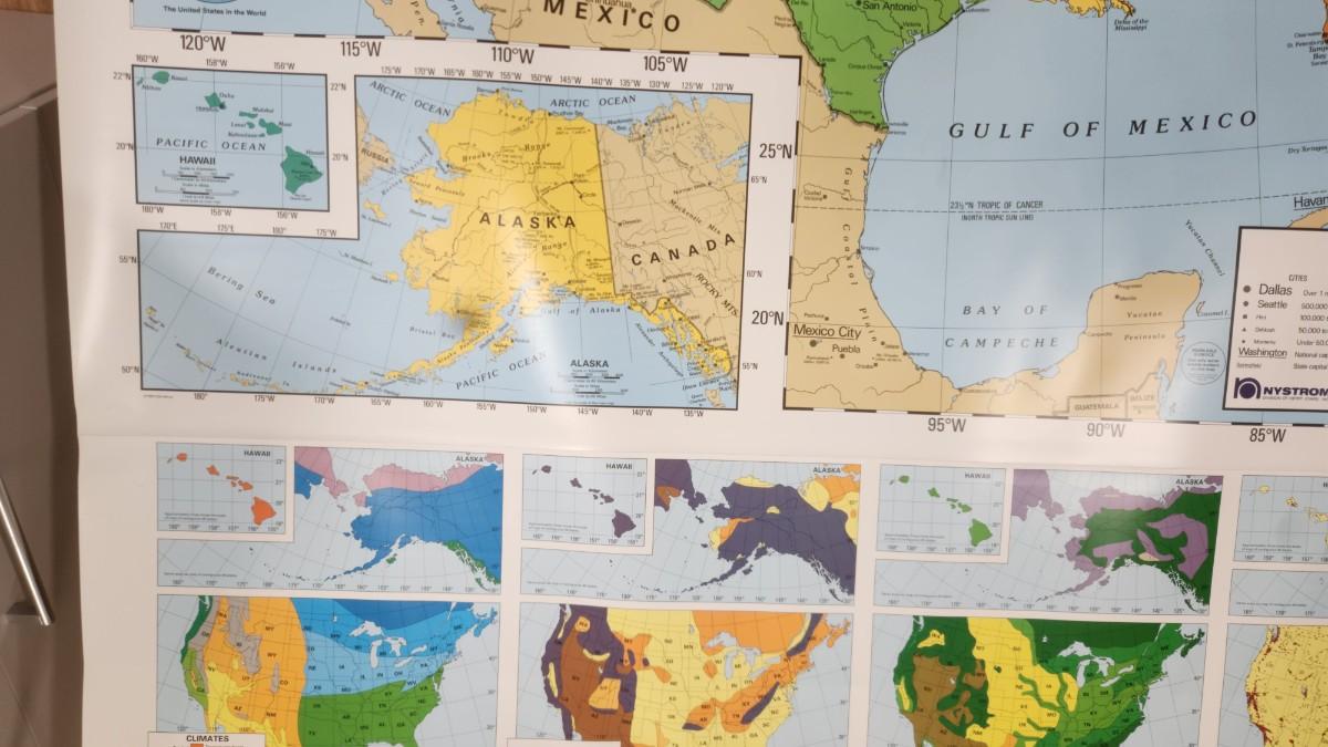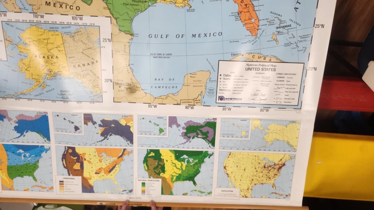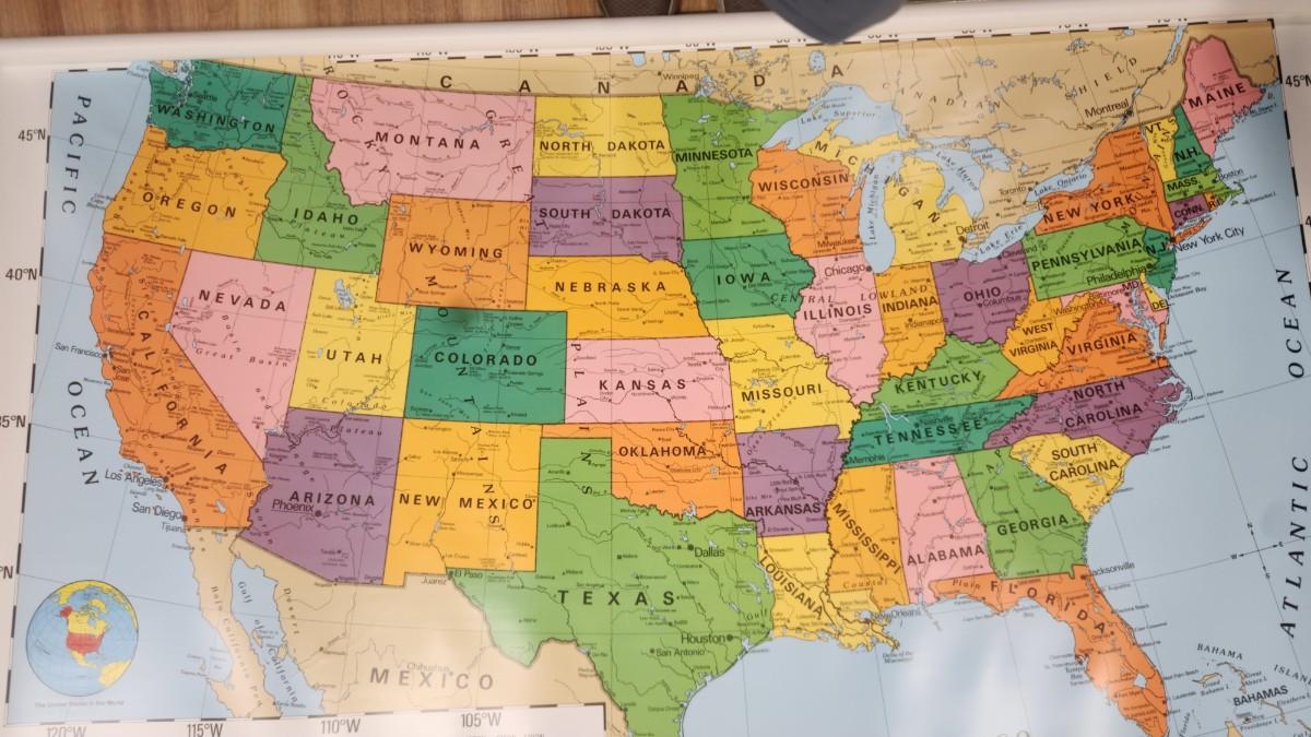 Map of the United States. Hangs and scrolls down like the ones used in schools.