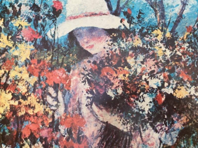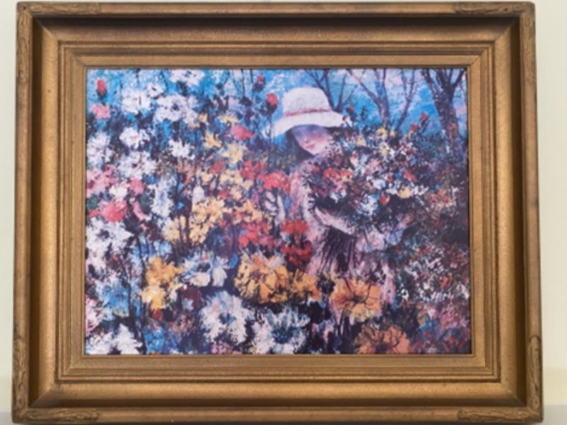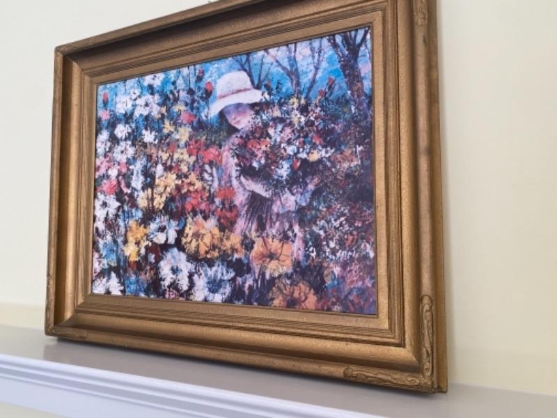 Large cool mid century print on board in great colors - aqua, pink, yellow, blue - depicting girl gathering flowers.