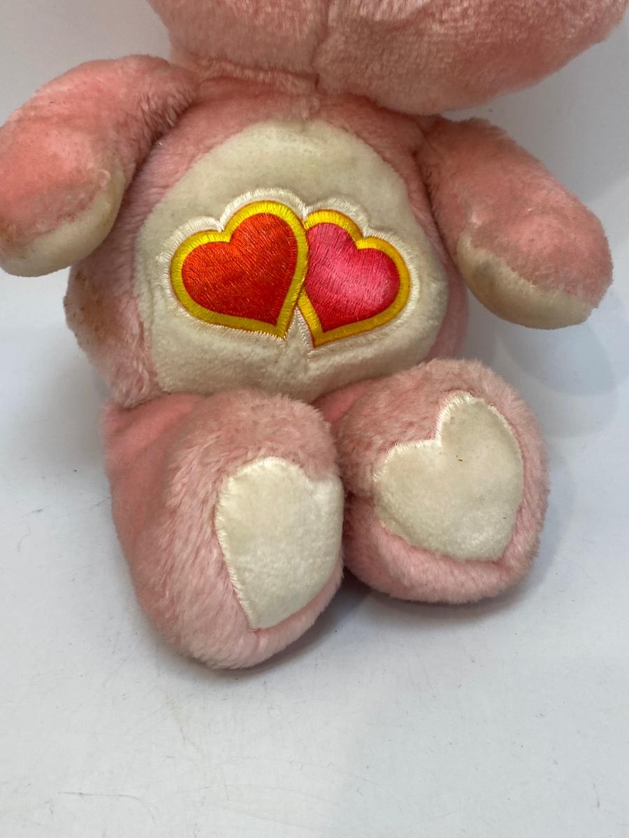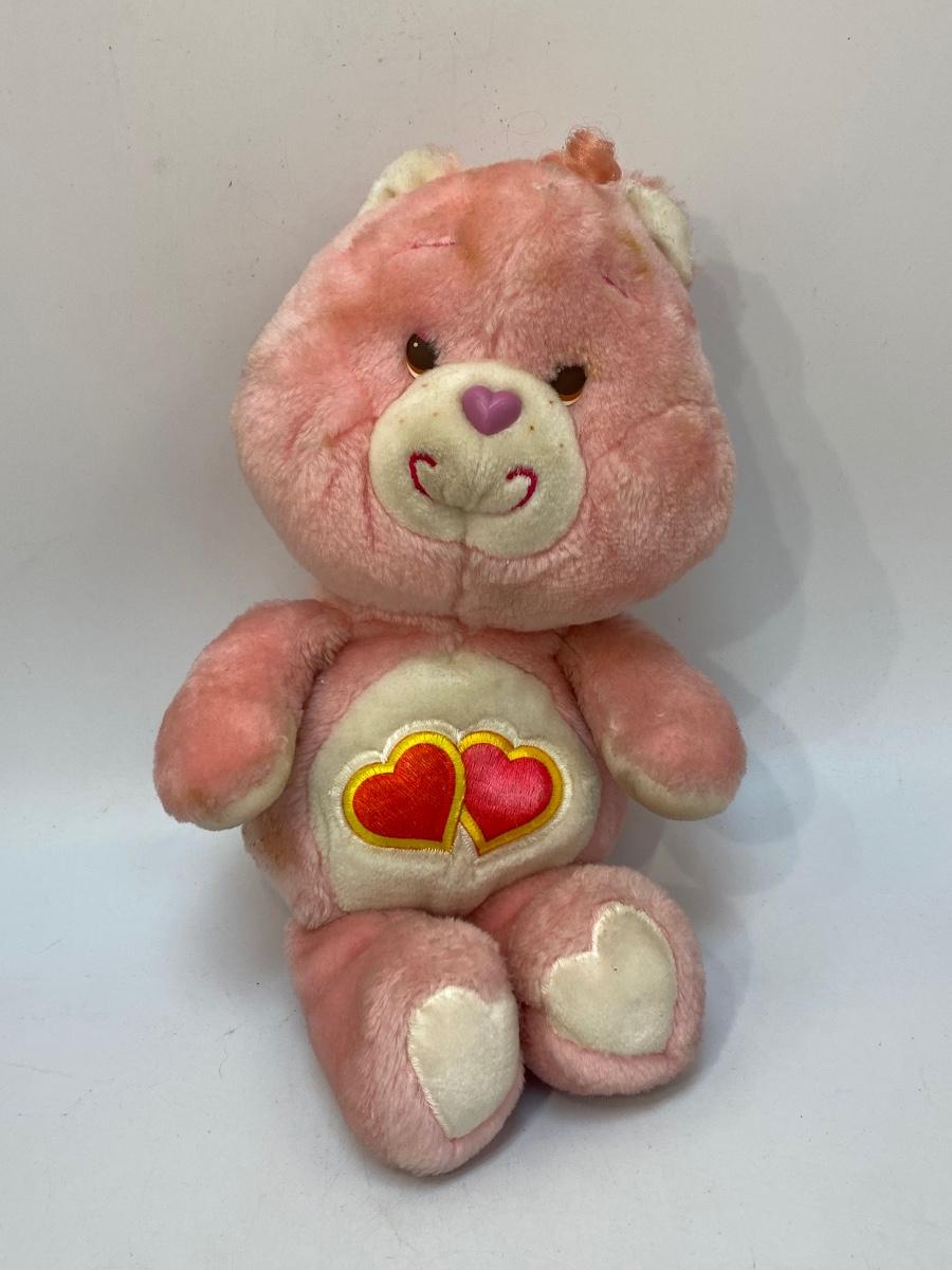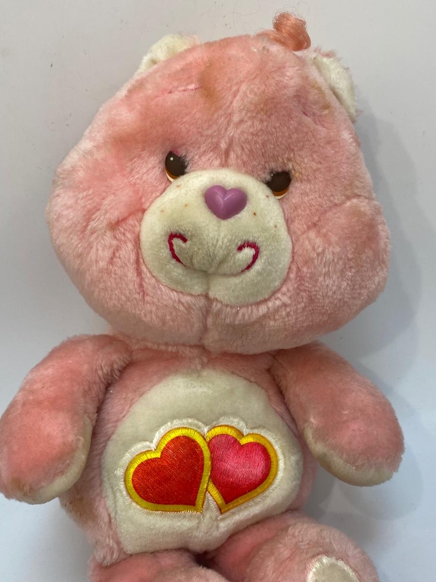 Retro 1980s Love a Lot Care Bear plush. Pink bear with hearts on it's stomach. There is some discolor and surface spots, may just need to be cleaned.