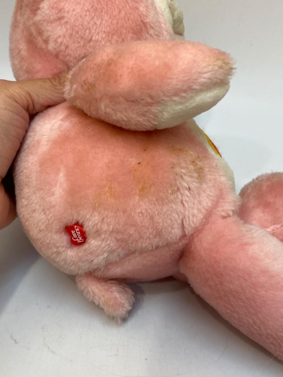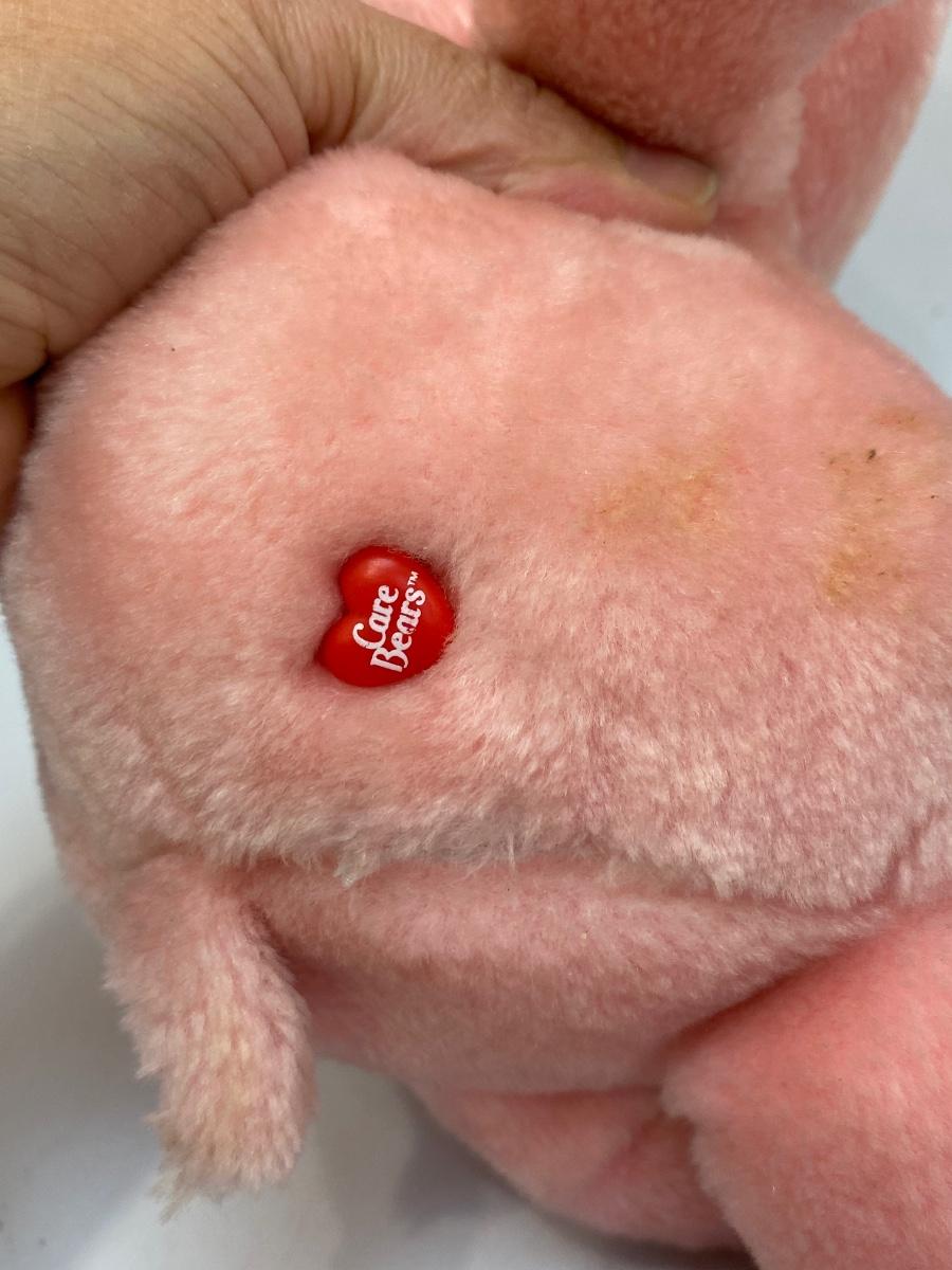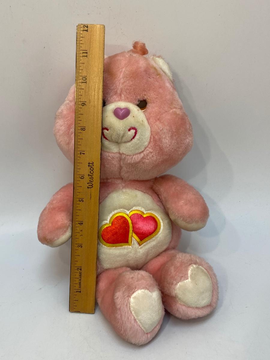 Retro 1980s Love a Lot Care Bear plush. Pink bear with hearts on it's stomach. There is some discolor and surface spots, may just need to be cleaned.
