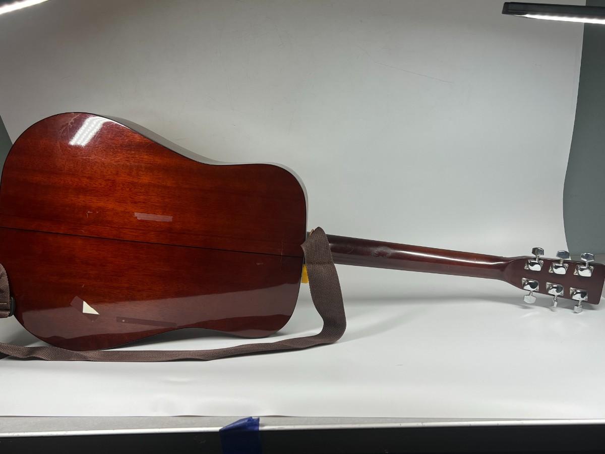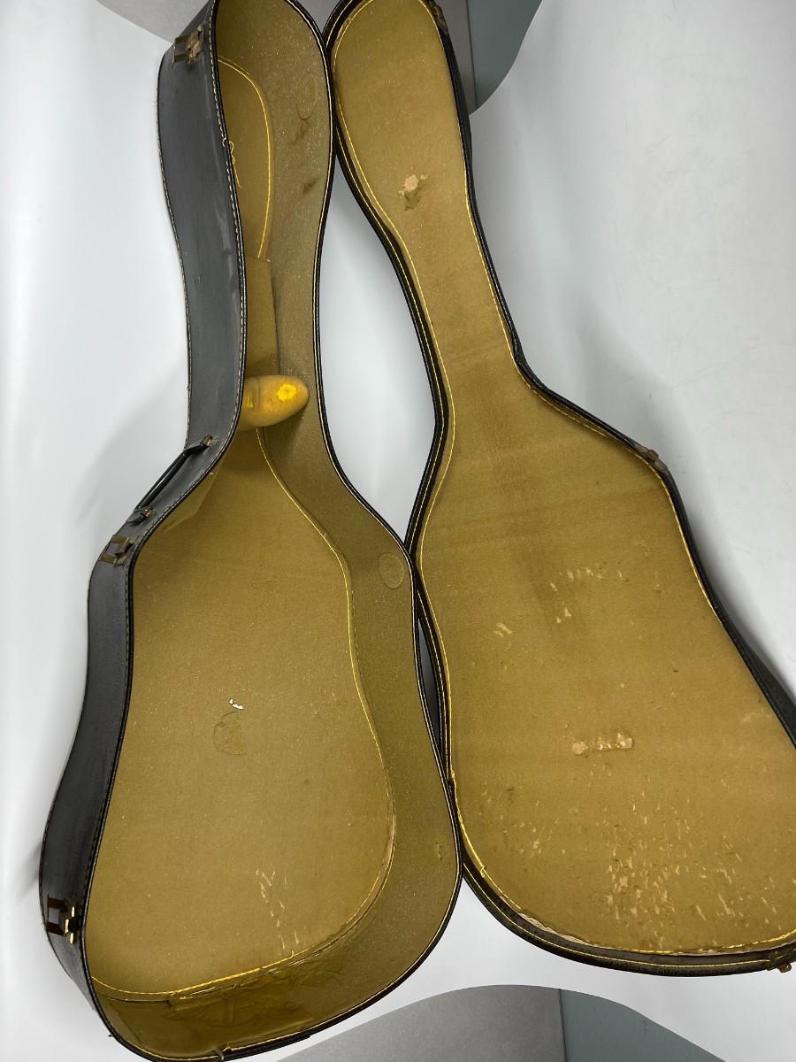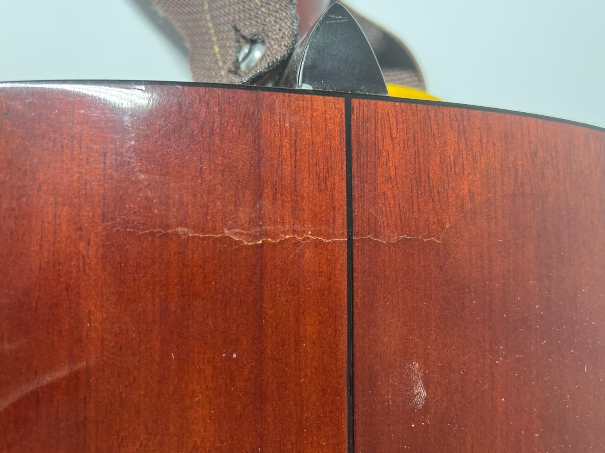 There is a light crack on the neck and a crack on the backside of the guitar, there is also some light wear but no other significant damage to the guitar. The action is a little high, but plays well. The case has some wear but no significant damage. Check pictures for more details and for sizing