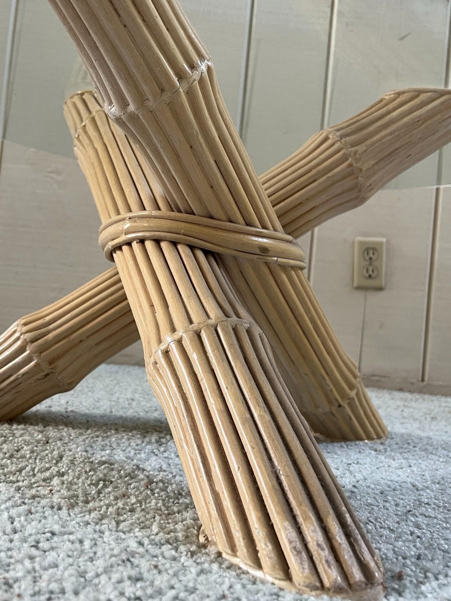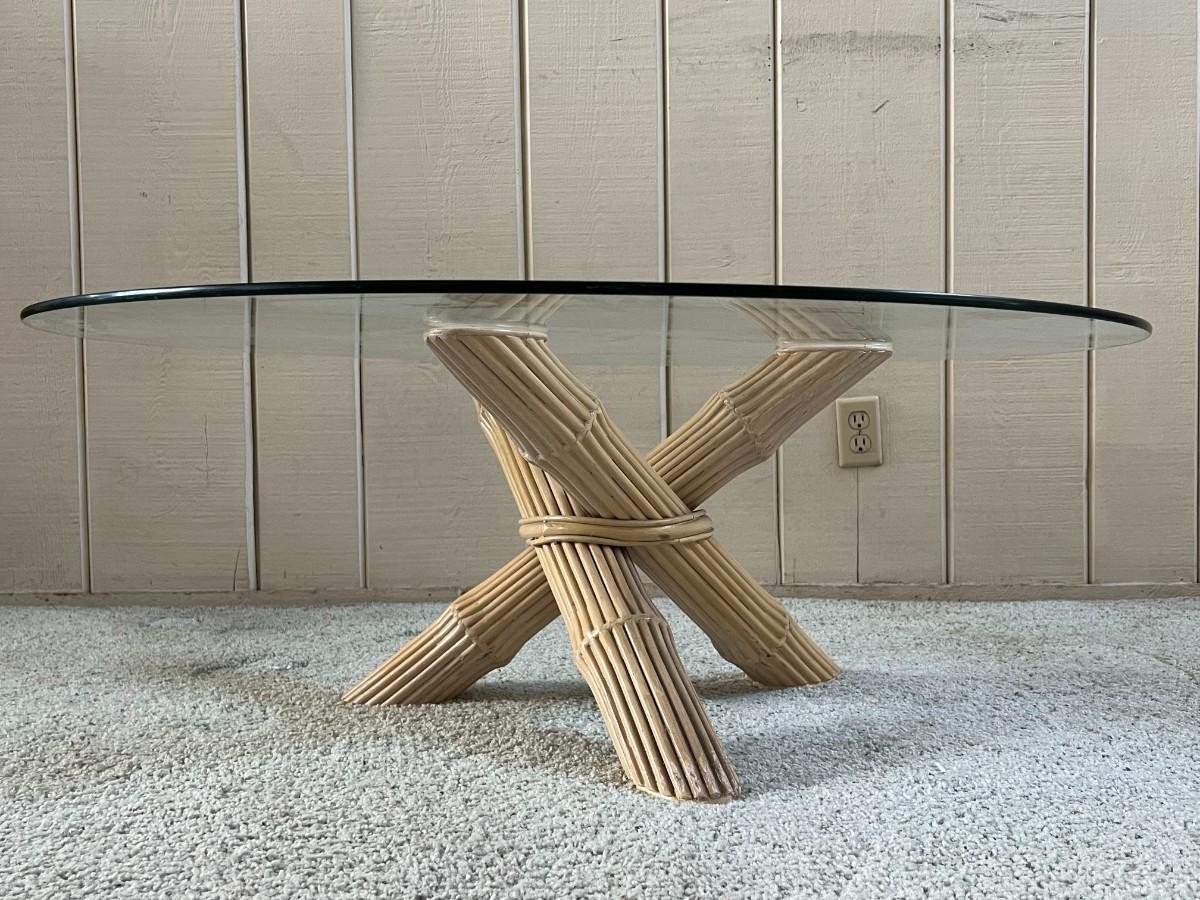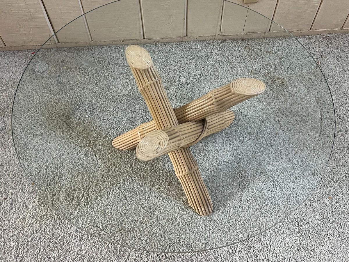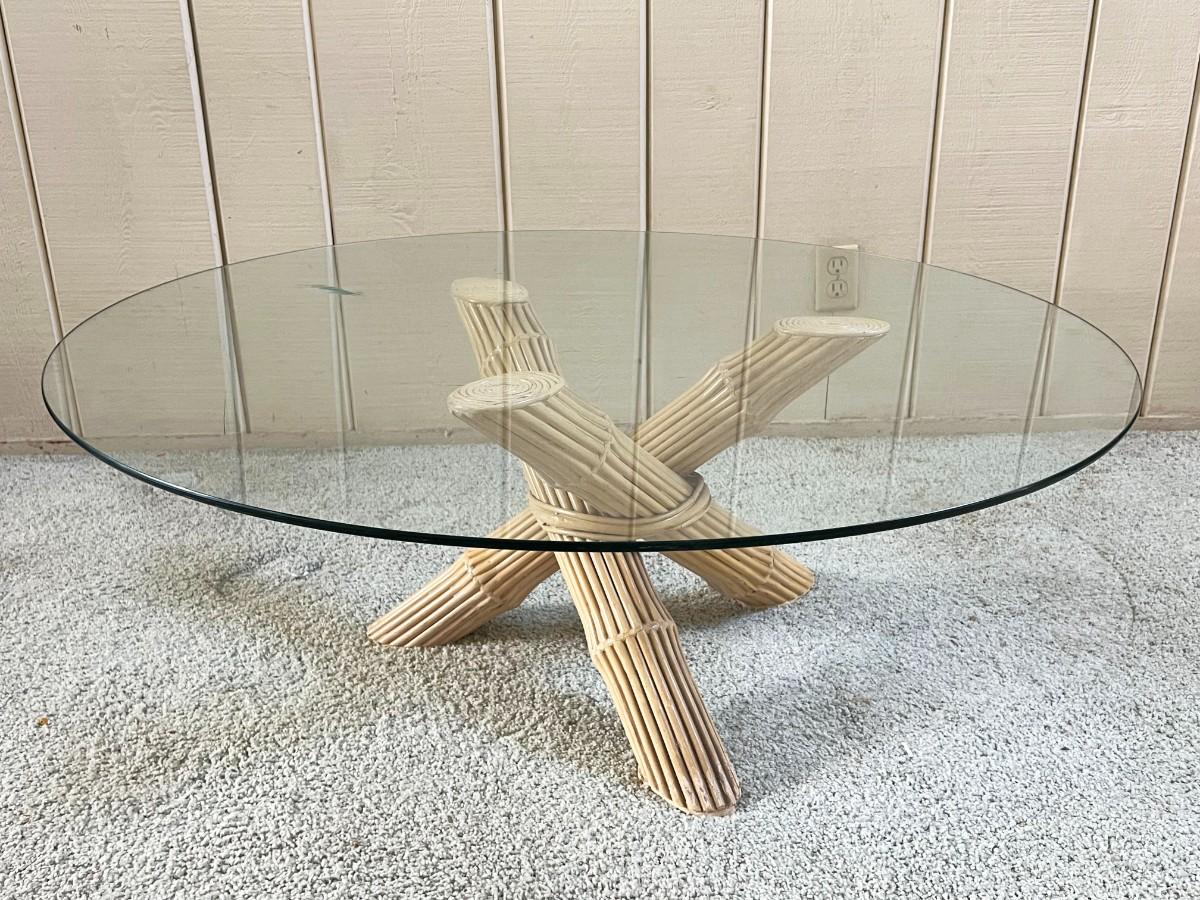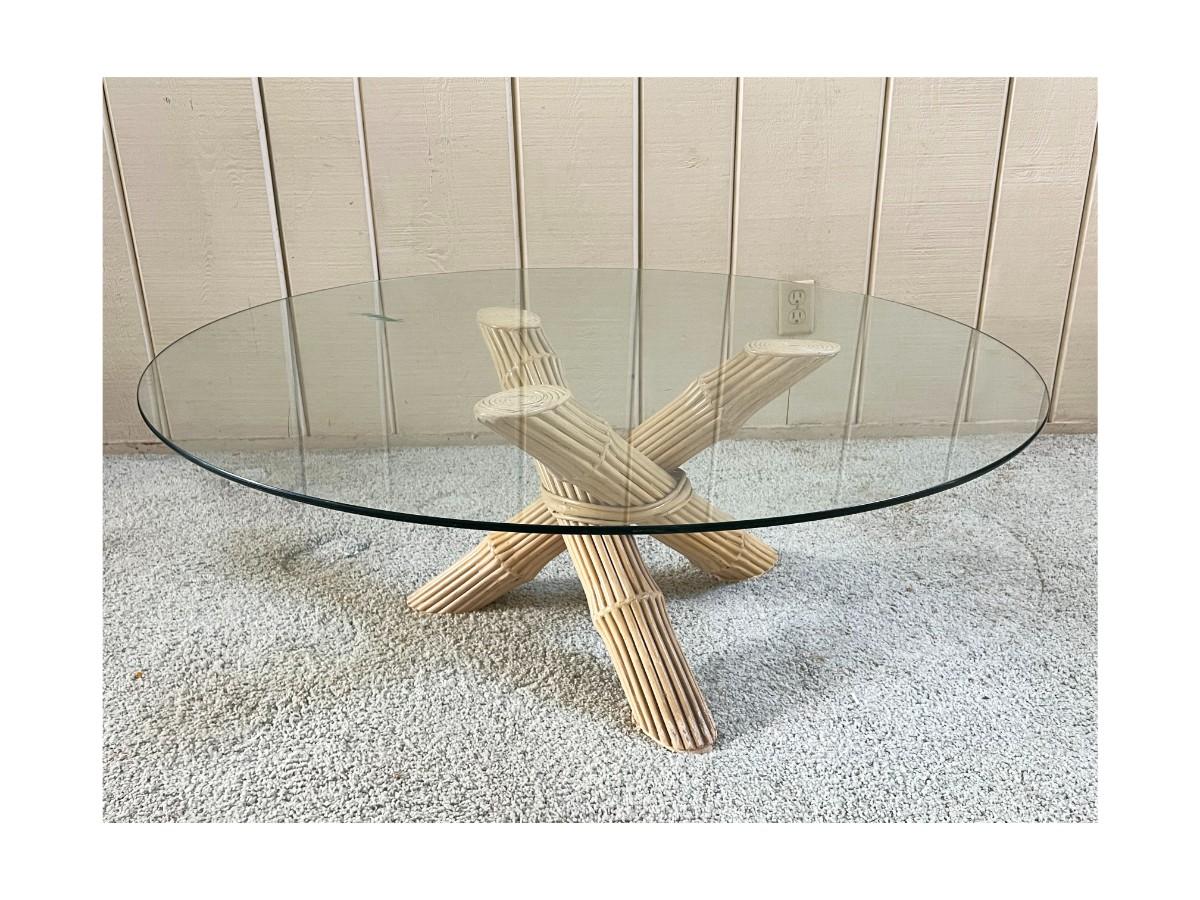 Retro 1980s White Painted Faux Bamboo Glass Top Coffee Table. In good condition. Almost 42" wide.