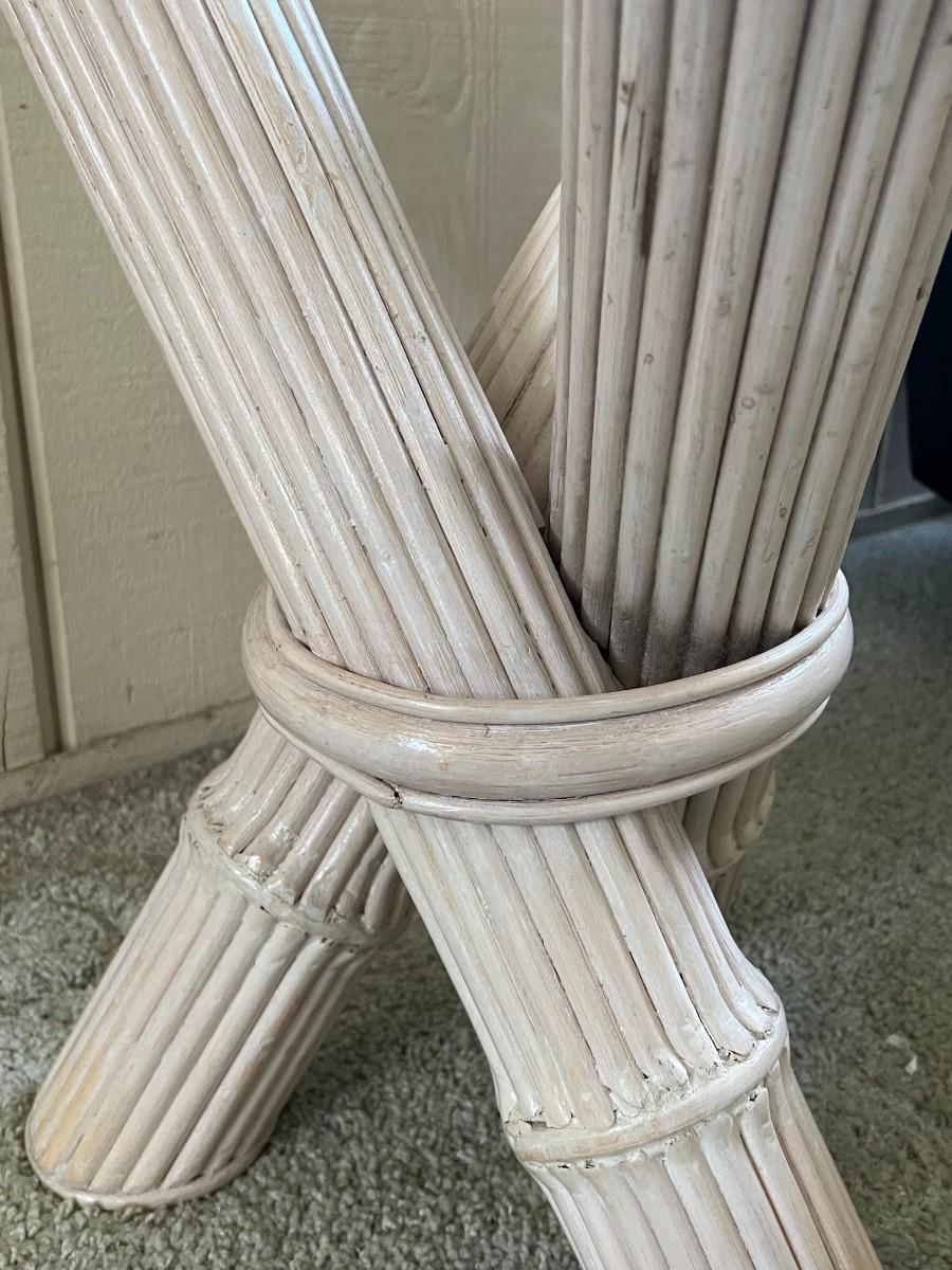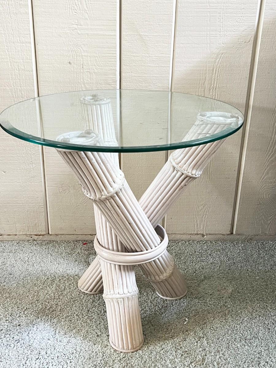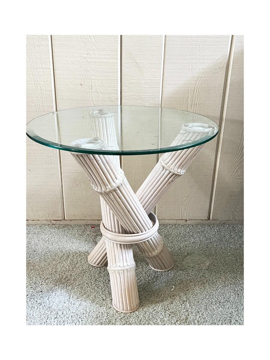 Retro 1980s White Painted Faux Bamboo Tripod Base Glass Round Side Table. Good condition.