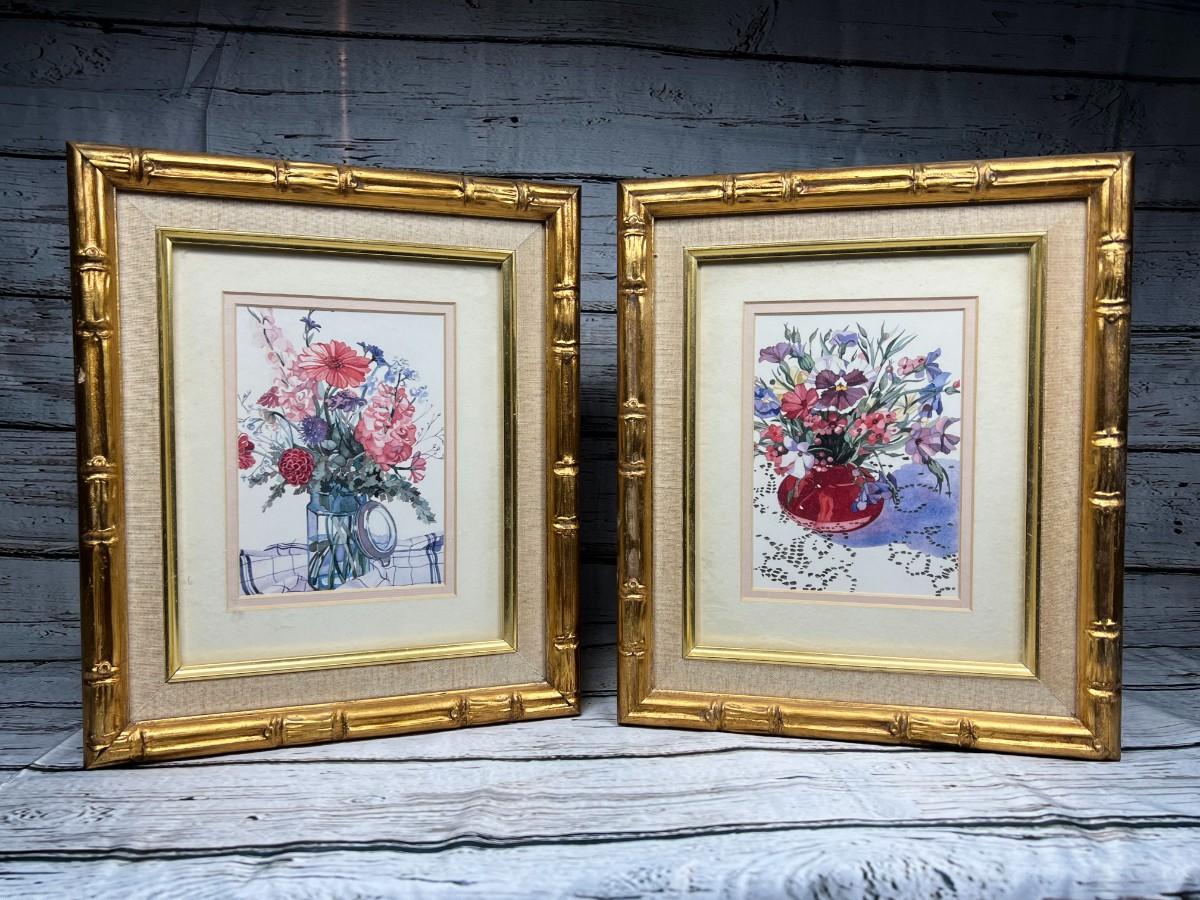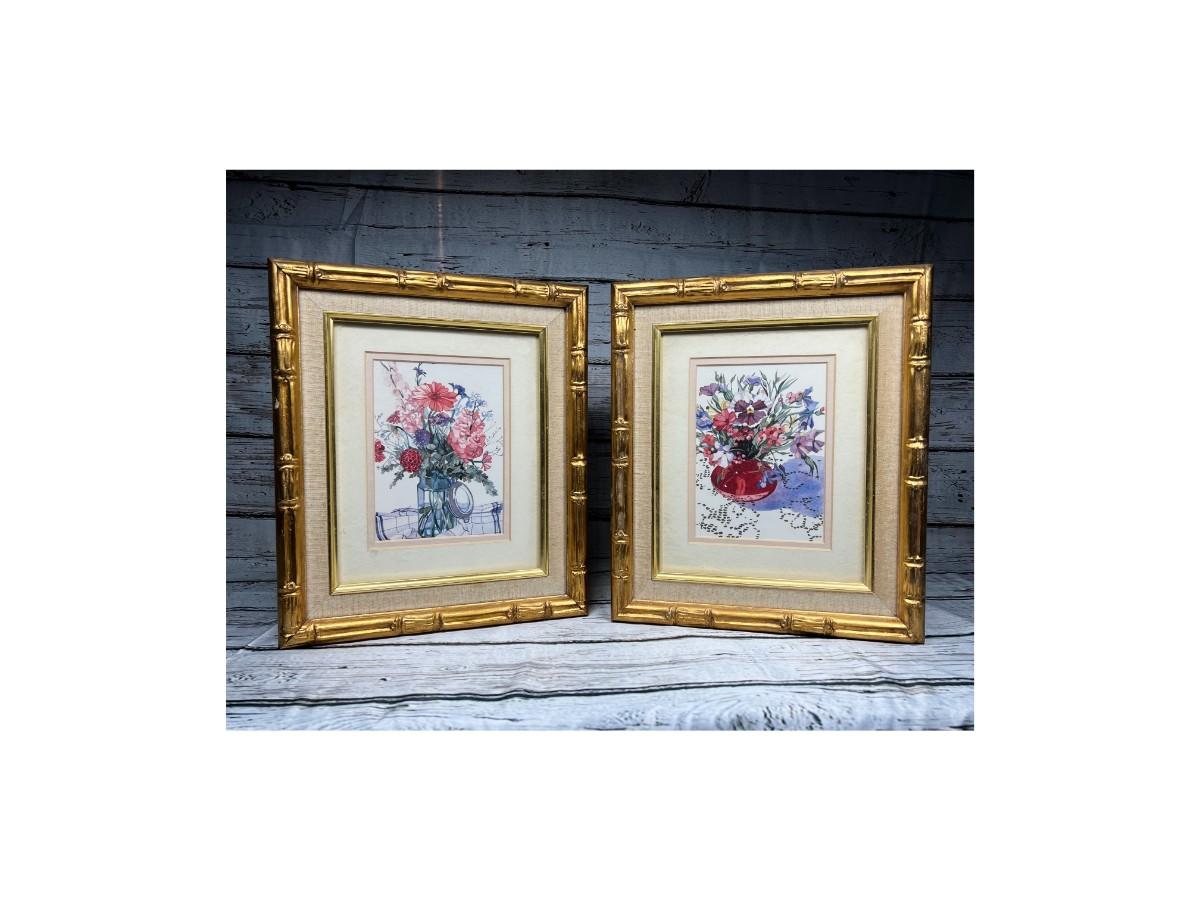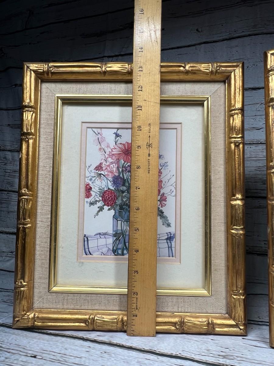 Retro 1989 Pansies and Blossoms Paintings by Shirley Chapman. Framed flower art, in faux bamboo style frames. Frames are about 13" on the longer side but art is on 8x10 canvas. Good condition.