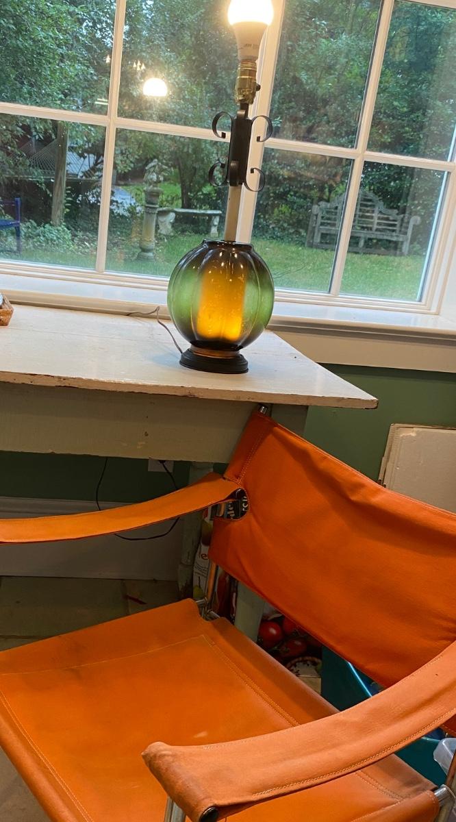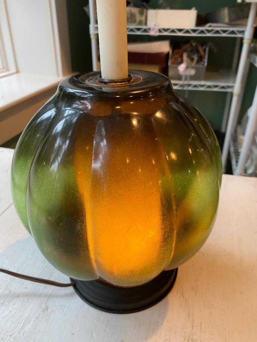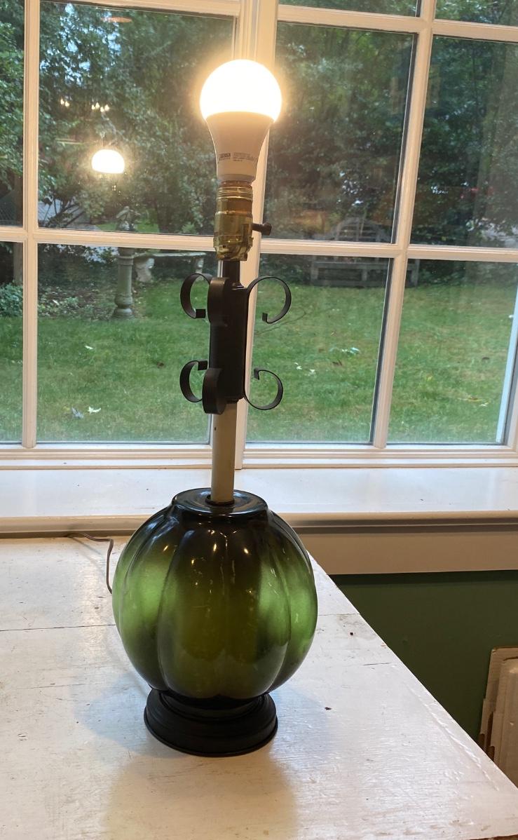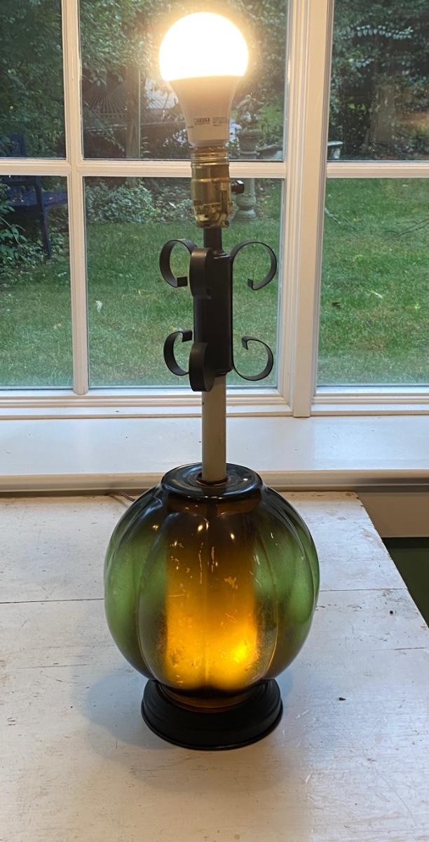 Cool retro lamp that can has avocado green ball which also can light up - gives it an orangish look. You can just light top bulb, inside ball bulb or both. Sort of gothic wrought iron black accent on top post. Works but no shade and bulb holder needs adjusting, doesn’’t stand straight.