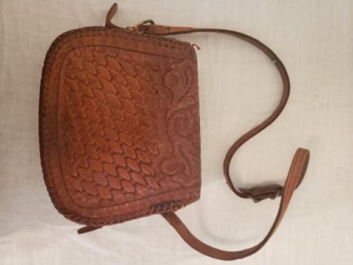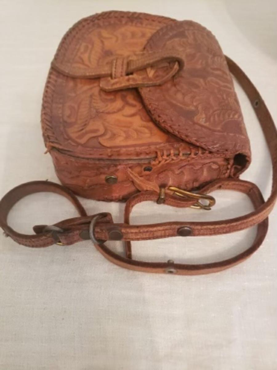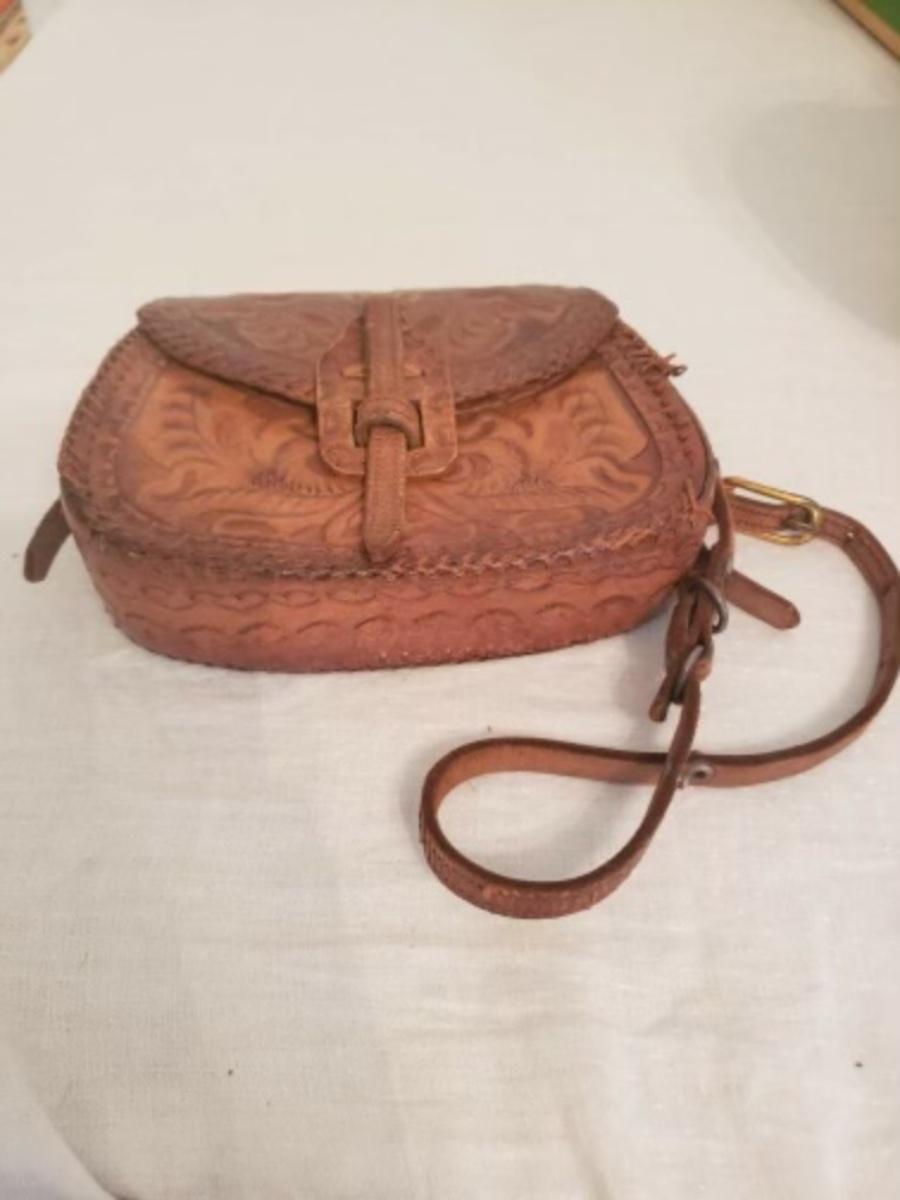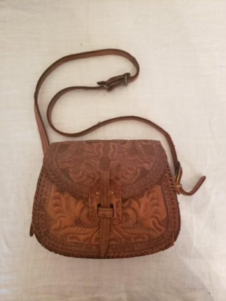 Retro 70s tooled leather Hippie crossbody purse