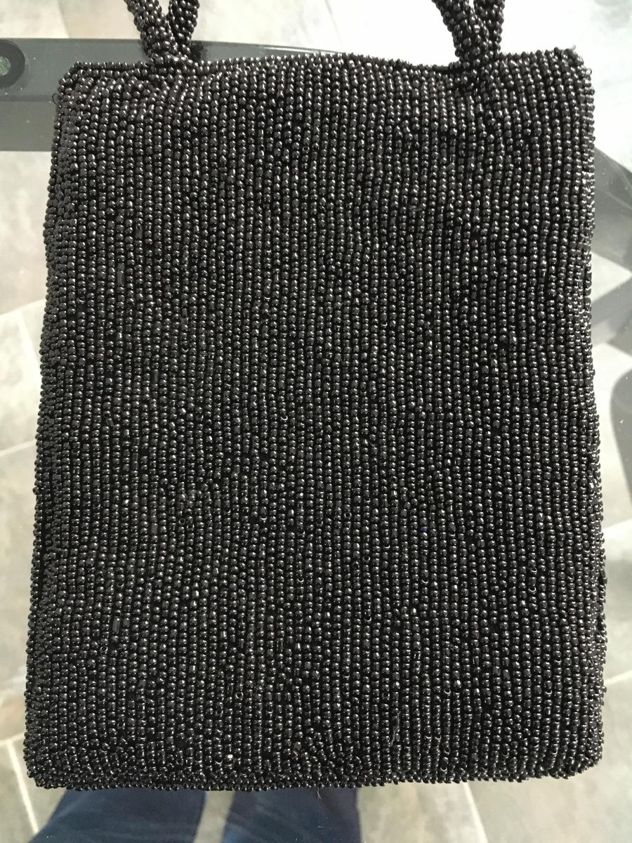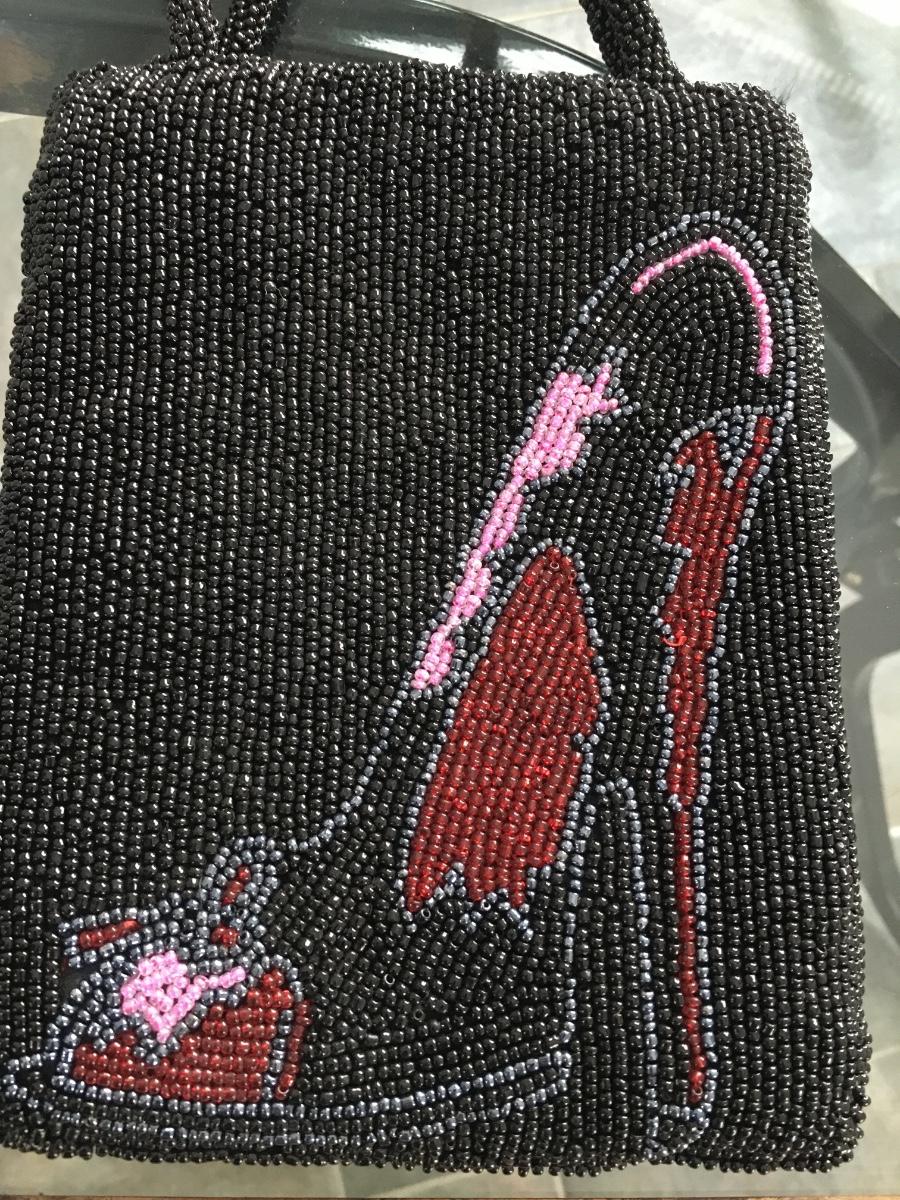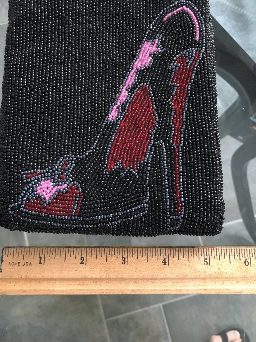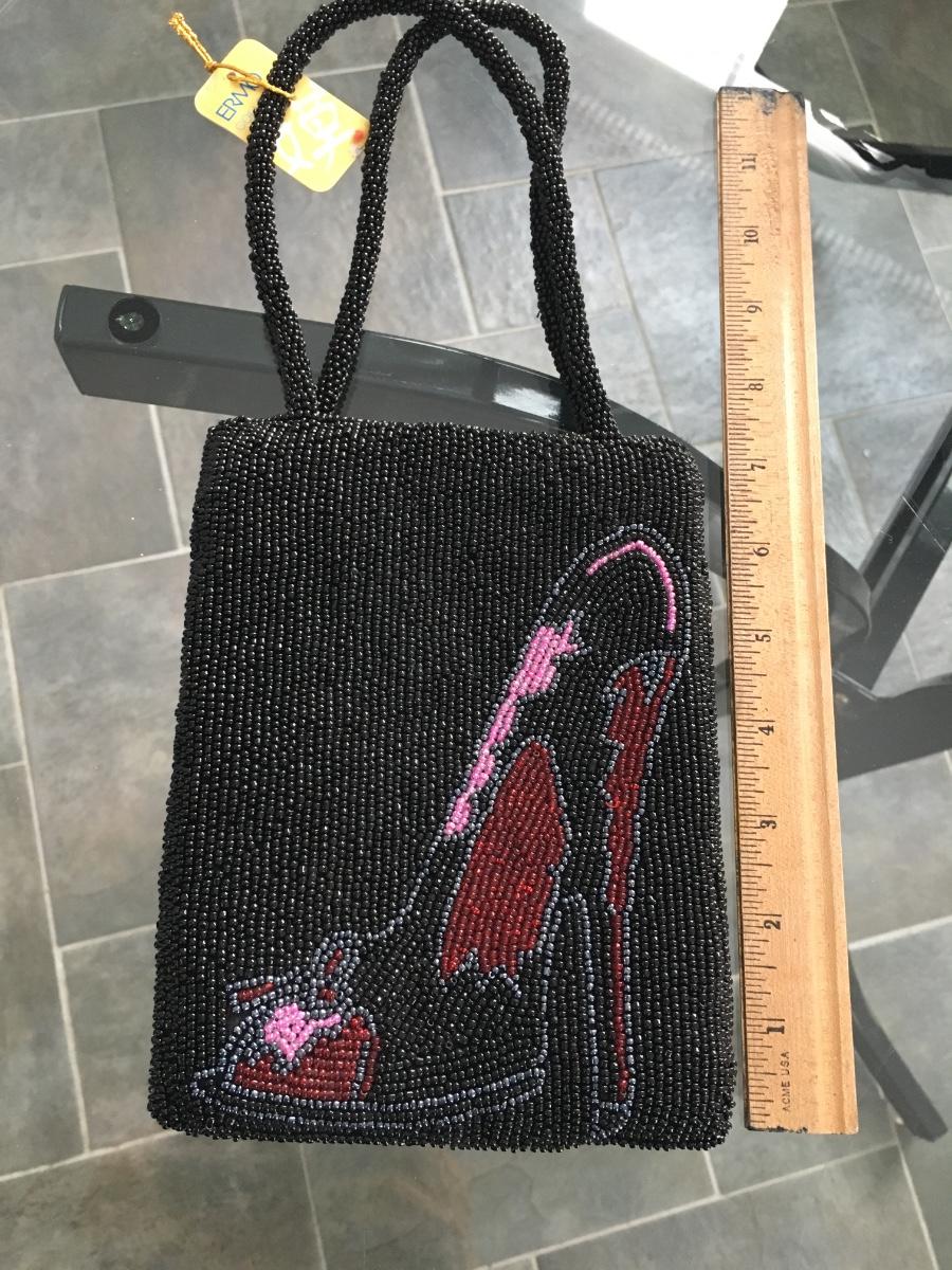 Whimsical small beaded evening bag with sho image. Tag atttached. Snaps closed.