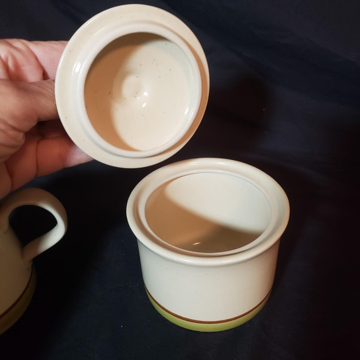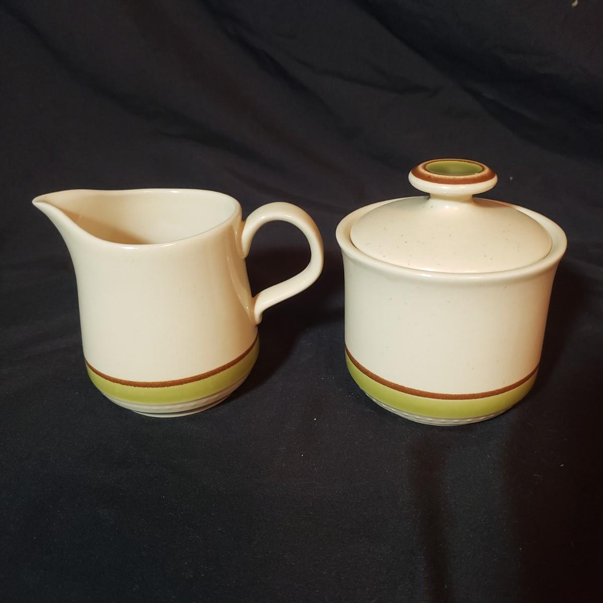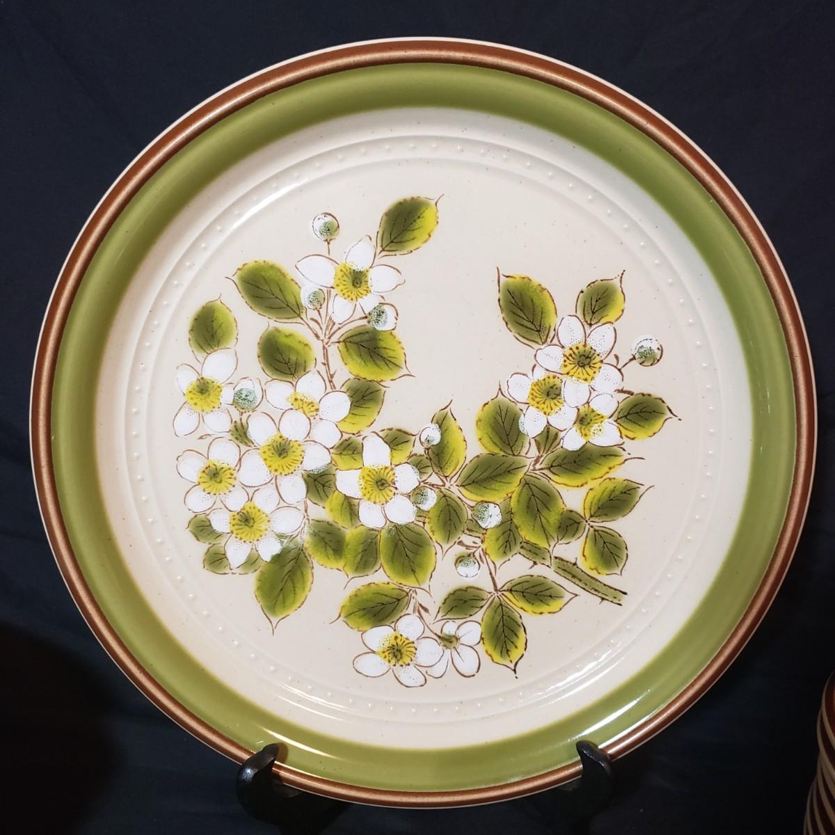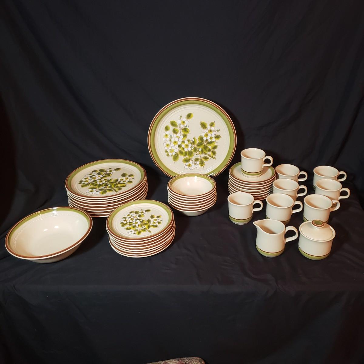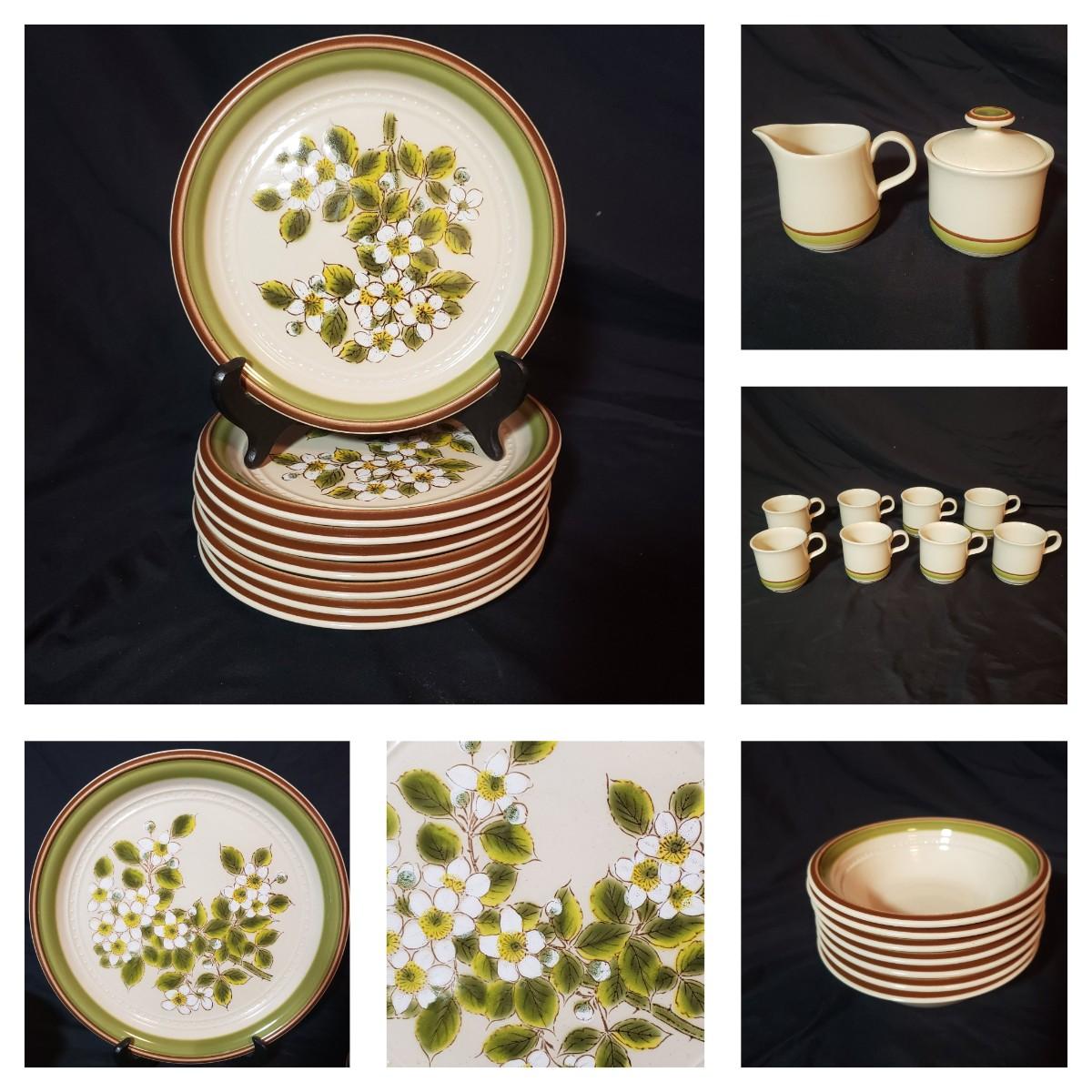 This is a reto dish set by Arita Fuji Tabletop Craftstone. Set comes with a platter (12"), a serving bowl, 8 dinner plates (11"), 8 small plates, 7 bowls, a creamer and sugar bowl and 8 mugs with saucers. There are some chips on some dishes, see pictures for details.