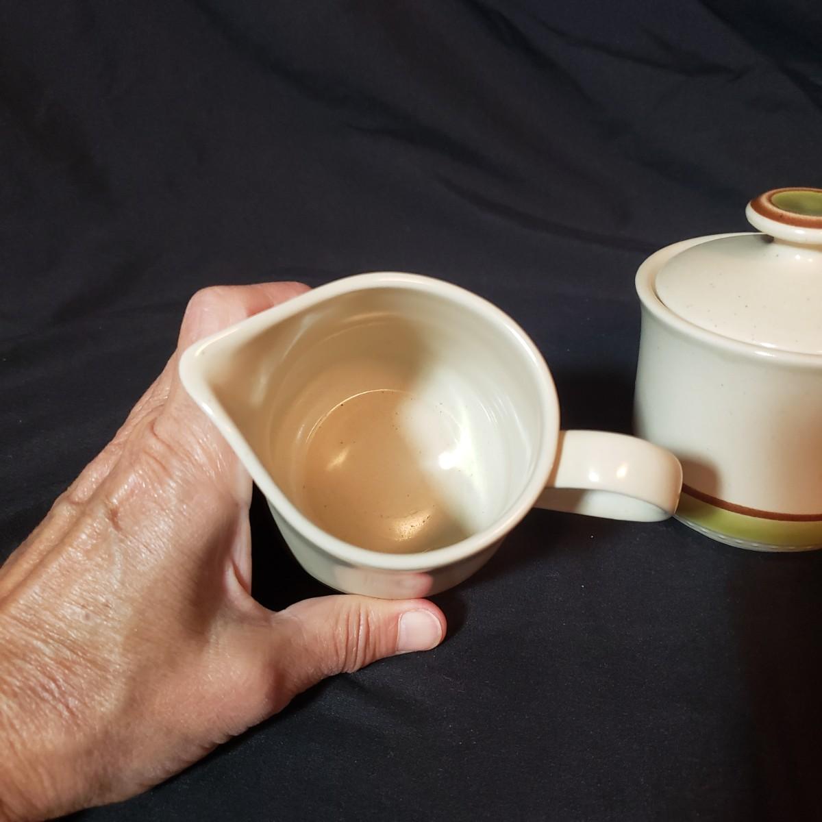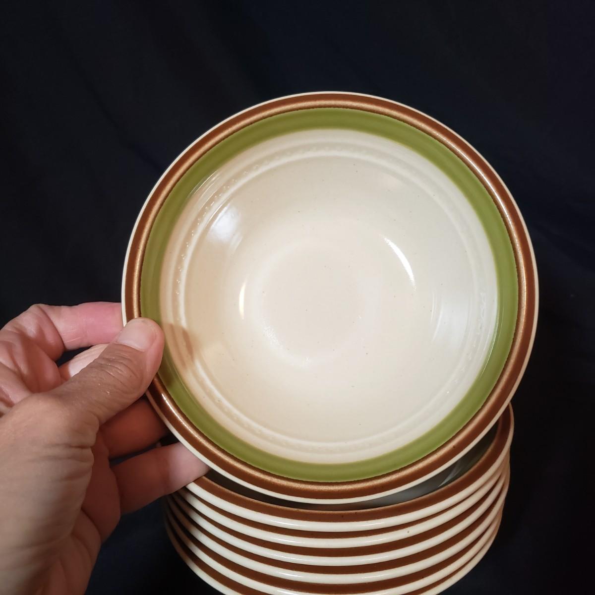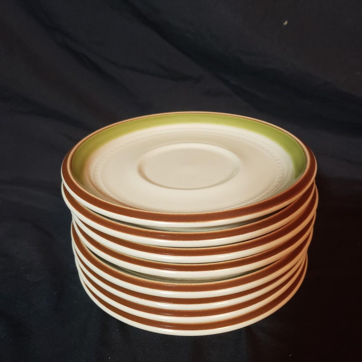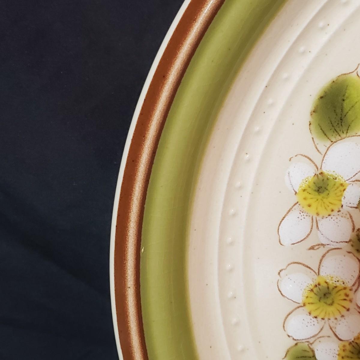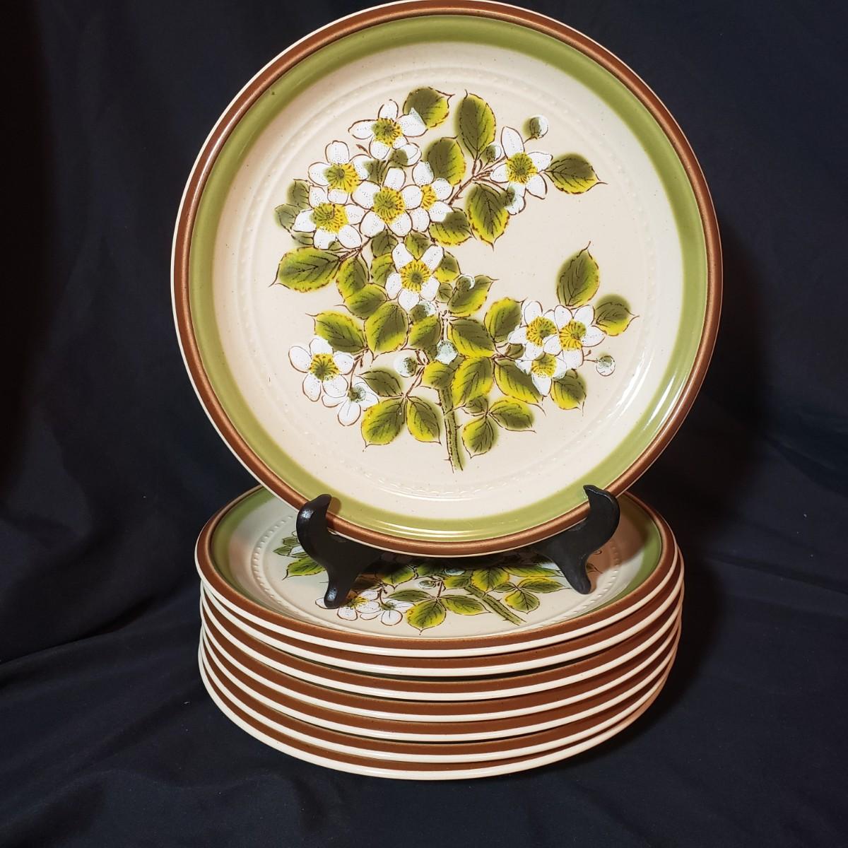 This is a reto dish set by Arita Fuji Tabletop Craftstone. Set comes with a platter (12"), a serving bowl, 8 dinner plates (11"), 8 small plates, 7 bowls, a creamer and sugar bowl and 8 mugs with saucers. There are some chips on some dishes, see pictures for details.