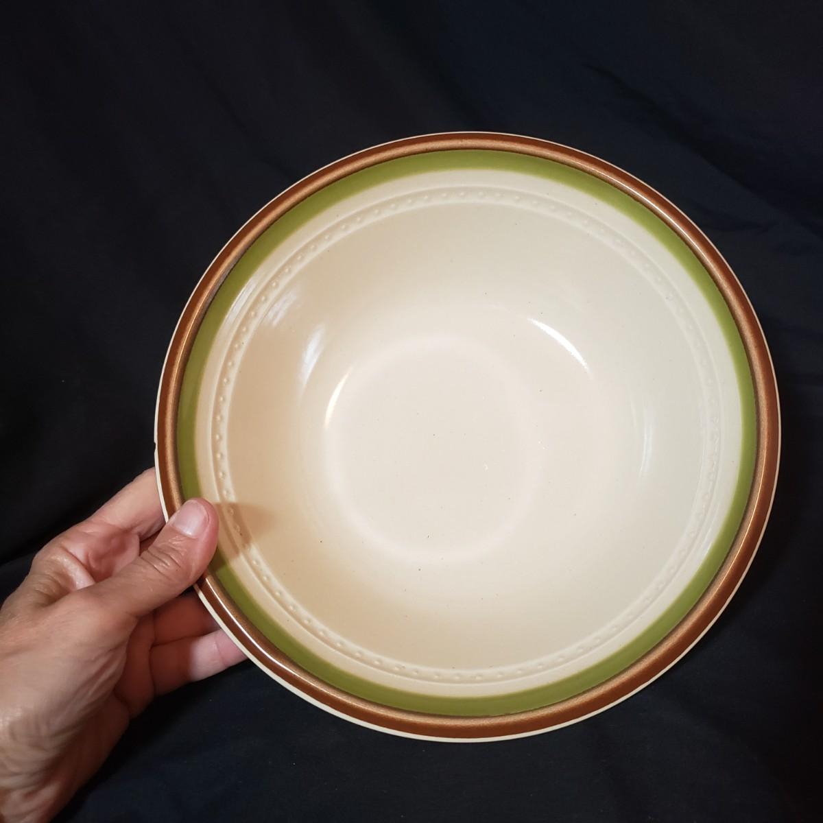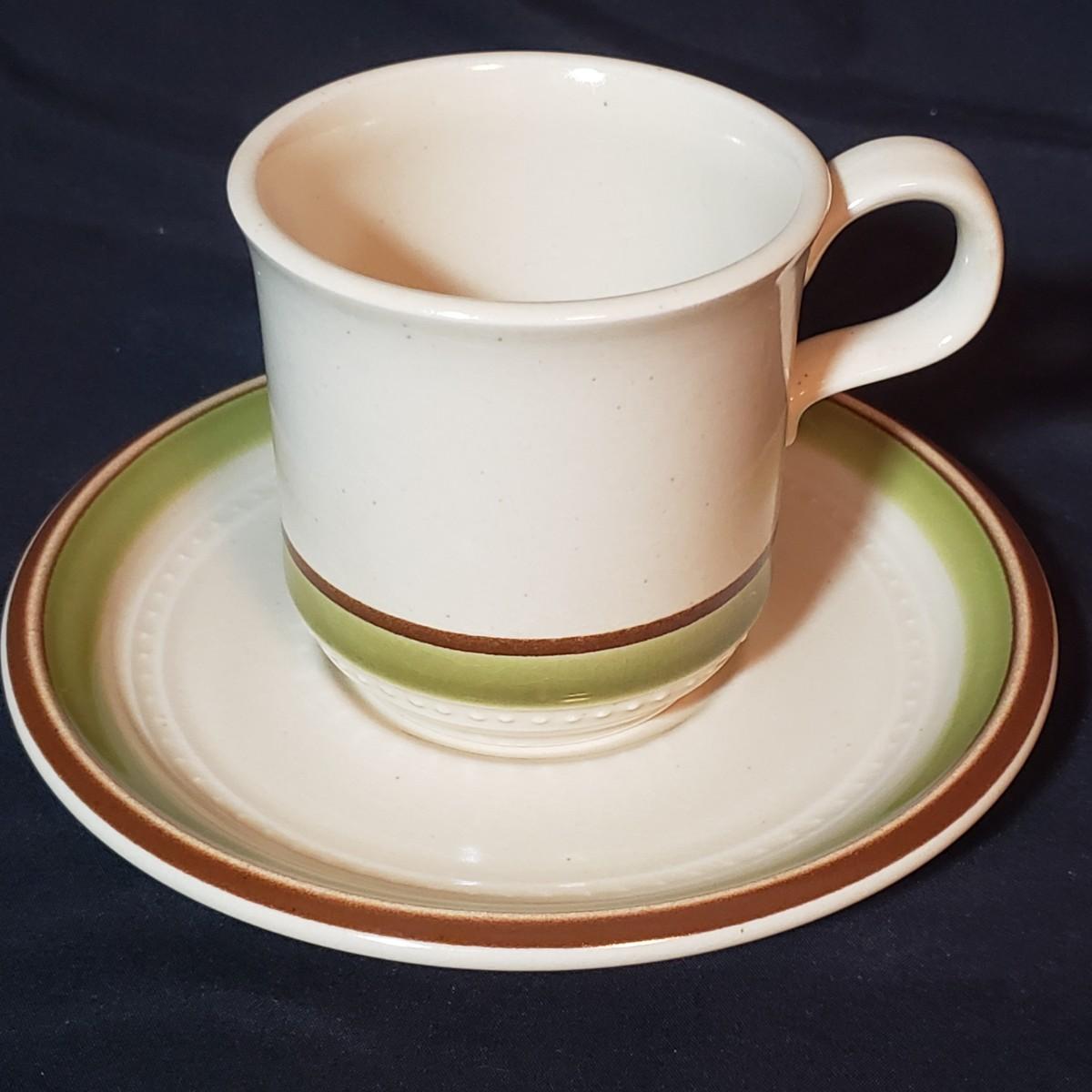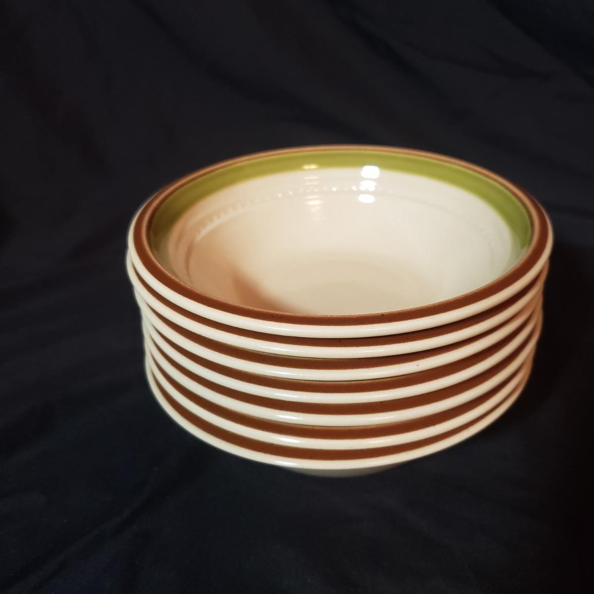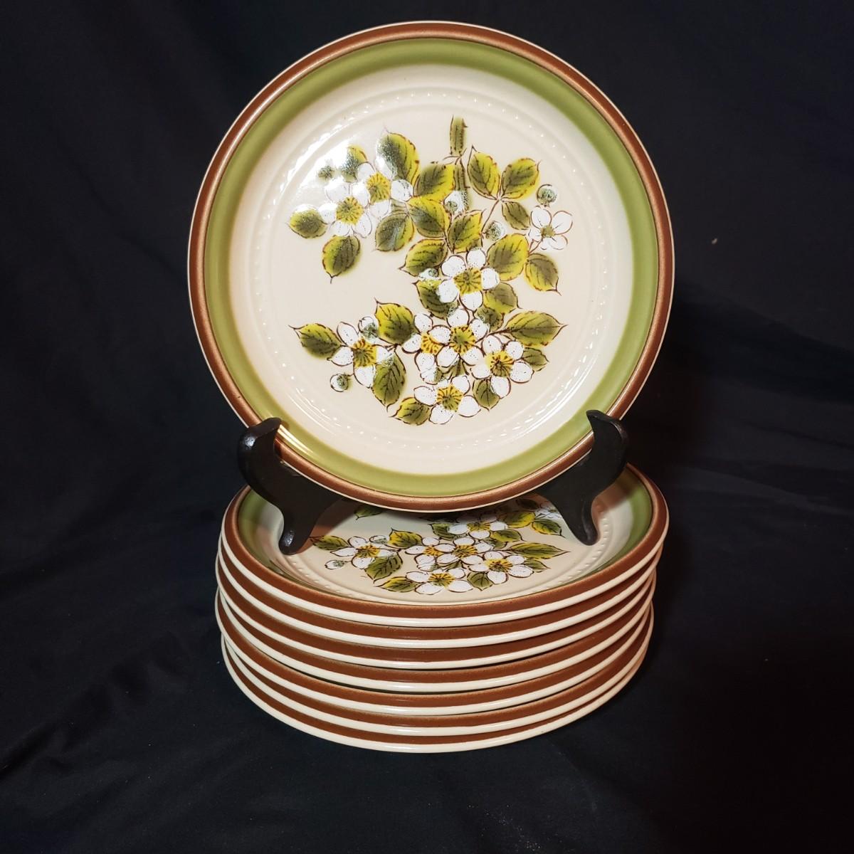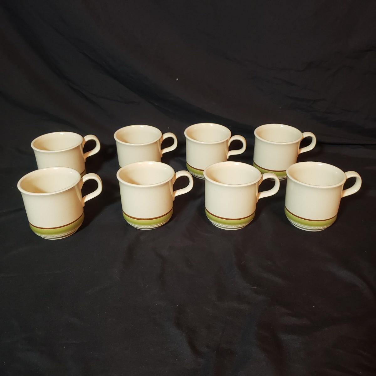 This is a reto dish set by Arita Fuji Tabletop Craftstone. Set comes with a platter (12"), a serving bowl, 8 dinner plates (11"), 8 small plates, 7 bowls, a creamer and sugar bowl and 8 mugs with saucers. There are some chips on some dishes, see pictures for details.