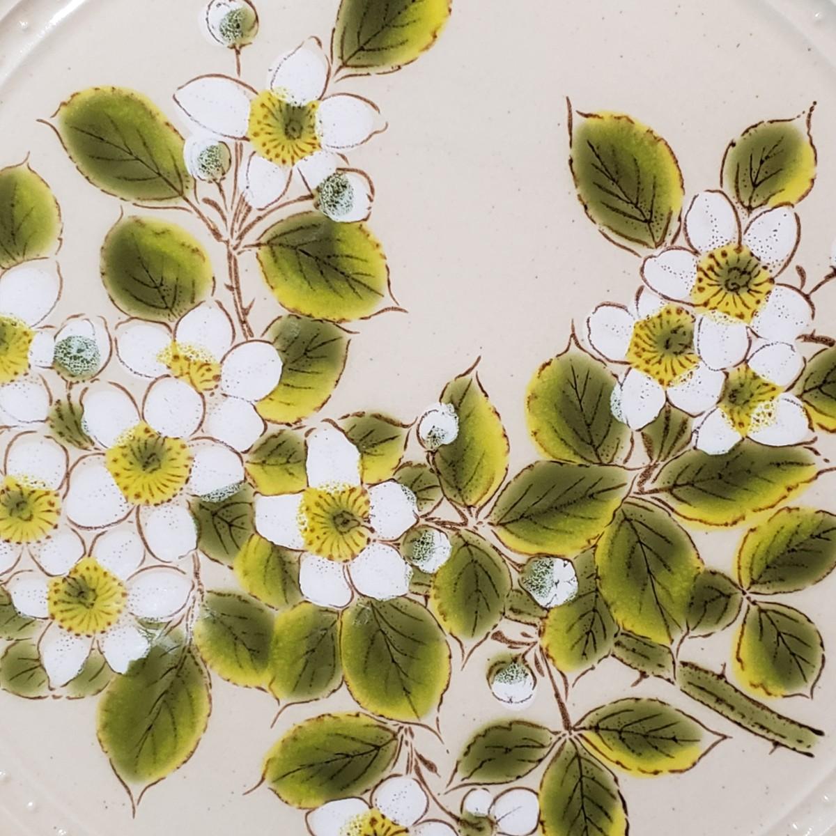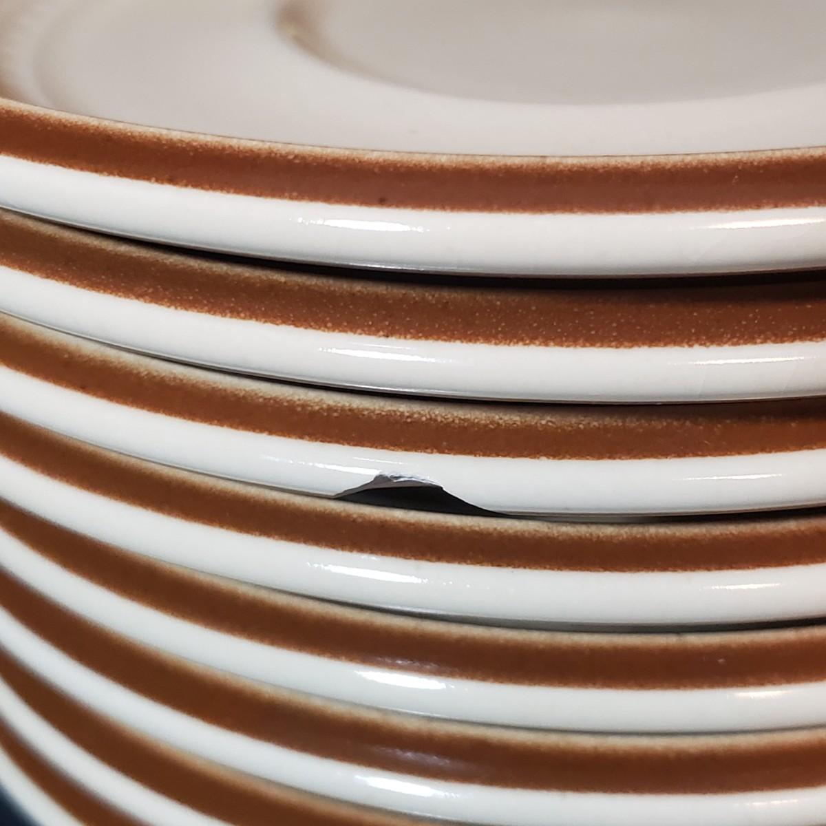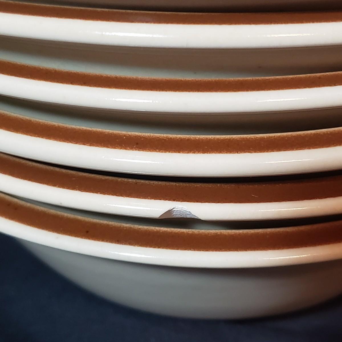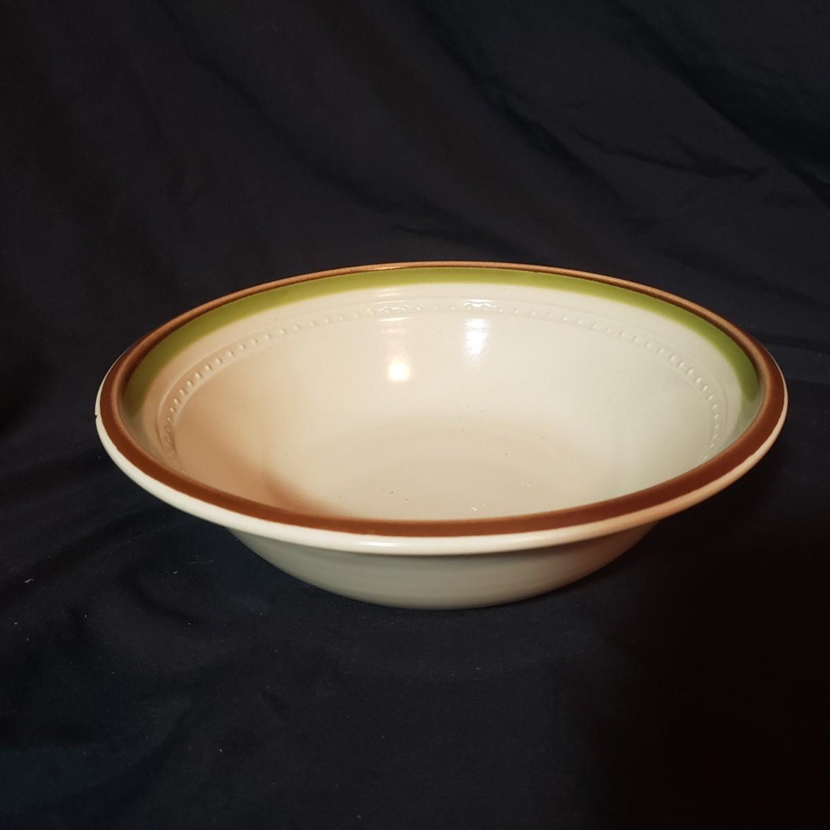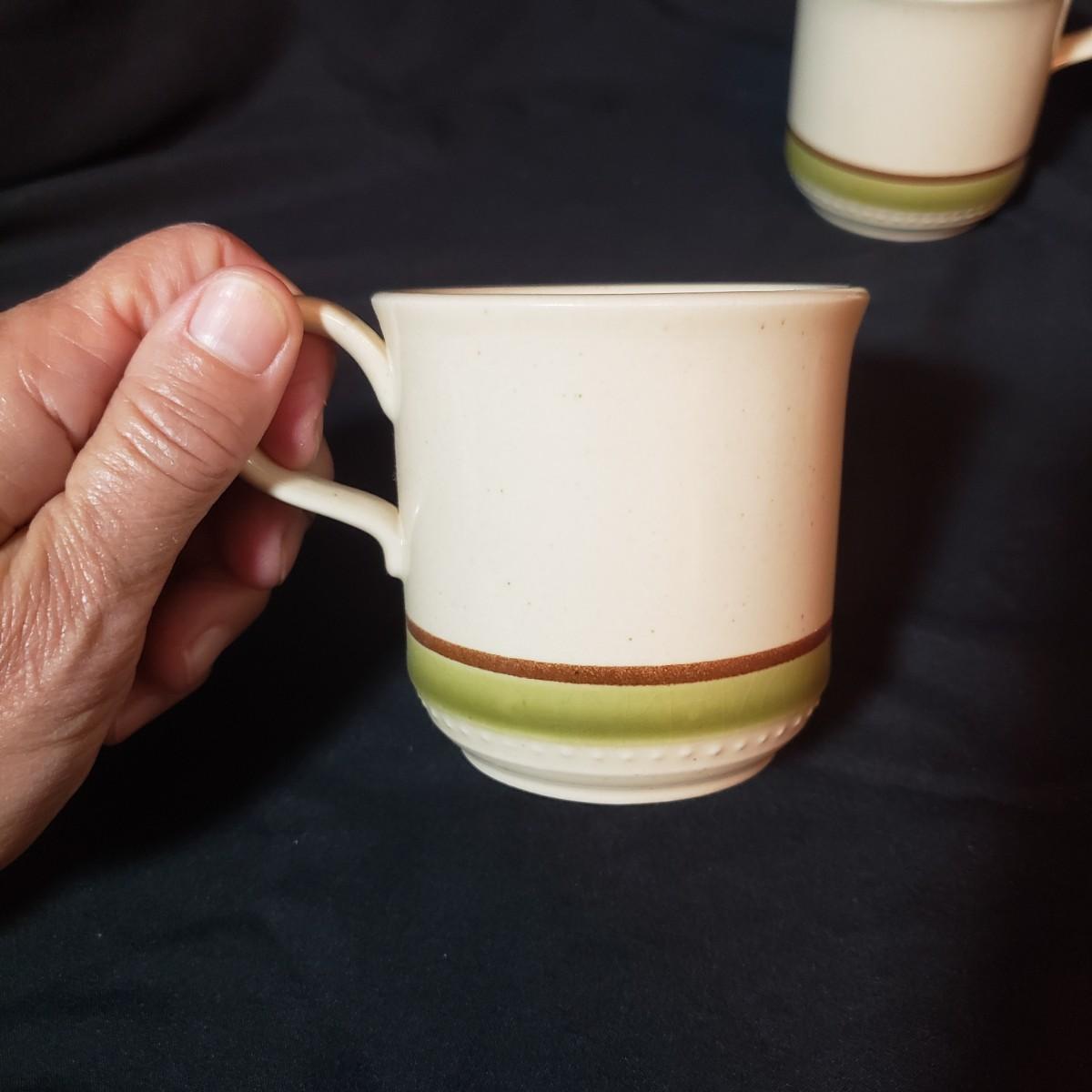 This is a reto dish set by Arita Fuji Tabletop Craftstone. Set comes with a platter (12"), a serving bowl, 8 dinner plates (11"), 8 small plates, 7 bowls, a creamer and sugar bowl and 8 mugs with saucers. There are some chips on some dishes, see pictures for details.