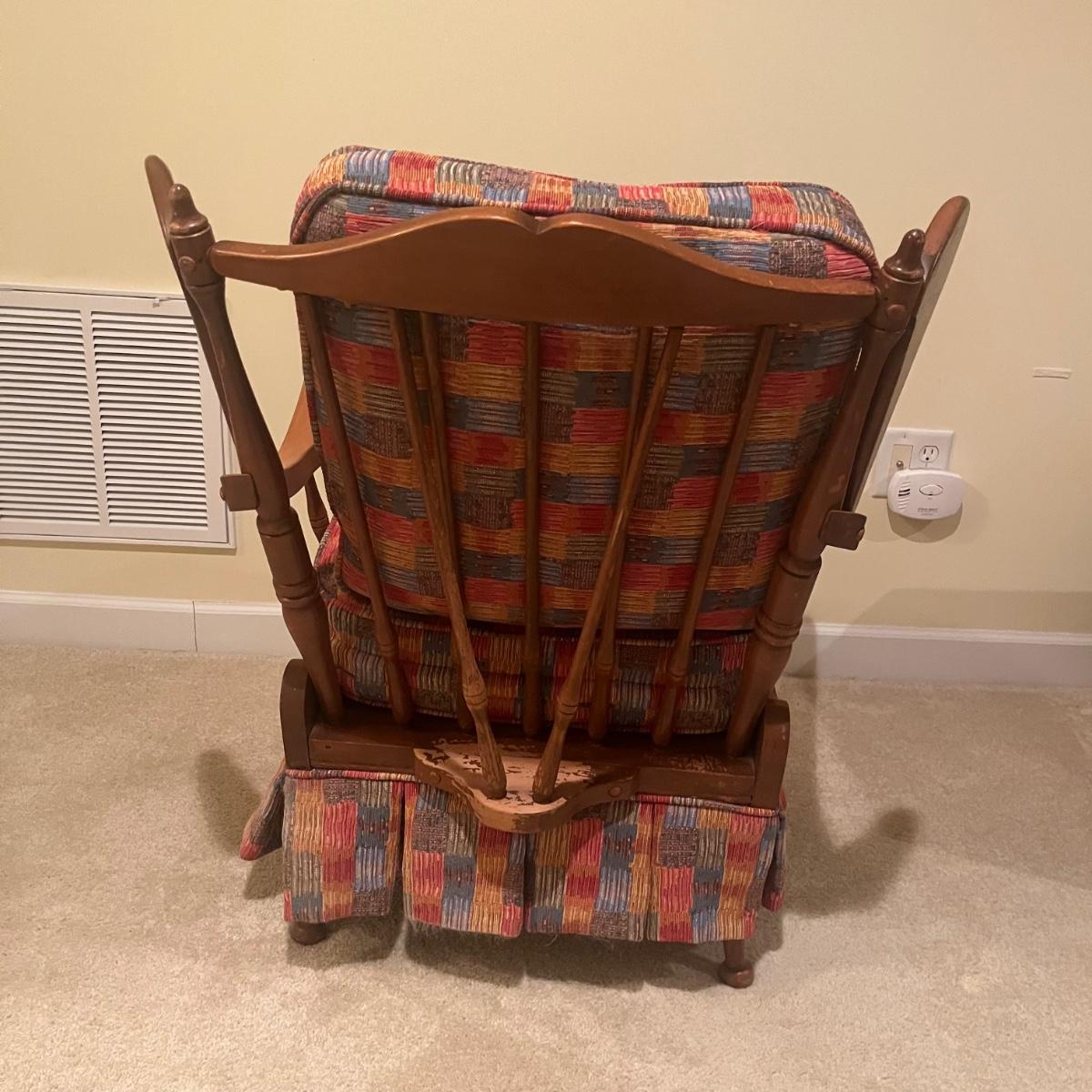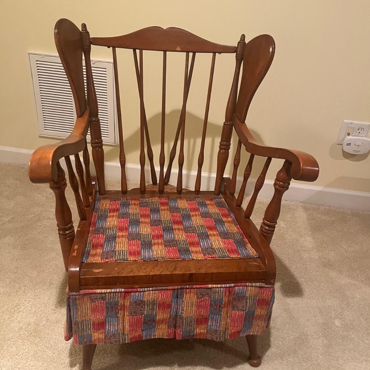 Lot includes a retro spindle back armchair rocker with two removable cushions. Chair has parts of the finish coming off, see pictures. Chair measures 31” x 28” x 32”H with a 20” seat height. Local pickup only. Winning bidder must bring assistance to help move and load this item due to its weight and/or size. Chair is up one flight of stairs.