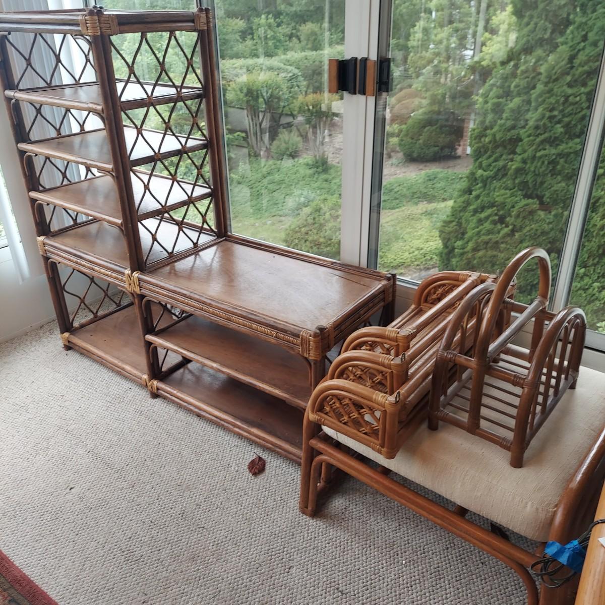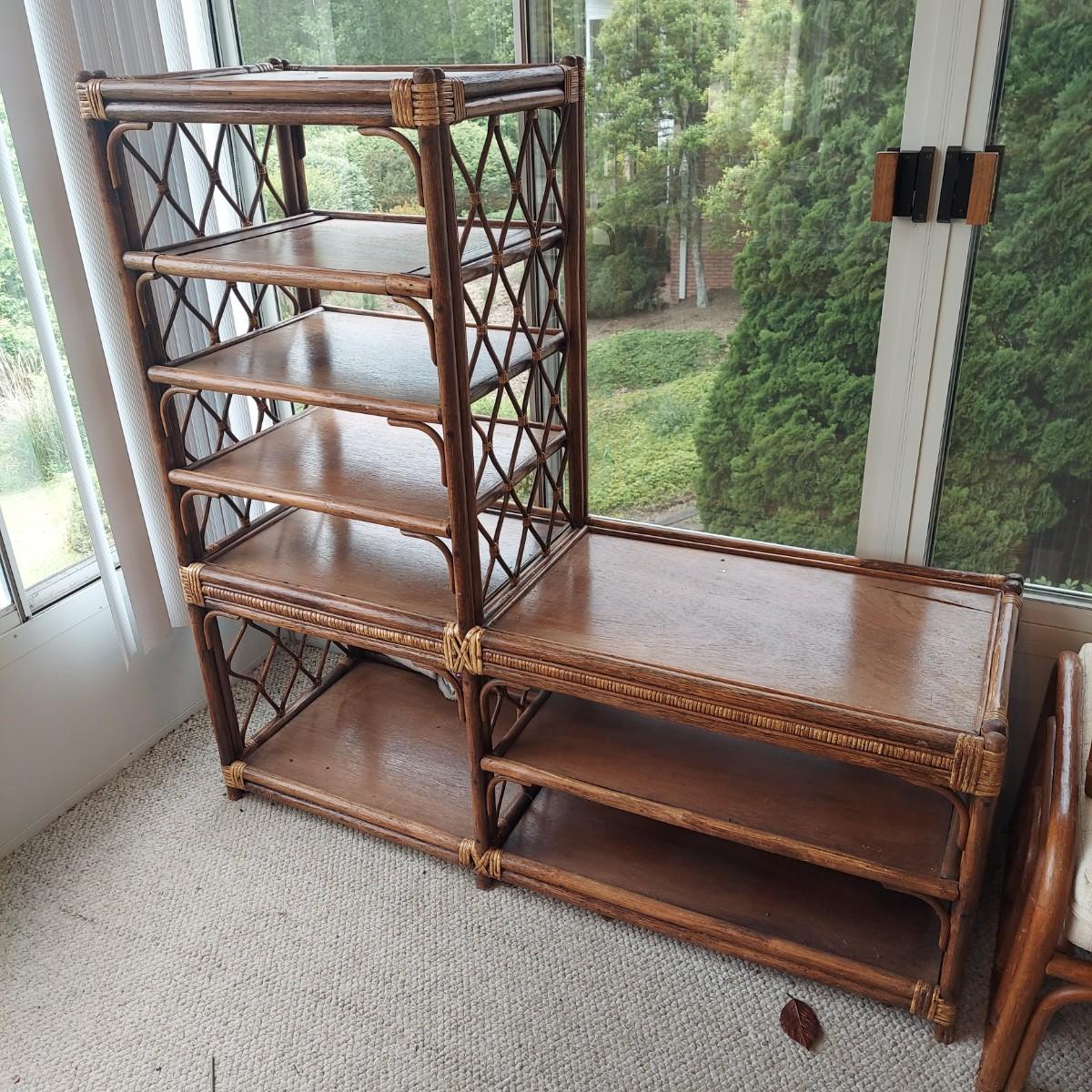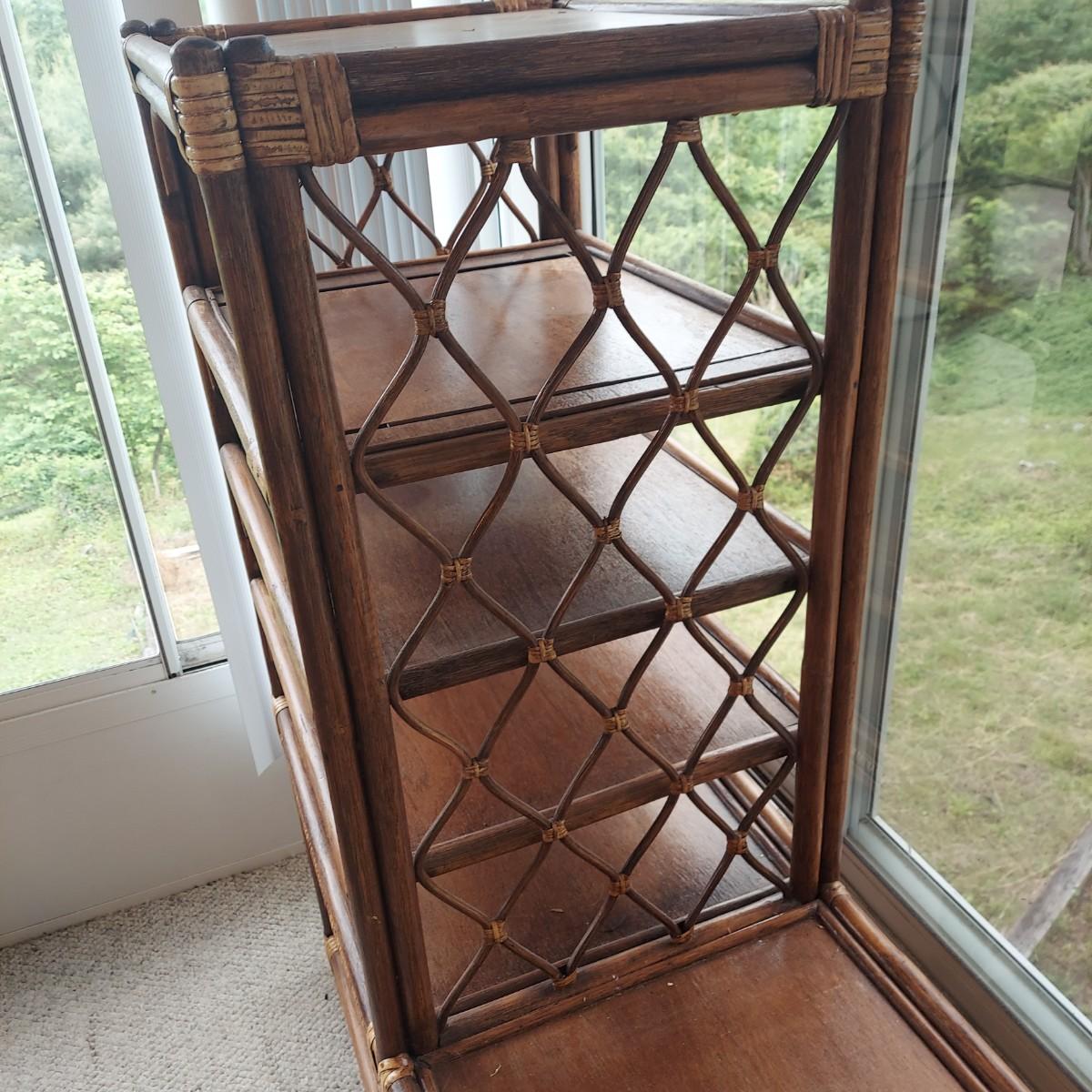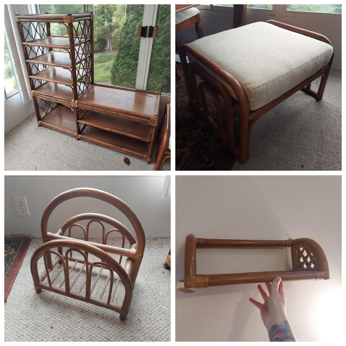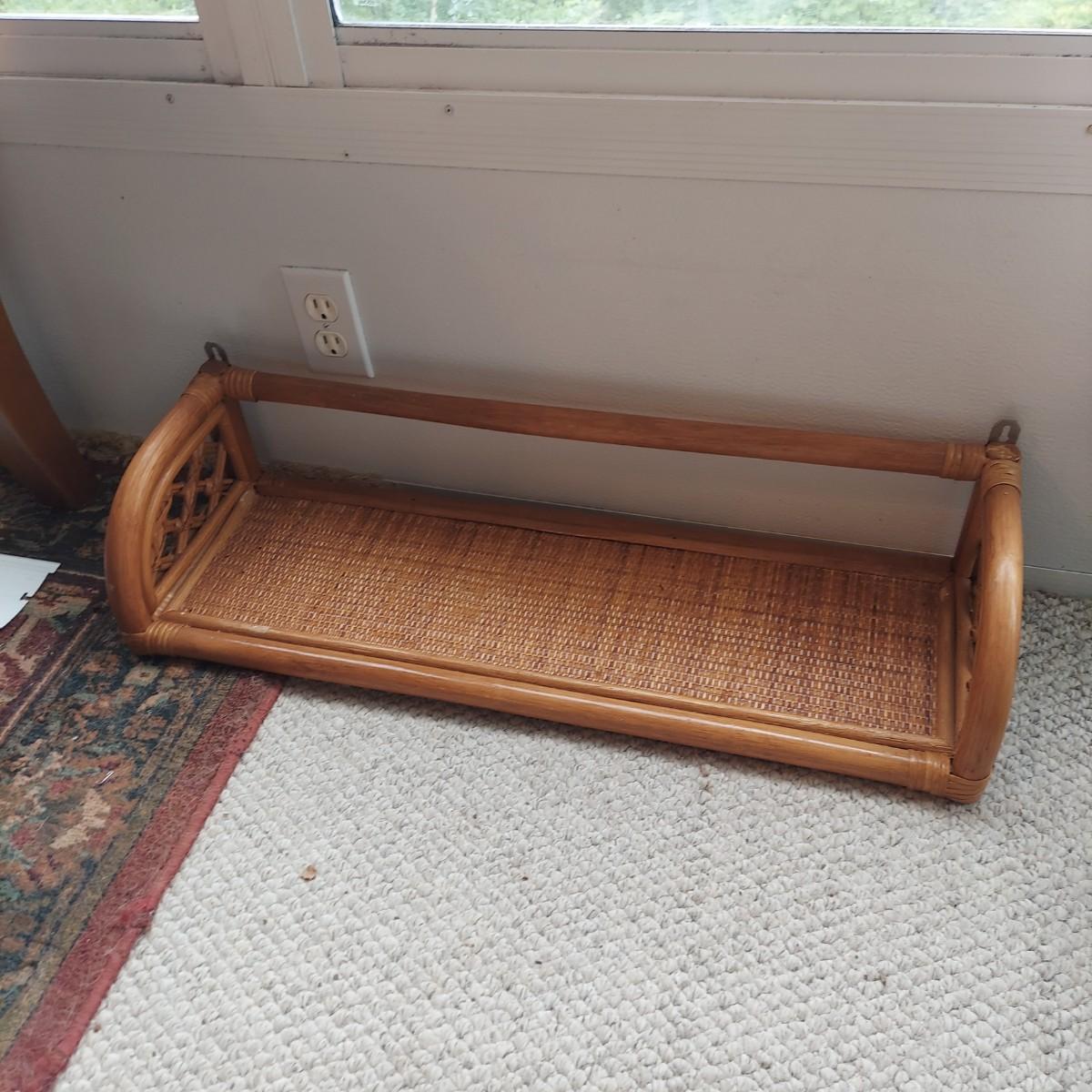 Four pieces of retro bamboo furniture and decor including a two-tier shelving unit, an ottoman with a removable cushion, three wall shelves and and magazine rack. The shelving unit measures 55” x 20” x 54"H. The ottoman is 27” x 24” with an 18"H seat height. The shelves are 18”, 24” & 30” long. Some condition issues. Please see photos for details. Local Pickup Only. Winning bidder must bring assistance to help move and load this item due to its weight and/or size.