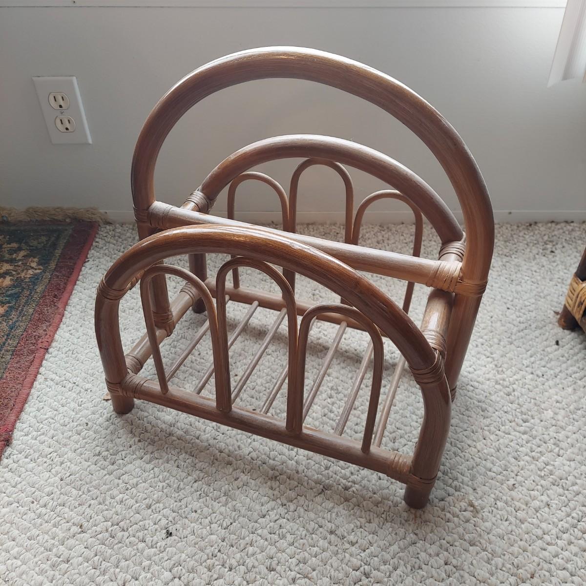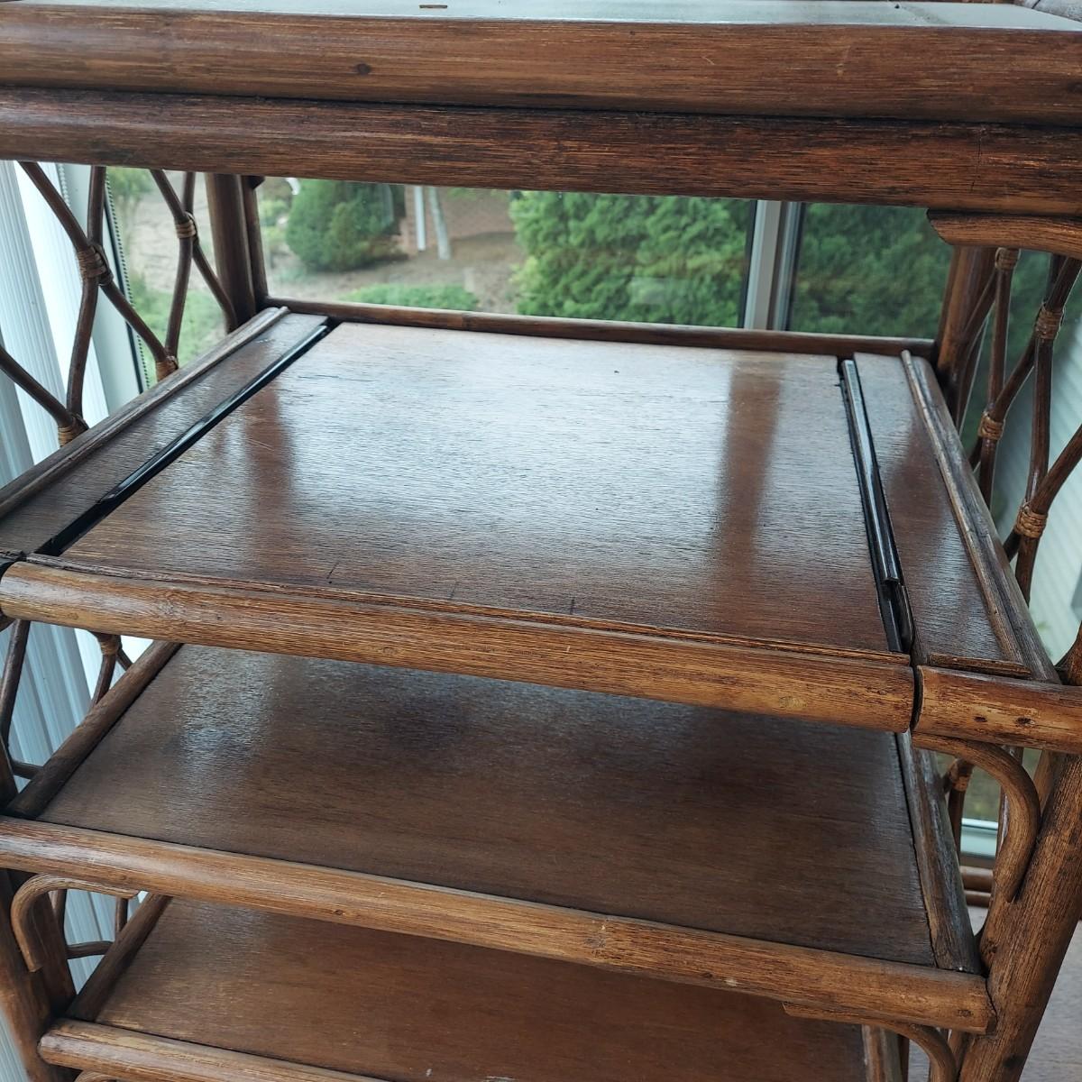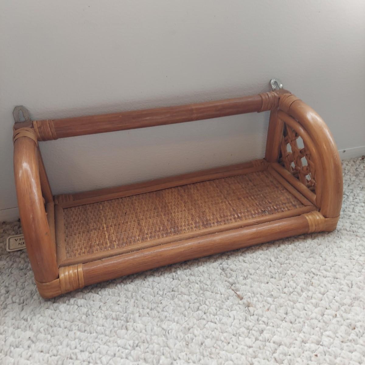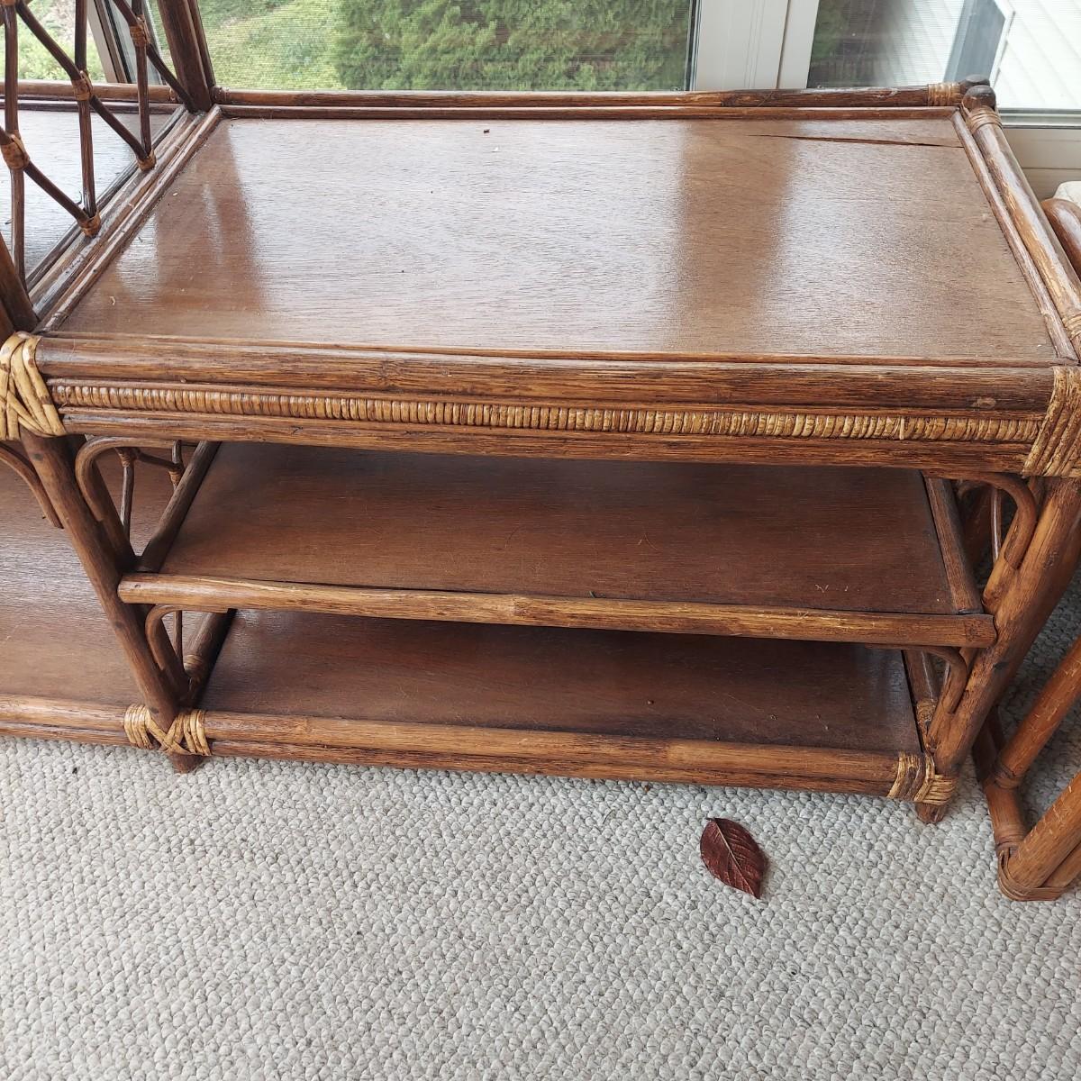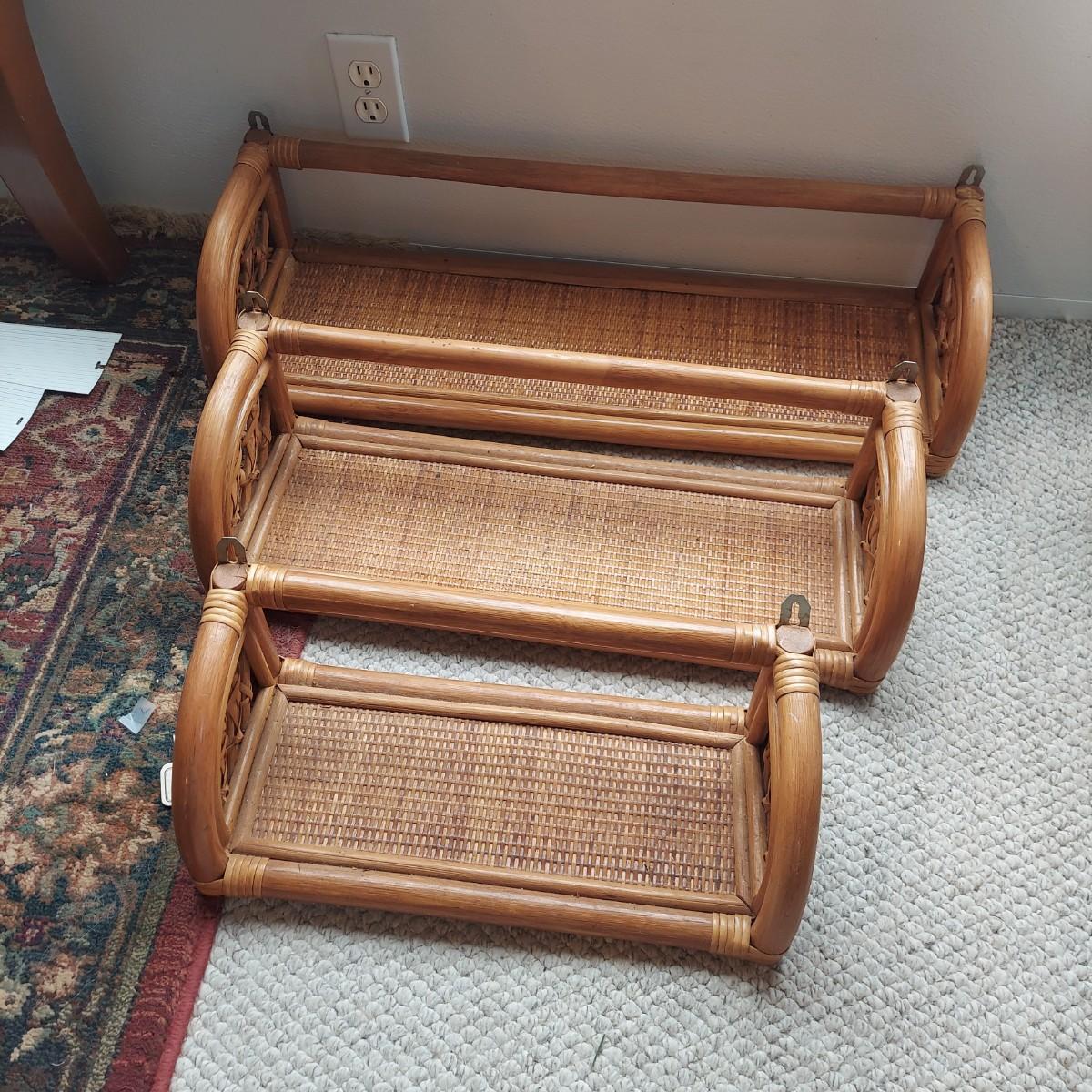 Four pieces of retro bamboo furniture and decor including a two-tier shelving unit, an ottoman with a removable cushion, three wall shelves and and magazine rack. The shelving unit measures 55” x 20” x 54"H. The ottoman is 27” x 24” with an 18"H seat height. The shelves are 18”, 24” & 30” long. Some condition issues. Please see photos for details. Local Pickup Only. Winning bidder must bring assistance to help move and load this item due to its weight and/or size.